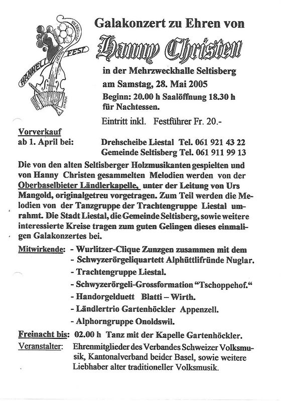 Heiss wars.............sehr heiss sogar in der Mehrzweckhalle in Seltisberg! Zum Andenken an Hanny Christen wurde ein grosser Gala-Abend organisiert, an dem nebst verschiedenen Musikformationen auch die Tanzgruppe der Trachtengruppe Liestal mitwirkte. "S'Muusig-Hanneli", wie Hanny Christen auch genannt wurde, sammelte zeitlebens rund 12000 Melodien und schrieb auch etliche Tänze auf. Aus diesem Fundus zeigten wir fünf Tänze: Bottmiger-Polka, Schnurante-Walzer, dr Letscht, Mazurca chattada und für e guete Räscht.Die OLK begleitete uns in gewohnt gekonnter Weise, ja sogar noch eine Spur virtuoser als sonst; ein Genuss!