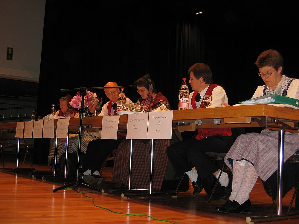 Dieses Jahr war die Trachtengruppe Sissach Organisator des Jahresbots, wie bei uns die Generalversammlung genannt wird. Knapp 130 Trachtenleute versammelten sich in der Mehrzweckhalle Bützenen. Eröffnet wurde der Abend mit dem Willkommensgruss durch den Sissacher Präsidenten Hanspeter Misteli sowie einem fröhlichen Lied des Trachtenchors. Sodann übernahm Monika Omlin als Präsidentin der kantonalen Trachtenvereinigung Baselland das Szepter und führte mit Routine durch die Traktandenliste. Als neuer Ersatzrevisor wurde Bruno Gschwind von der Trachtengruppe Laufental gewählt. Beim Punkt „Verschiedenes“ ging es u.a. darum, ob wir nächstes Jahr unseren Trachtensonntag ins Kulturfest von Laufen vom 27. August integrieren oder ob wir angesichts des sehr reich befrachteten Kalenders auf einen Trachtensonntag verzichten. Eine Mehrheit entschied sich für Verzichten, womit 2006 kein Trachtensonntag stattfindet. Im Hinblick auf die am 24./25. Juni in Basel stattfindende schweizerische Delegiertenversammlung gab Peter Breu als im OK für das Ressort „Messe/Verpflegung/Personal“ Verantwortlicher einen Überblick über die von uns an diesem Wochenende zu leistenden Arbeiten. Insgesamt sind rund 360 Arbeitseinsätze erforderlich. Er appellierte an die Solidarität aller Baselbieter Trachtenleute, sich dieses Datum freizuhalten und mitzuhelfen.