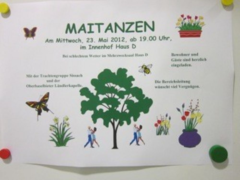 Am Mittwoch, 23. Mai 2012, fand im Kantonalen Altersheim in Liestal das Maitanzen statt. Zur musikalischen Begleitung der Oberbaselbieter Ländlerkapelle, welche seit Anfang an dabei ist und mit ihrem musikalischen Können alle mitreissen kann. Zusammen konnten wir sieben Tänze vorführen. Mit dem letzten Tanz, einem Alewander durften alle HeimbewohnerInnen und das ganze Personal samt Leitung mit uns zusammen einstehen und in den schönen Frühsommerabend hinein tanzen.