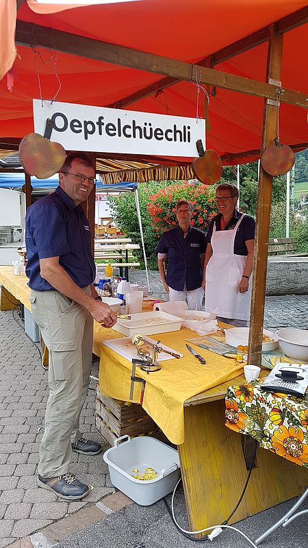 Am Samstag den 24. 8 nahmen wir zum ersten Mal am Dorfgassmärt in Niederdorf teil. Wir verkauften Oepfelchüechli. Nachdem die beiden Stände und das Zelt mit den Tischen aufgestellt waren ging es ans Einrichten des Standes. Wo kommt was am besten hin? Auch die Herstellung des Bierteiges und die Anfertigung der Vanillesauce musste erklärt werden, sowie der Umgang mit der Friteuse. Unsere Oepfelchüechli und auch der Kaffee fanden ziemlich Anklang. Dank den kühleren Temperaturen hatten wir gegen Nachmittag alles bereits verkauft und es musste für Nachschub gesorgt werden. Insgesammt für uns eine gelungene Sache, da wir uns im Dorf zeigen können. Grosser Dank an, alle welche am Stand mitgeholfen haben. Speziell danken möchte ich Annemarie und Rolf für die gute Organisation, der Mithilfe vor Ort und Aufbewahren des Materials.