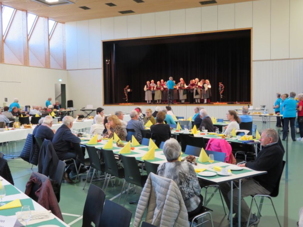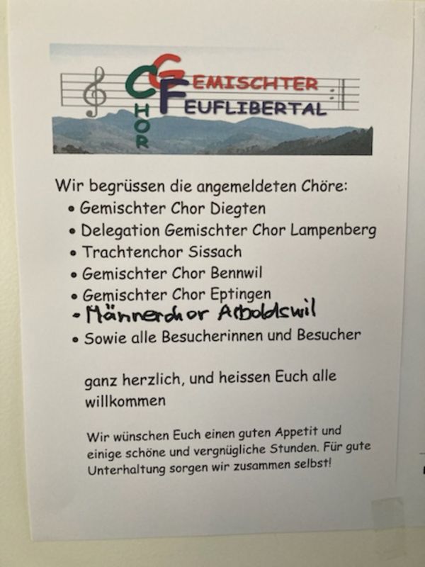 An diesem Sonntag lud der Gemischte-Chor Feuflibertal zu einem Apéro mit musikalischer Unterhaltung ein. Da unser Dirigent Thomas Herrmann gleichzeitig auch der genannte Chor aus Bubendorf dirigiert, wurde der Trachtenchor mit seinen Liedbeiträgen dazu eingeladen. Insgesamt sieben Chöre aus dem Oberbaselbiet waren mit Liedern aus ihrem Repétoire vertreten. Vom Gemischten-Chor Feuflibertal wurde uns ein reichhaltiges Apérobüffet angeboten, dem wir gerne zu sagten. Zum Abschluss gab es noch einen gemeinsamen Chorauftritt mit dem Feuflibertal- und Trachtenchor. Nach der langen Corona bedingten "Pause" war das ein willkommener Anlass.