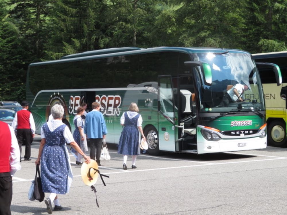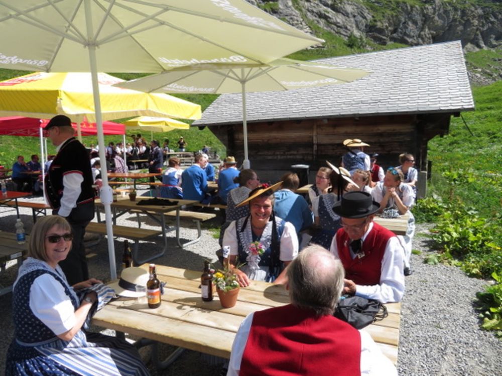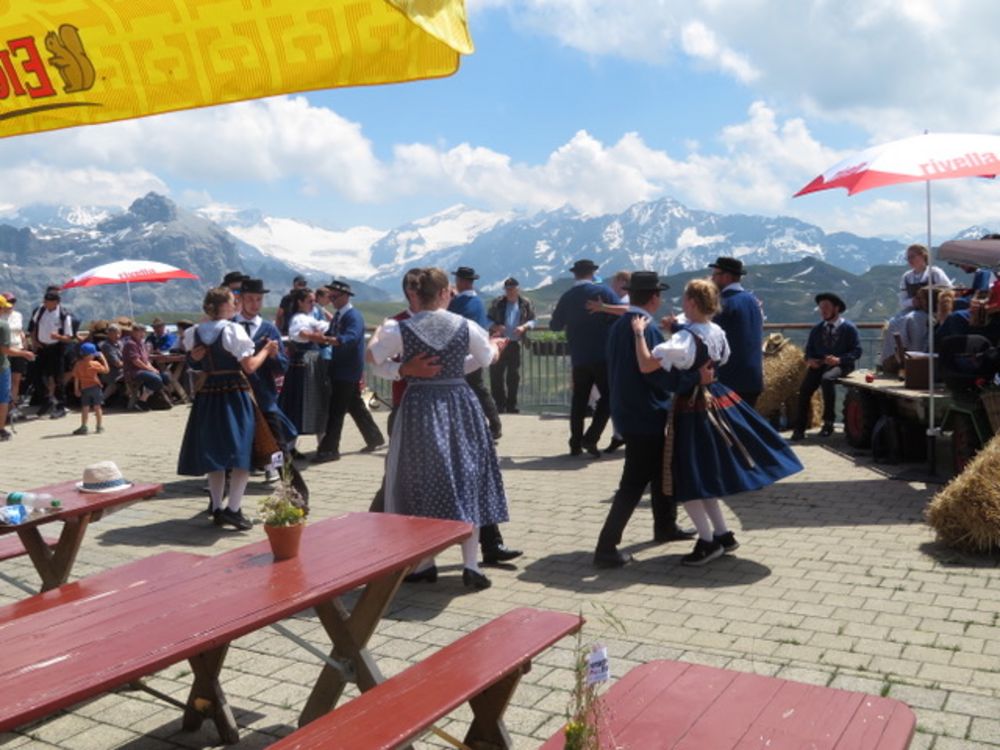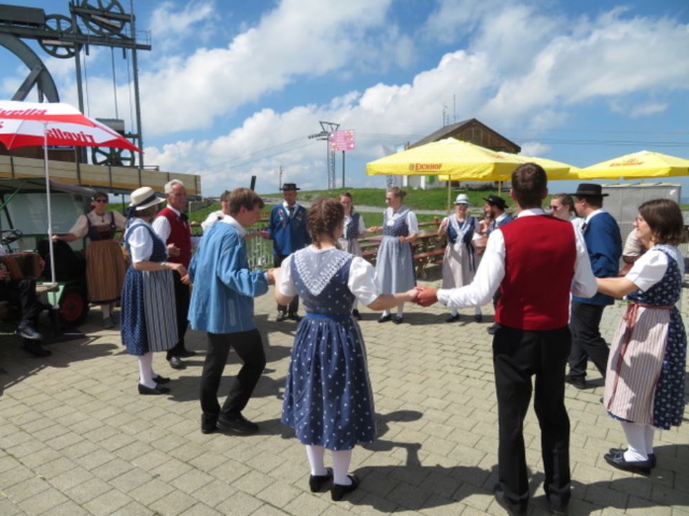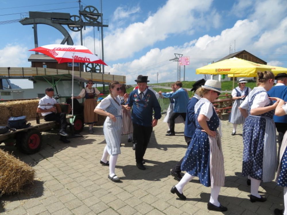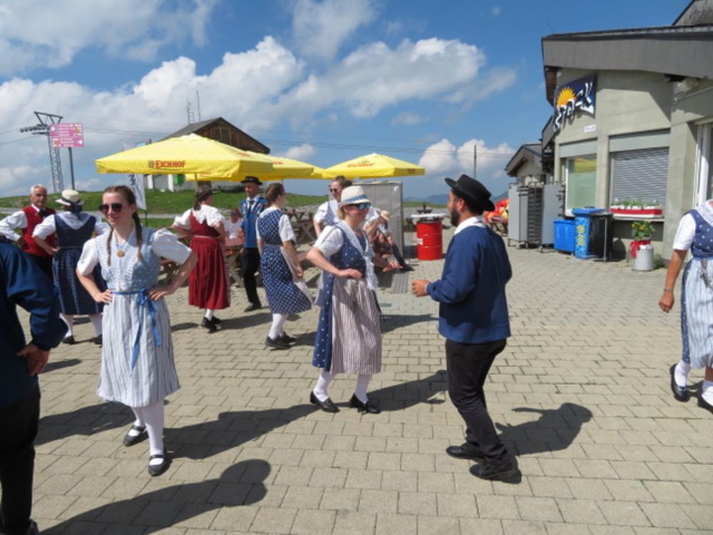 Am Sonntag, 25. Juni versammelten wir uns um 08.00 Uhr beim Tannenbrunn Parkplatz und fuhren mit dem Sägesser Car zur Stöckalp/Melchsee Frutt wo das Innerschweizer Trachtenfest stattfand. An sechs Plätzen rund um den See wurde an diesem herrlichen und sonnigen Sonntag, nach dem Motto der Trachtengruppe Sarnen "Tanzen und Frehlich sy", getanzt und musiziert. Nach dem Mittagessen fuhren wir mit der Gondelbahn spontan noch auf den 2170m hohen Bonistock wo die "Trachtä – Musig Sachseln" spielte. Um 16.30 Uhr wollten wir dann so langsam wieder zur Melchsee Frutt hinunter fahren. Die Gondelbahn hatte aber dann ein kleines technisches Problem, was für uns aber weiter nicht störte, konnten wir doch noch ein paar Tänze vorführen.