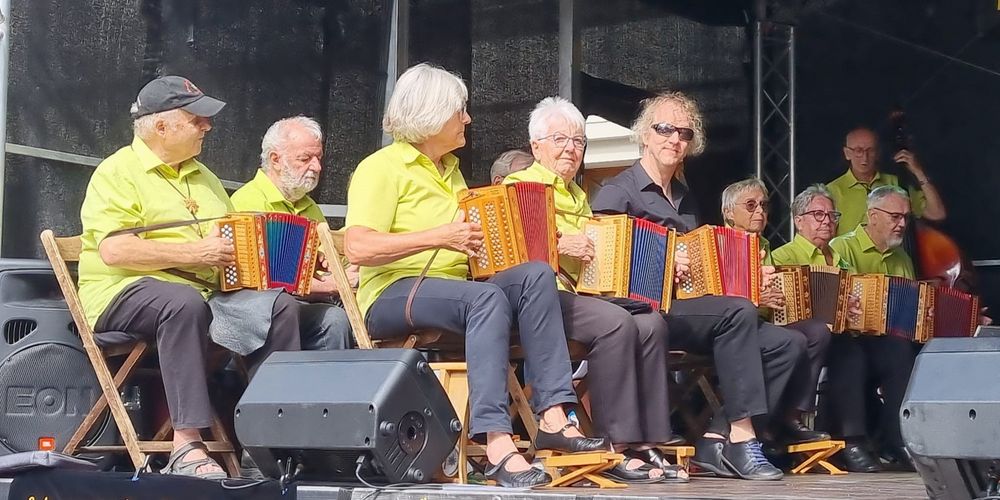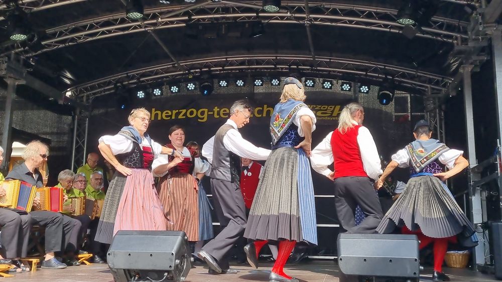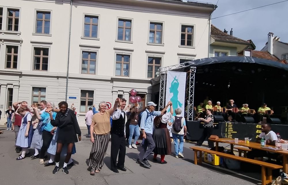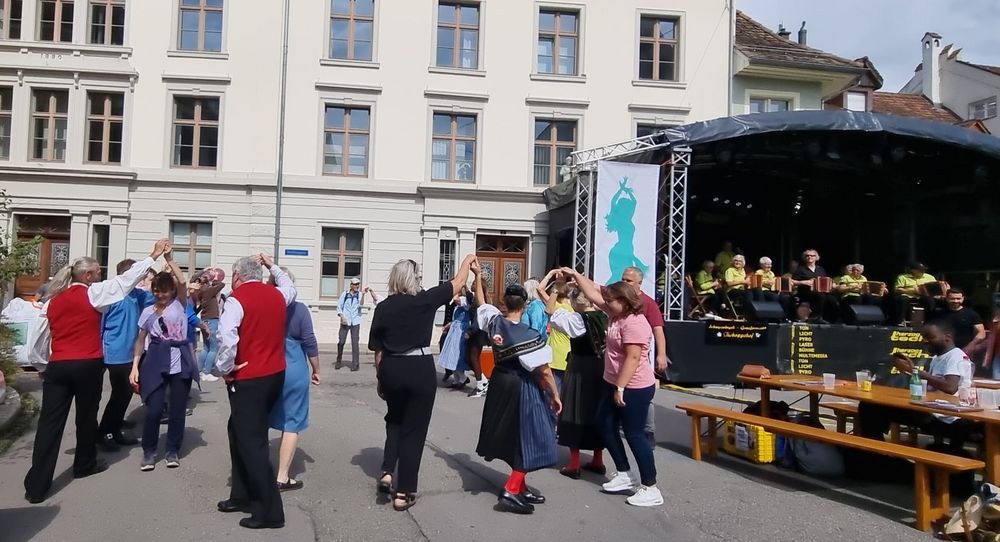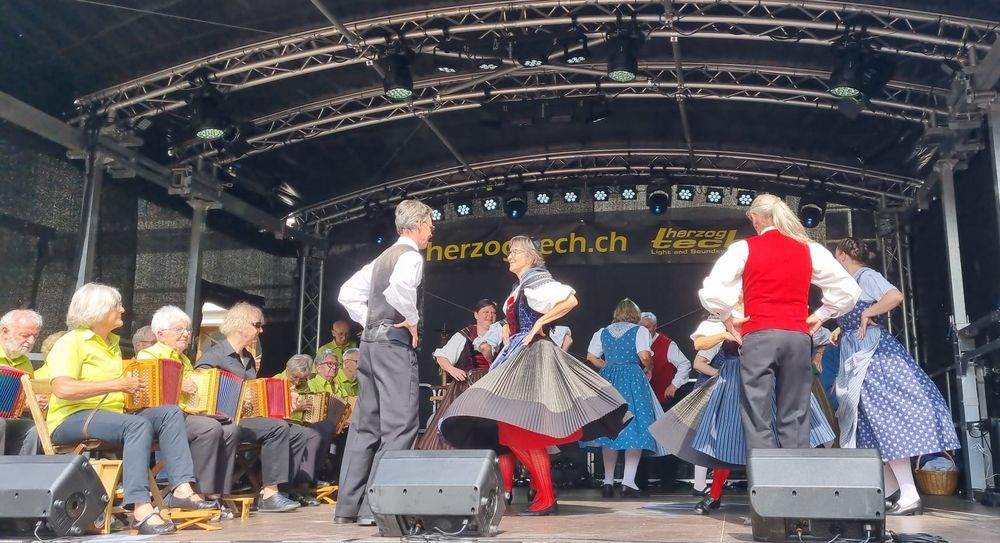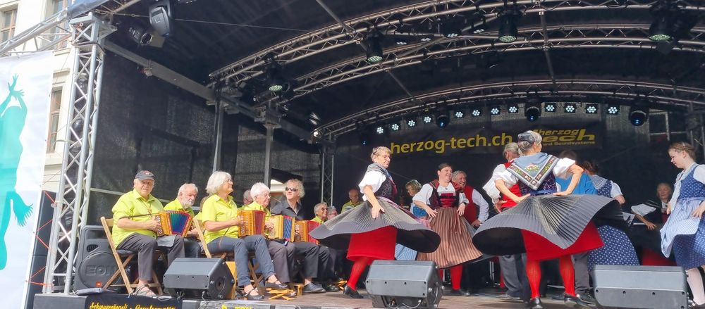 Fand in Liestal statt, und wir waren dort mit Singen und Tanzen aktiv dabei, das Wetter war perfekt, Sonnenschein aber nicht zu heiss. Am Morgen hatte unsere Tanzgruppe mit Unterstützung von anderen Gruppen aus dem Kanton BL ihren Auftritt auf der Bühne auf dem Zeughausplatz. Die Schwyzerörgeli Grossformation vom Tschoppenhof begleitete die Tanzpaare musikalisch bei allen Tänzen.Das war mal eine andere Art die Volkstänze zu begleiten, aber es war sehr toll. Dem Publikum hat es gefallen und es gab grossen Applaus. Ganz am Schluss hat Marianne Imhof unsere Tanzleiterin, noch das Publikum aufgefordert zum Mittanzen. Der Aufforderung sind viele gefolgt und neben der Bühne gab es einen grossen Kreis mit tanzenden Leuten. Alle hatten grosse Freude und das alles mit Schwyzerörgeli Begleitung, einfach super.