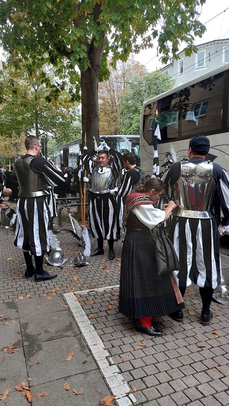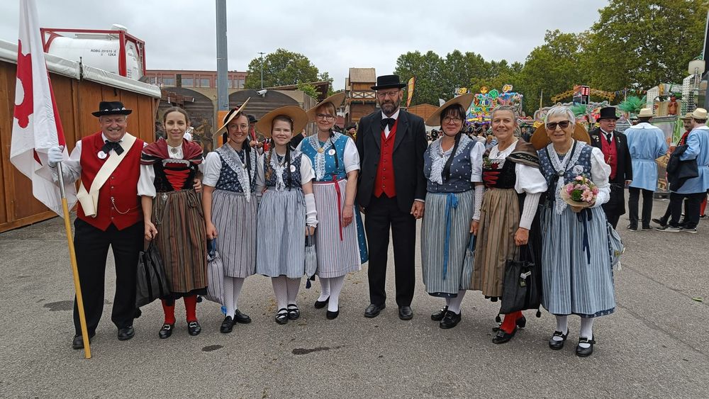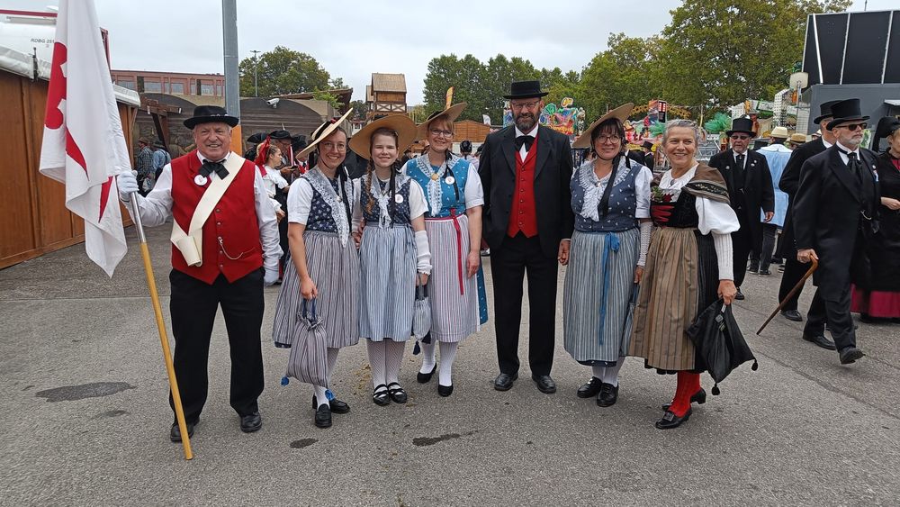 Pünktlich fuhr der Bus los und nach einem Kaffeehalt und einem kurzen Stau waren wir Frühzeitig in Stuttgart. Wir begaben uns zum Sammelplatz, wo sich nach und nach alle Gruppen aus mit dem Dreiländereck einfanden. Die Basler Garde, die „Naarebainli“ Der Trachtenverband Basel-Stadt, die Hebelmusik Hausen, die Markgräfler Trachtengruppe und die Elsässische Trachtengruppe „Sundgauvia“ So kam eine stattliche Gruppe mit über 200 Teilnehmenden zusammen. Schon setzte sich die Gruppe in Bewegung und wir waren mitten im Umzug. Wir wurden von den massenhaft anwesenden Zuschauern über die ganze Umzugsroute beklatscht und genossen die tolle Stimmung - und schon waren wir auf dem Festplatz. Vorbei an den Festzelten endete der Umzug am Ende des Platzes.
