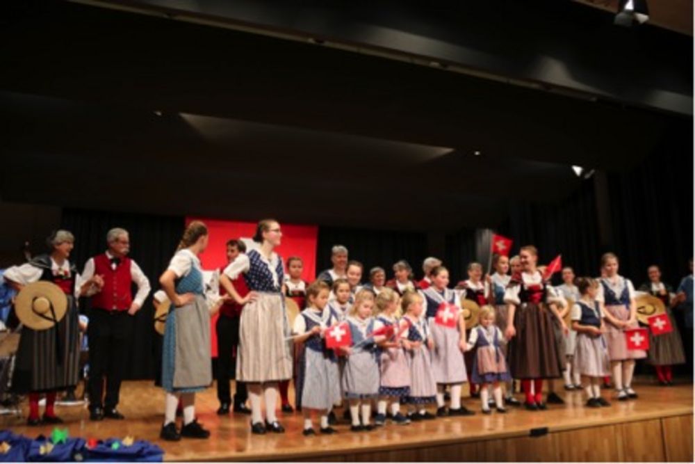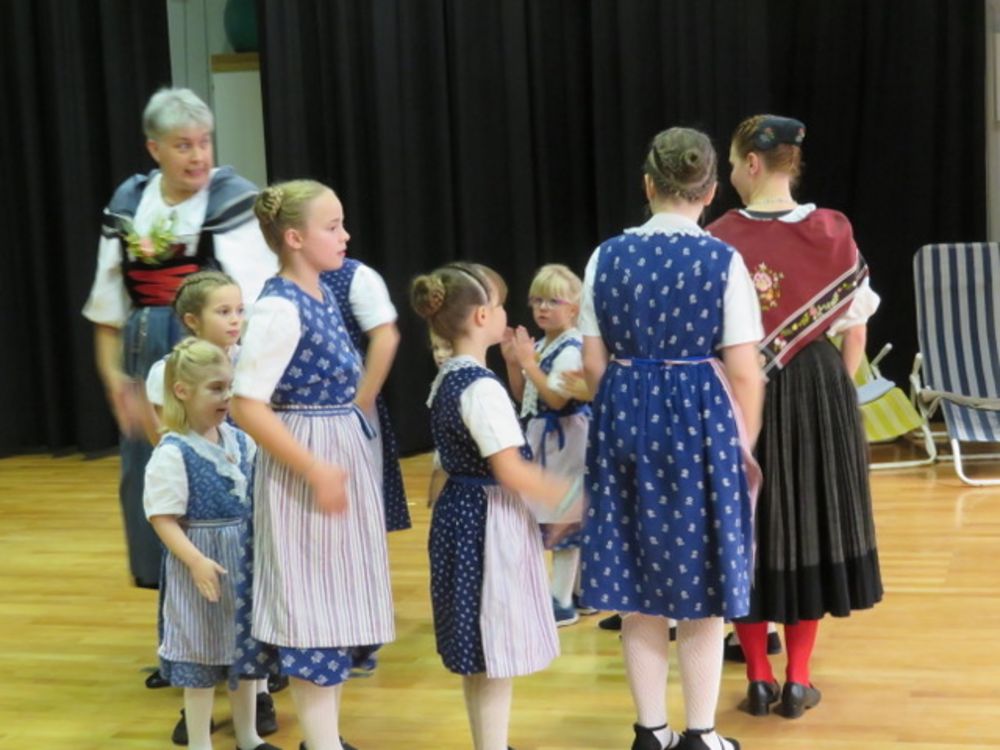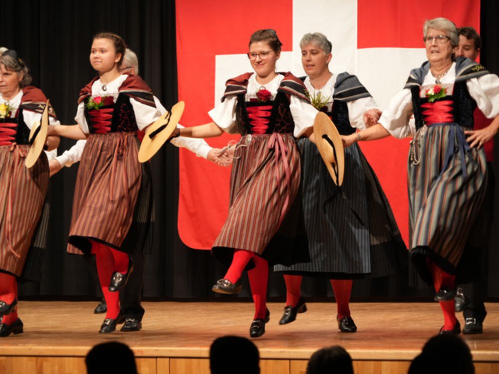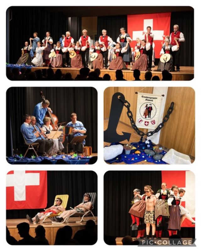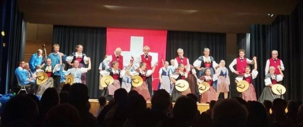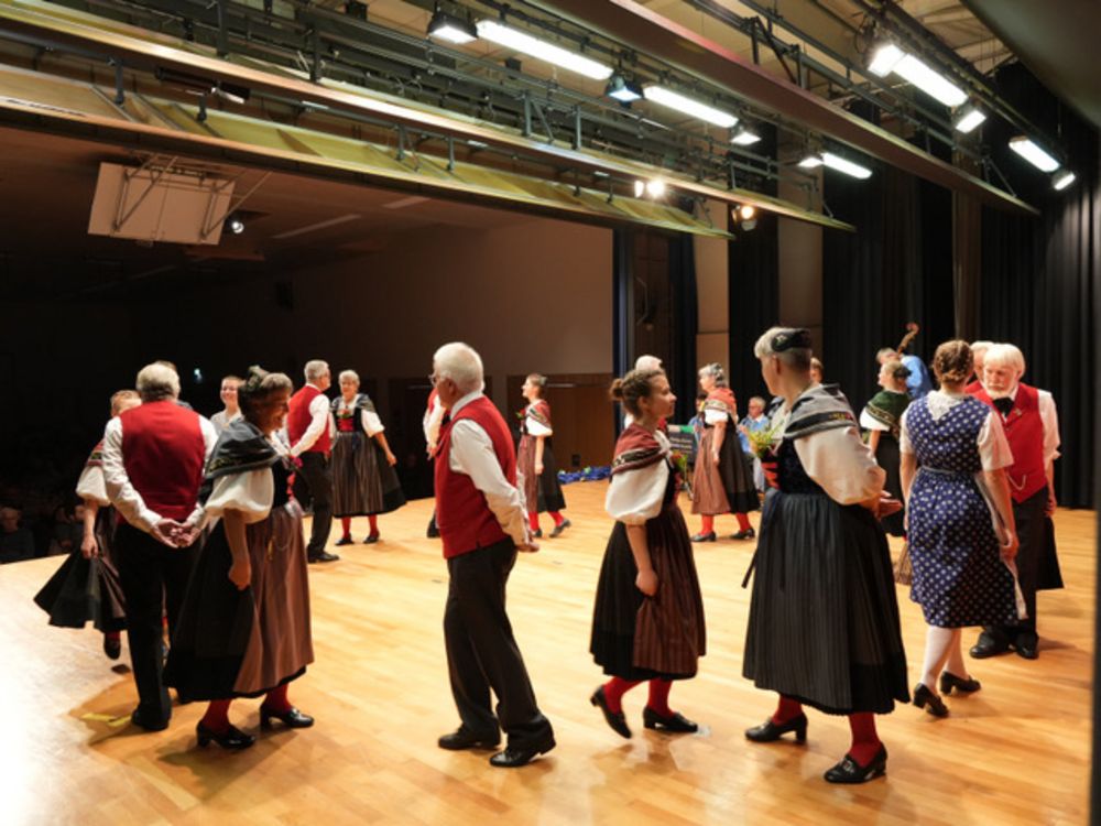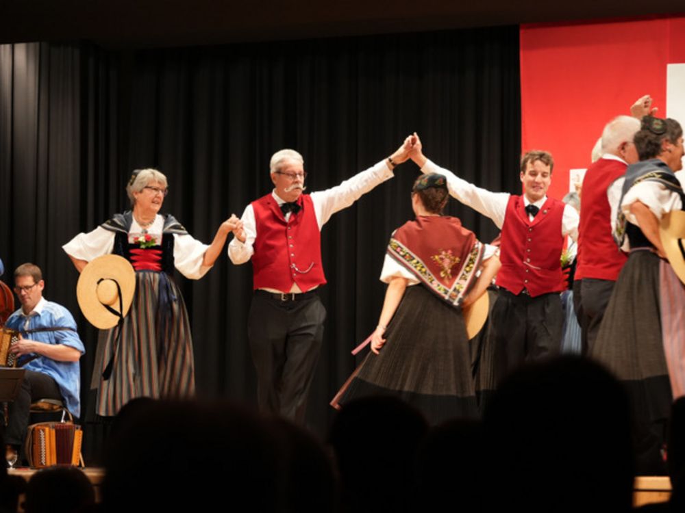 Am Samstagabend durften wir unsere eingeübten Tänze in Sissach am Heimatabend 2023 in der vollbesetzten Bützenenhalle zum Besten geben. Zum ersten Mal tanzten wir mit drei Altersgruppen, nämlich den Kindern, den Jugendlichen und den Erwachsenen. Die Begleitmusik dazu spielte die Oberbaselbieter Ländlerkappelle wie immer in gekonnter Weise und locker vom Hocker. Sie bringen es immer wieder fertig uns Tanzende mit ihrer Musik mitzureissen, so dass es aussieht wie wenn das Tanzen das einfachste der Welt wäre. Gesamthaft konnten wir neun Tänze aufführen. Es ist natürlich schön wenn man mit acht bis zehn Tanzpaaren auftreten kann. Zum Schluss des ersten Teils tanzten wir "d’Murteloube". Dieser Tanz weiss mit den Figuren immer wieder zu überraschen. Ganz am Schluss sind nämlich alle Aktiven an der Bühnenkante, die Frauen vor den Männern, auf dem linken Knie und in der rechten Hand den Trachtenhut. Ein wunderbares Schlussbild.