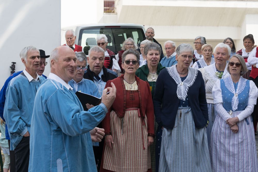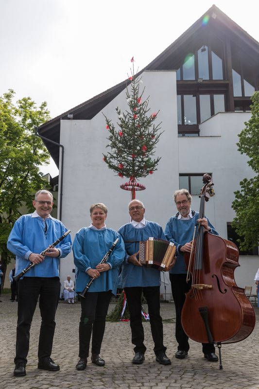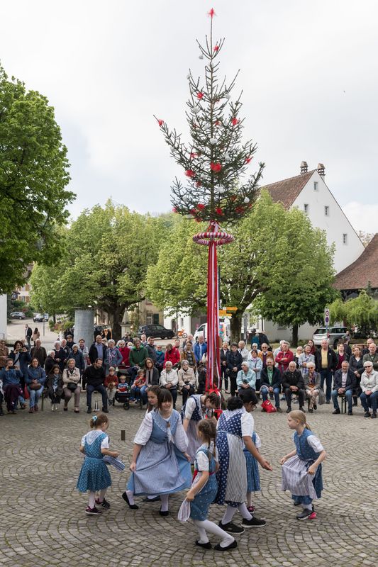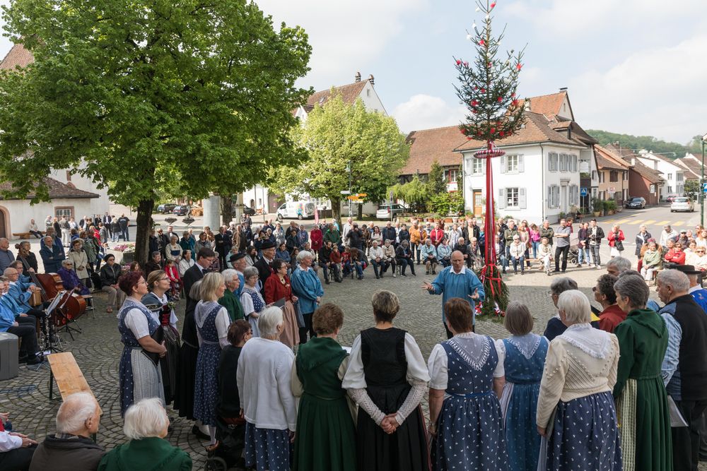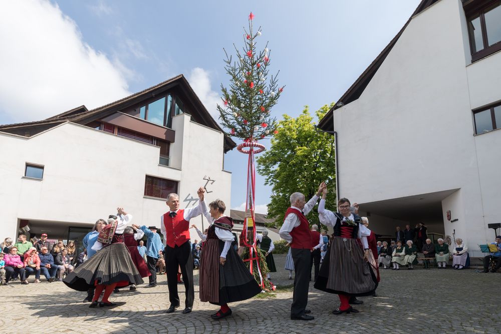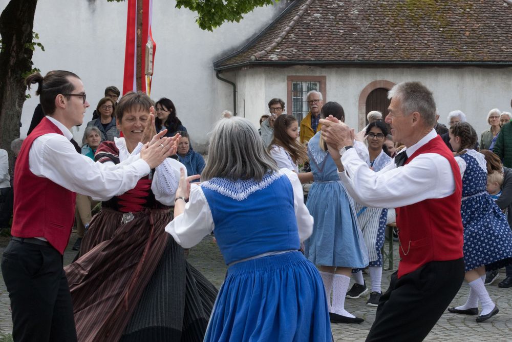 Endlich konnten die Trachtenleute der Gruppen Pratteln, Muttenz und die Kinder der Gruppe Birsfelden / Muttenz nach zweijähriger Zwangspause wieder einmal ein Maisingen- und Tanzen geniessen. Der Wettergott war dem Anlass wohl gesonnen und die Präsidentin der Trachtengruppe Muttenz konnte eine grosse Besucherschar begrüssen. Die vier Kindertanzpaare der Kindertanzgruppe Muttenz / Birsfelden unter der Leitung von Celine und Larissa Gerber verstanden es, die Zuschauer zu begeistern mit ihren Tänzen. Der Trachtenchor Pratteln unter der Leitung von Stefan Kälin nahm das Publikum mit auf eine gesangliche Reise in eine heile und gesunde Welt. Die Tänzerinnen und Tänzer der Trachtengruppe Muttenz unter der Leitung von Karin Geitz zeigten, dass sie das Tanzen in den letzten zwei Jahren nicht verlernt haben, sogar der Bändertanz rund um den Maibaum gelang auf Anhieb. Begleitet und umrahmt wurde der schöne Anlass von der Ländlerkapelle Wartenberg, die bis anhin unter der Leitung von Thomas Diethelm stand. Nach siebzehn Jahren mit unzähligen Auftritten war dies heute sein letztes Aufspielen für die Trachtengruppe Muttenz. Mit einem guten Tropfen aus dem Muttenzer Weinberg wird er verabschiedet. Fürs Publikum gab es zwar keinen Wein, dafür wurden ihm selbstgebackene Gutzi aller Arten angeboten. Offensichtlich haben sie gemundet, die Körbe waren auf alle Fälle schnell leer.