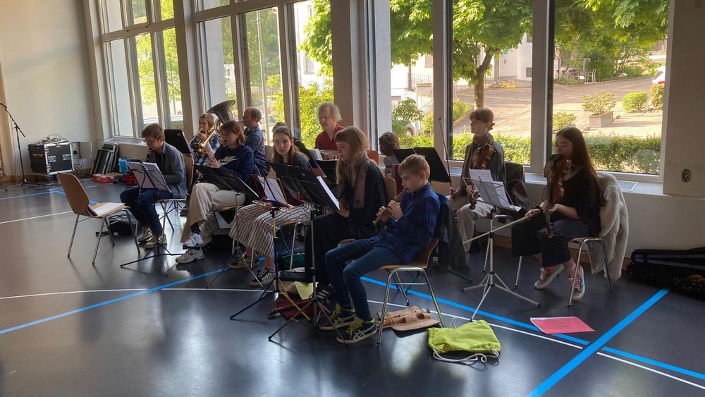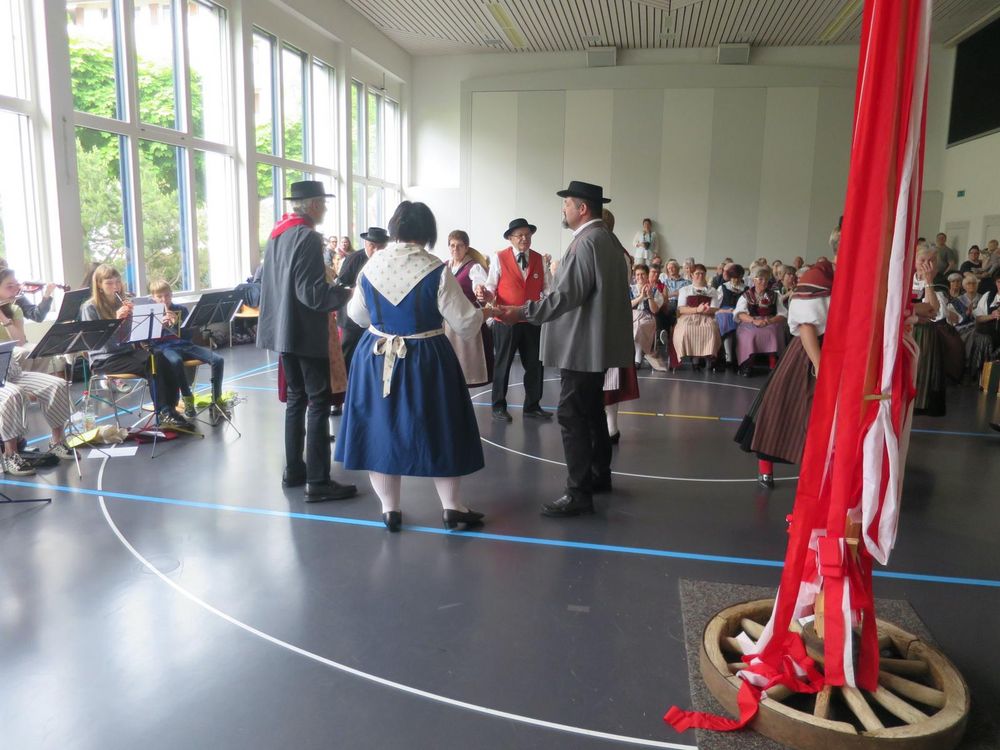 Wegen unsicherer Witterung verlegten wir den Anlass in die Turnhalle.Mit dem “Valser da Men Hofmeister“, einem Stück aus dem Engadin, stimmte uns Simon Dettwiler mit seiner 10 köpfigen Kapelle aus 11 – 19 jährigen, spielfreudigen Kindern und Jugendlichen auf das Maitanzen ein, begleitet am Blechbass von Hannes Fankhauser.