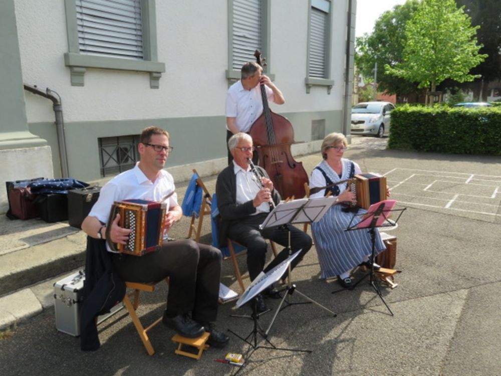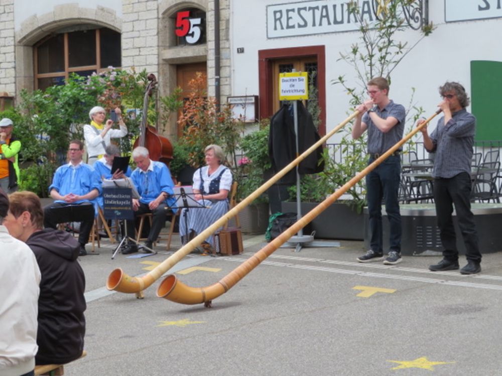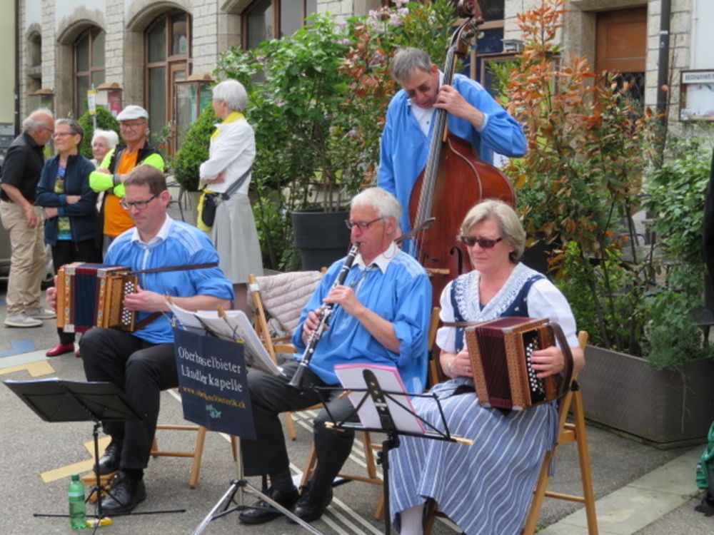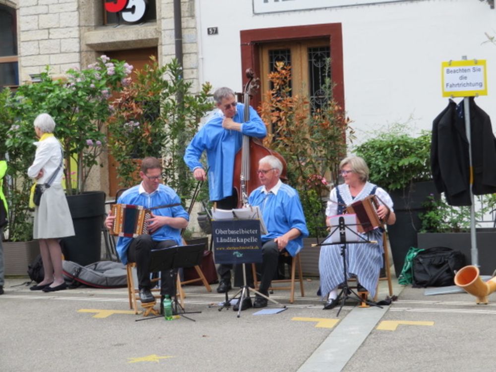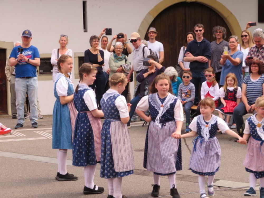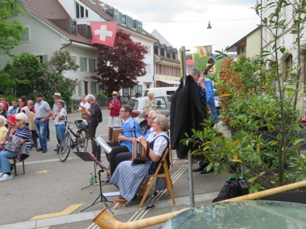 Schon die ganze Woche vor dem Anlass herrschte Aprilwetter mit abwechselnd Regen und Sonnenschein. Am Sonntagmorgen war die Frage, bis wann wird es trocken bleiben. Genaues wusste niemand, so dass wir beschlossen in der Begegnungszone zu tanzen. Auf jeden Fall volles Risiko. Der Wettergott hatte ein Einsehen mit uns und öffnete die Schleusen erst nach dem letzten Ton der Oberbaselbieter Ländlerkapelle. Um 13.30 Uhr tanzten die Kinder noch beim Heimatmuseum.