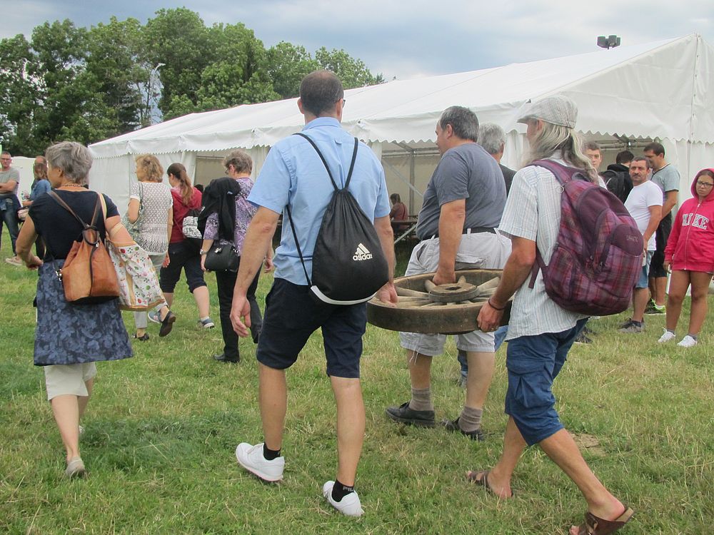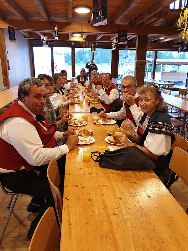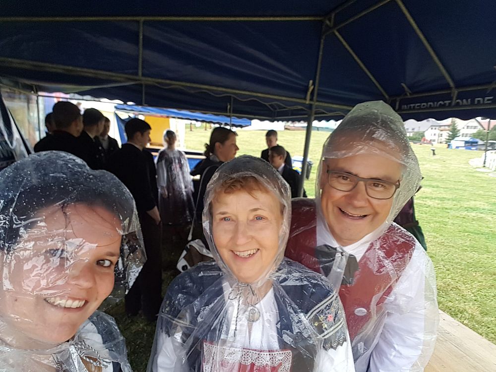 Also, sind am Freitag Nachmittag 15 Tänzerinnen und Tänzer mit dem Kleinbus ab Lausen in die Freiberge aufgebrochen. Mit dem nötigen Gepäck im Laderaum. Ein altes Wagenrad als Ständer für den Maibaum, die rot und weissen Bändel, dem Eierkranz, unseren persönlichen Koffer und natürlich die Baselbieter Trachten. Wir sind angenehm gereist und am frühen Abend bei unserer Unterkunft in Les Mottes angekommen. Nach kurzer Rast und Einrichten ging es gleich weiter zum 7 km entfernten Festplatz von Saignelégier.