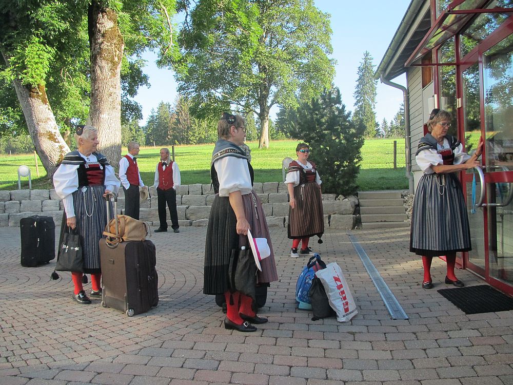 Da wartete unsere Mai-Tanne, die wir für den Anlass noch vorbereiten mussten. Etwas irritiert über das eher schwache Bäumchen kam es zu Diskussionen unter den Baselbieter Tänzern. Nachdem wir aber unser z`Nacht eingenommen hatten, machten wir uns an die Arbeit und richteten dann doch ein schmuckes Maibäumchen daraus. Danach fuhren wir, mit zwei Bus-Taxi zu unserer Unterkunft zurück zur allgemein willkommenen Nachtruhe. Mussten wir doch fit sein für die folgenden zwei Tage.