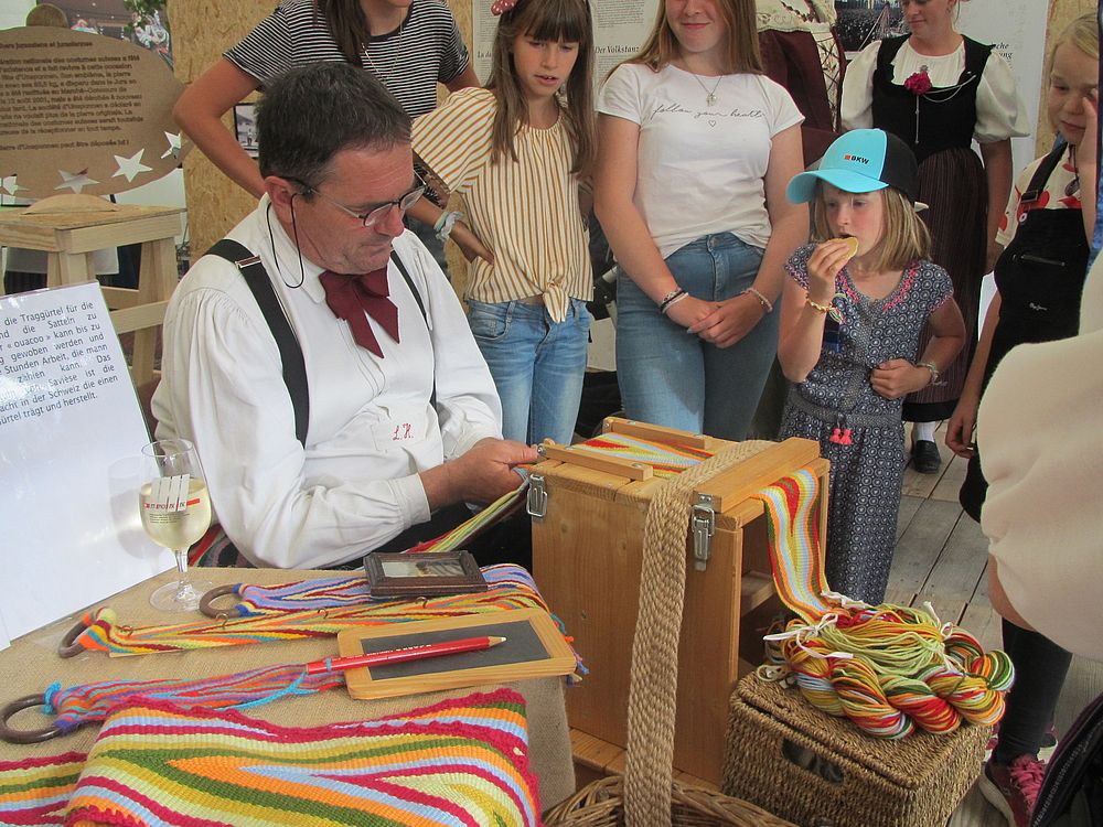 Der Präsentationsstand der STV war attraktiv mit Personal und Informationen rund um deren Aktivitäten gestaltet. Und mit vor Ort gezeigtem Trachtenhandwerk wie Klöppeln und Knüpfen von Trachtenutensilien. Die STV zeigte sich nicht in einem einfachen Marktstand sondern in einem schönen Holzständerbau in zwei Teilen für die Info und einer Bühne für Musiker und Tänzer.