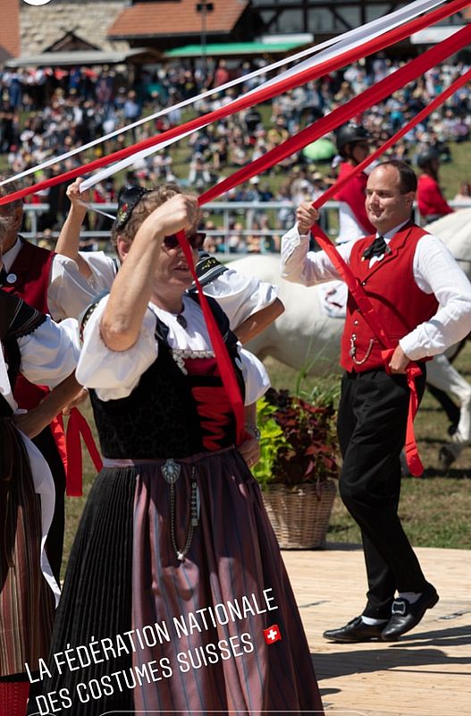 Das Mittagessen war bereit und wir waren bereit für den Nachmittag. Und wie auf Bestellung wichen die Wolken und gaben den Himmel frei für die Sonne. Beste Bedingungen für den Ernstfall. “Le Grand Spectacle“ auf der Esplanade bestand aus den aufeinander folgenden Auftritten der Jugendgruppe Sense aus dem Freiburgischen, der Trachtenvereinigung Appenzell Ausserrhoden, der Trachtengruppe Küssnacht und uns Baselbietern. Zeitpunkt genau wurde unser geschmückter und bebänderter Mai-Baum von den Helfern auf die Bühne gestellt. Wir machten vor vielem Publikum dem Bäumchen alle Ehre und flochten ein umso schöneres Geflecht um das Stämmchen. Danach umreigten wir den Maibaum mit der “Wäschbiblog“. Dabei wurden wir von 26 Reiterinnen in den jeweiligen Kantonstrachten gekleidet in einer Choreographie begleitet. Jedes Pferd trug eines der 26 Kantonswappen auf der Kruppe hinter dem Sattel. Der Höhepunkt machte dann die darauf folgende Quadrille. Bei der alle vier Trachtengruppen auf der Esplanade verteilt und acht berittene Freiberger zusammen die Choreographie synchron vorführten. Mit den 26 Kantonsreiterinnen im Hintergrund wohl ein einzigartiges Erlebnis.