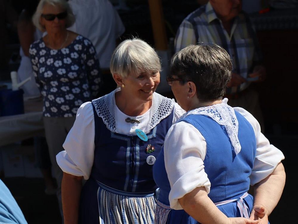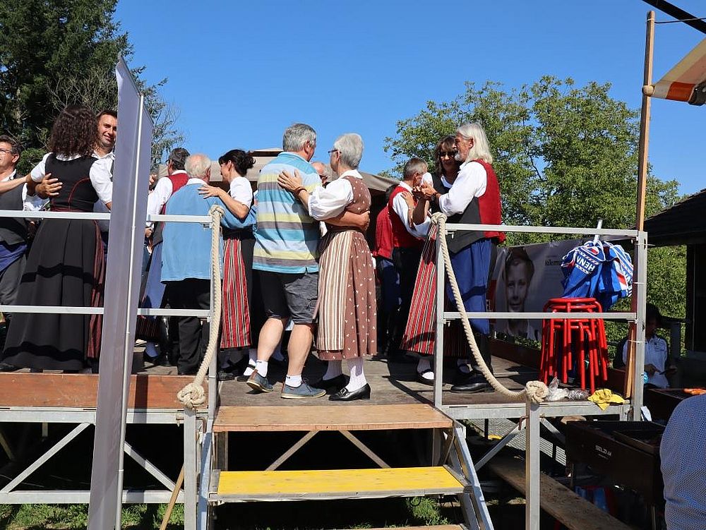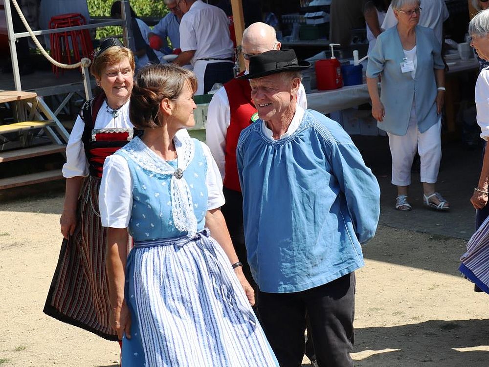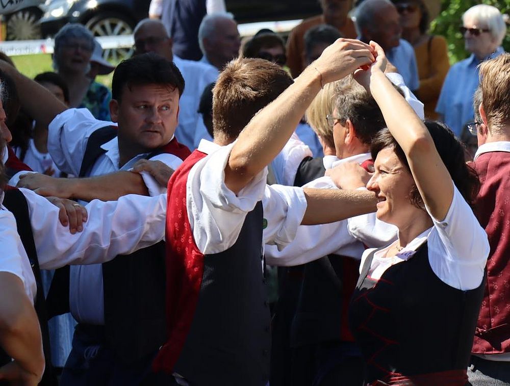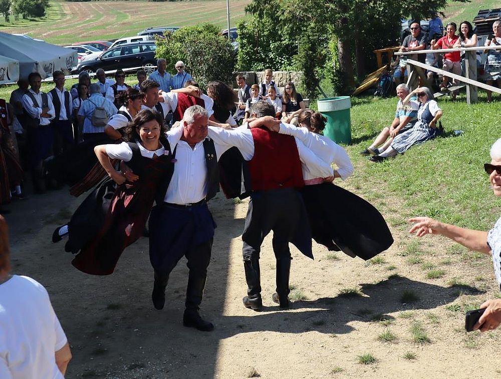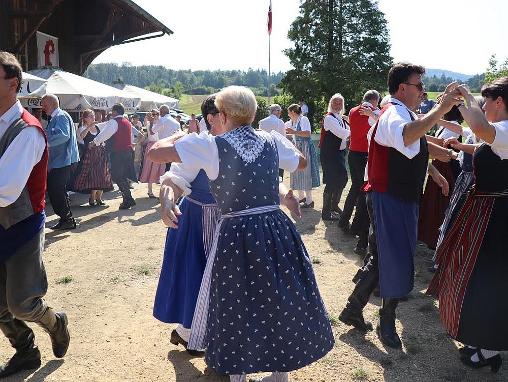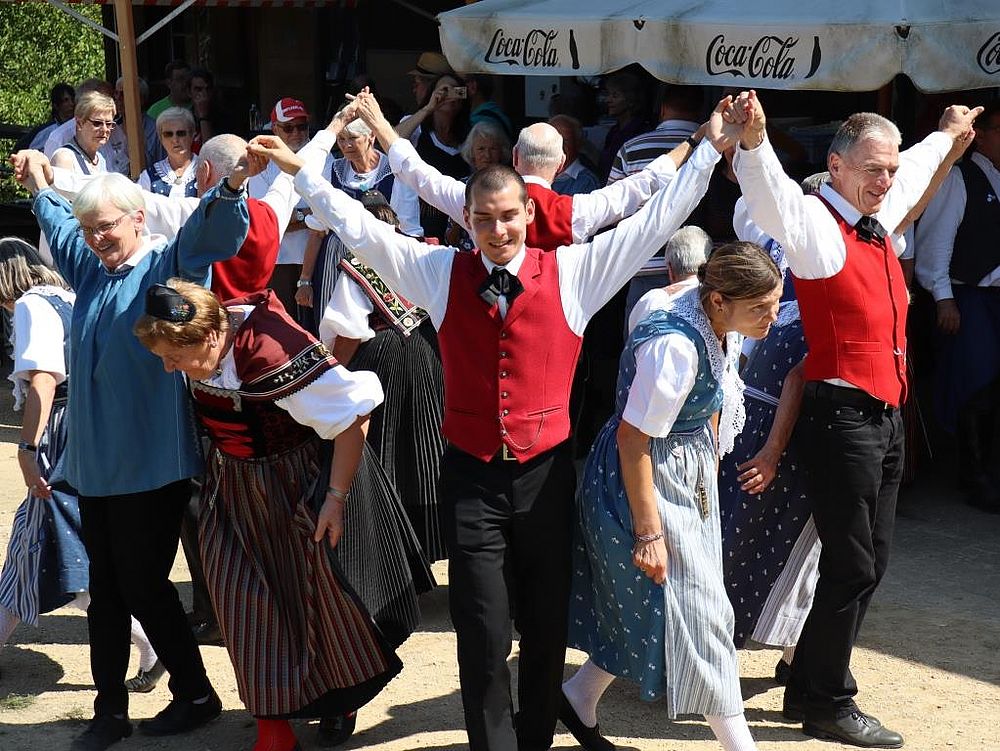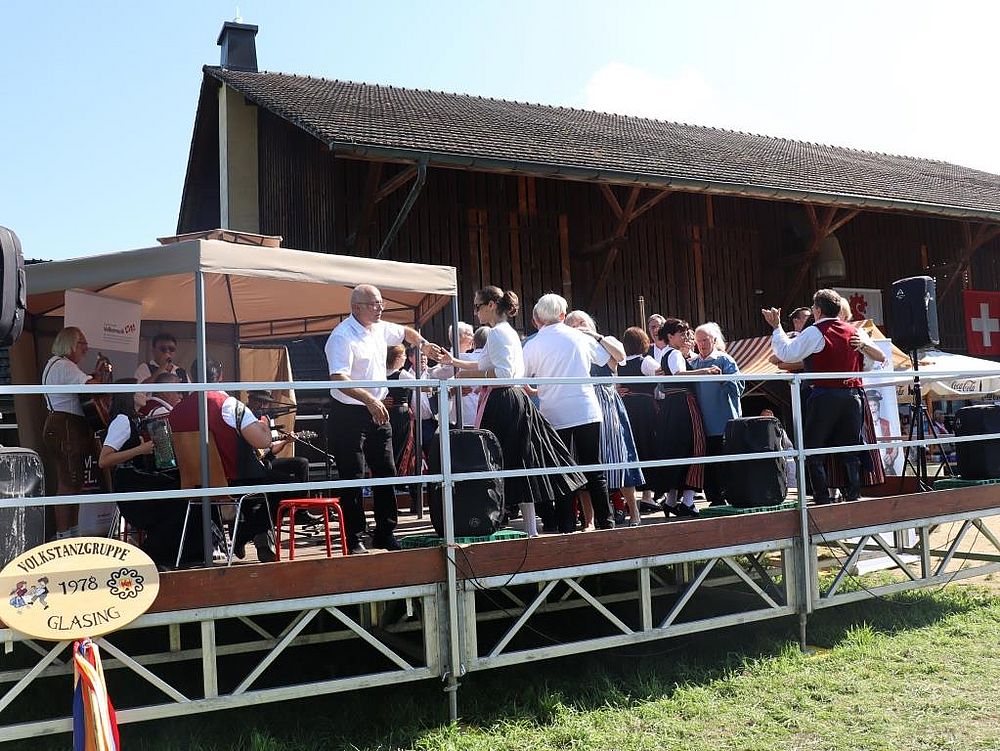 Sonntags geht es schon früh los, punkt 9 Uhr fährt der Car wortwörtlich mit Sack und Pack und wieder mit der Begleitung von Sämi und Susi I. zur Sichtern. Dort ist Chornschüüre-Stubete des VSV, die um 10 Uhr mit einem Gottesdienst im Freien beginnt. Heute sind wir alle in der Tracht unterwegs, haben doch beide Gruppen einen Auftritt an diesem Anlass. Unsere Gäste zeigen ein gut 30 minütiges Programm, bei dem es „wild“ zu und her geht und die Stimmung unter den Gästen, entsprechend den Temperaturen, ziemlich angeheizt wird. Da kommt unser Auftritt, begleitet von der Ländlerkapelle Wartebärg, eher bescheiden daher. Wenn ich die zwei Tanzstiele miteinander vergleiche, fällt mir auf, dass die “Glasinger“ sehr viel Oberkörperarbeit leisten und die Schritte eher einfacher sind, wogegen unsere Schrittfolge anspruchsvoller zu sein scheint, aber der Oberkörper nicht so gefordert wird. Nebst viel Örgelimusik sind diese Tanzeinlagen eine willkommene Abwechslung für die Anwesenden. Die Musik der Österreicher spielt auch zum freien Tanzen auf, was rege genutzt wird von vielen Besuchern. Kurz entschlossen entscheiden die beiden Tanzleiterinnen Elke und Karin, zwei gemeinsame Tänze zu zeigen (“Walzer us der Rosezyt“ und “Polka d’Echallens“) und wir Muttenzer tanzen zu den Klängen der Schwyzerörgeli-Grossformation Basel “Im Örgelihuus“. Das tolle Wochenende neigt sich dem Ende entgegen, Raphi fährt diejenigen, die mit dem Flugzeug heimkehren, zum Flughafen und kommt mit der Reiseverpflegung für im Bus retour. Langsam werden Trachten gegen leichte Reisebekleidung getauscht, auch ein Bad im Brunnen genommen, nochmals etwas gegessen und getrunken und dann kommt schon das Abschiednehmen. Kaum zu glauben, dass das nach nur drei Tagen so schwer fallen kann. In der Hoffnung auf ein Wiedersehen, wo auch immer, steigen unsere Freunde in den Car und fahren müde und überwältigt von all den Eindrücken und begleitet von unserem und dem Winken des Chornschüüre Teams Richtung Liestal und dann wohl der Heimat entgegen. Auch wir machen uns auf in Richtung Muttenz; kurz entschlossen gehen wir noch Essen und lassen den Abend gemeinsam ausklingen.