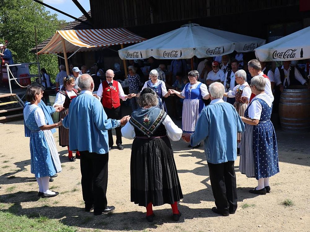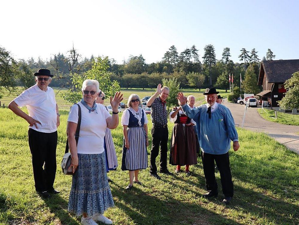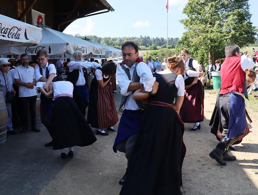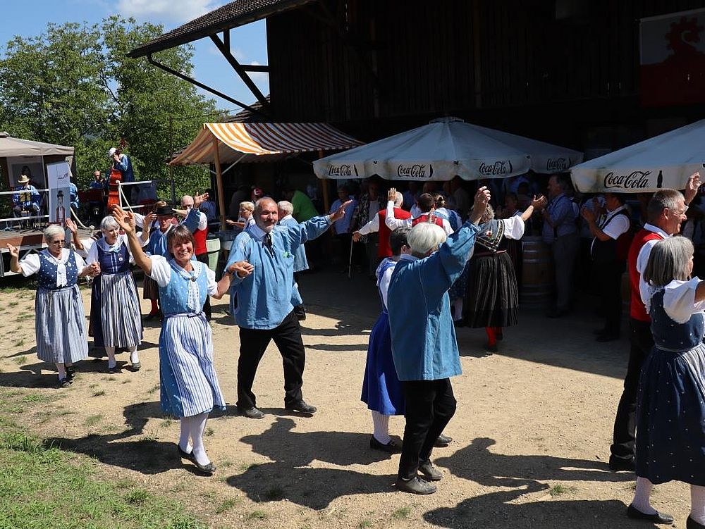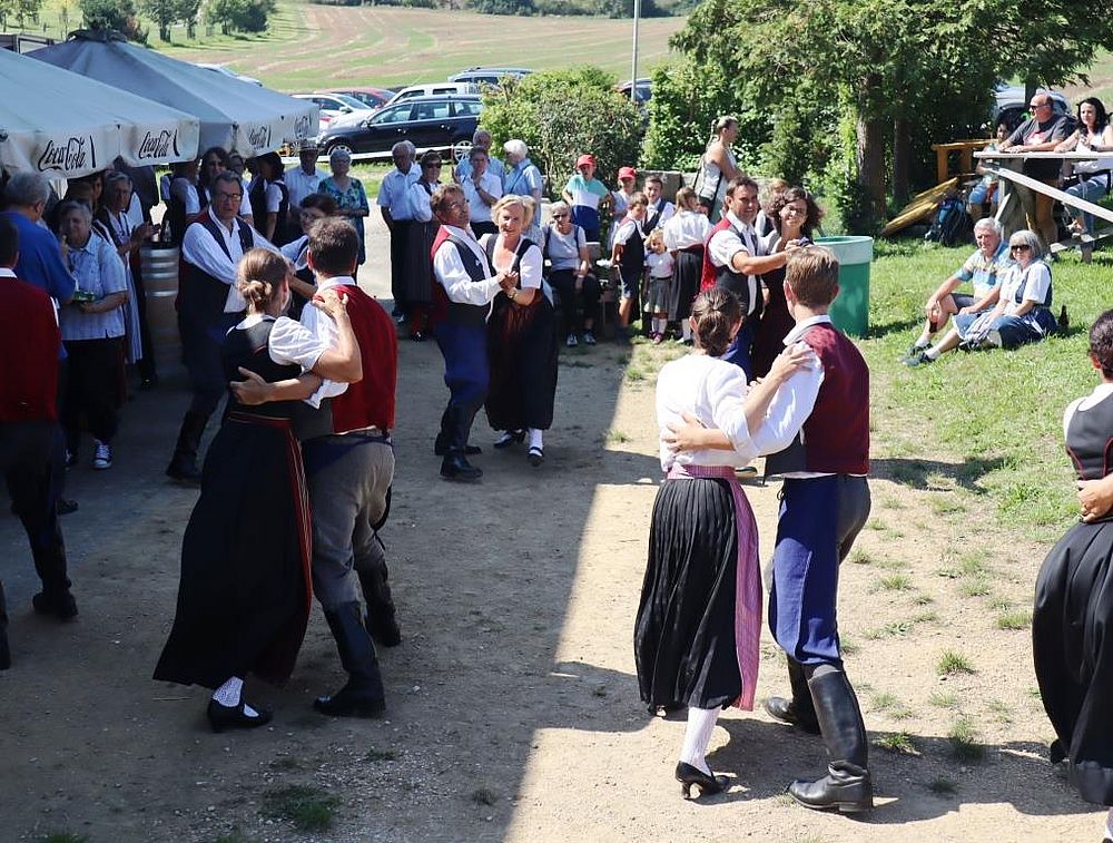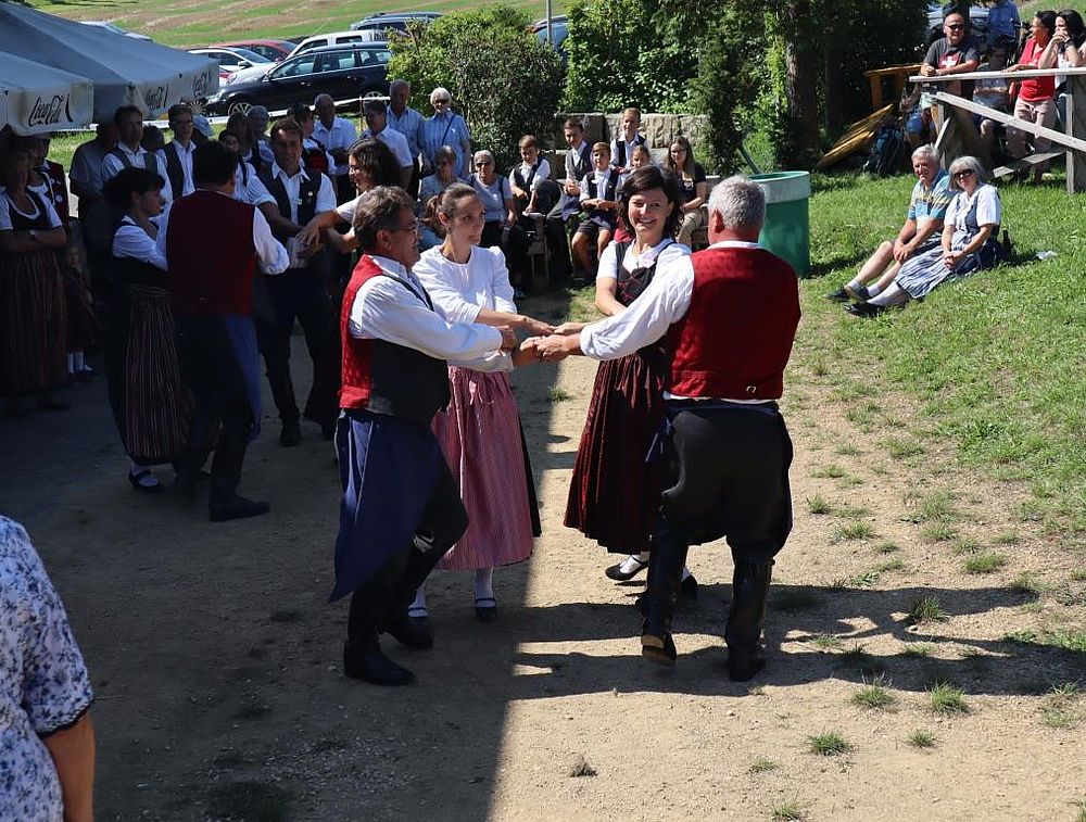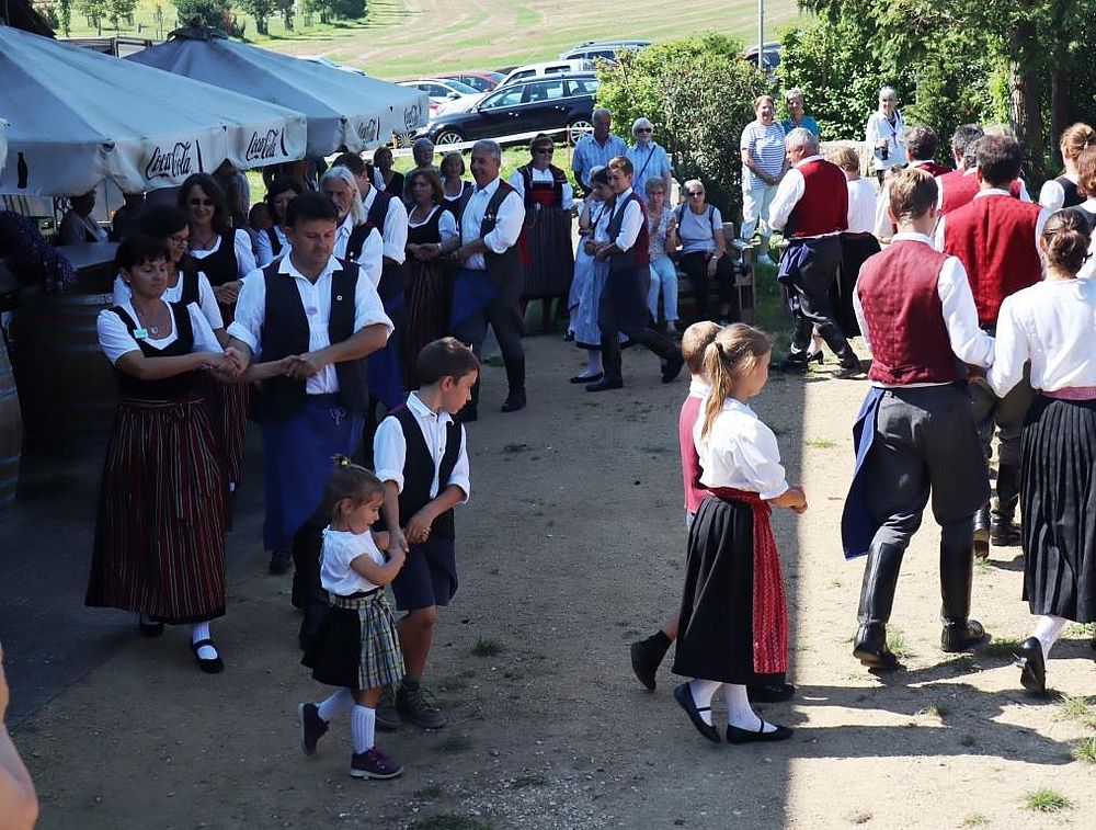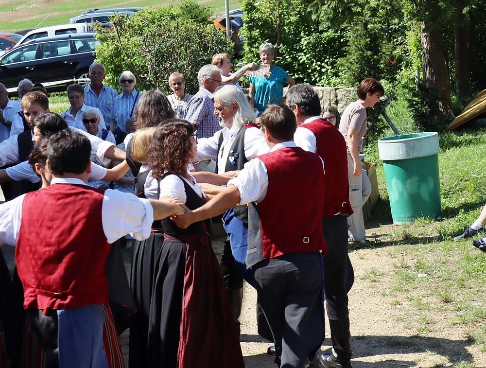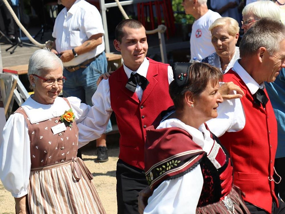 Sonntags geht es schon früh los, punkt 9 Uhr fährt der Car wortwörtlich mit Sack und Pack und wieder mit der Begleitung von Sämi und Susi I. zur Sichtern. Dort ist Chornschüüre-Stubete des VSV, die um 10 Uhr mit einem Gottesdienst im Freien beginnt. Heute sind wir alle in der Tracht unterwegs, haben doch beide Gruppen einen Auftritt an diesem Anlass. Unsere Gäste zeigen ein gut 30 minütiges Programm, bei dem es „wild“ zu und her geht und die Stimmung unter den Gästen, entsprechend den Temperaturen, ziemlich angeheizt wird. Da kommt unser Auftritt, begleitet von der Ländlerkapelle Wartebärg, eher bescheiden daher. Wenn ich die zwei Tanzstiele miteinander vergleiche, fällt mir auf, dass die “Glasinger“ sehr viel Oberkörperarbeit leisten und die Schritte eher einfacher sind, wogegen unsere Schrittfolge anspruchsvoller zu sein scheint, aber der Oberkörper nicht so gefordert wird. Nebst viel Örgelimusik sind diese Tanzeinlagen eine willkommene Abwechslung für die Anwesenden. Die Musik der Österreicher spielt auch zum freien Tanzen auf, was rege genutzt wird von vielen Besuchern. Kurz entschlossen entscheiden die beiden Tanzleiterinnen Elke und Karin, zwei gemeinsame Tänze zu zeigen (“Walzer us der Rosezyt“ und “Polka d’Echallens“) und wir Muttenzer tanzen zu den Klängen der Schwyzerörgeli-Grossformation Basel “Im Örgelihuus“. Das tolle Wochenende neigt sich dem Ende entgegen, Raphi fährt diejenigen, die mit dem Flugzeug heimkehren, zum Flughafen und kommt mit der Reiseverpflegung für im Bus retour. Langsam werden Trachten gegen leichte Reisebekleidung getauscht, auch ein Bad im Brunnen genommen, nochmals etwas gegessen und getrunken und dann kommt schon das Abschiednehmen. Kaum zu glauben, dass das nach nur drei Tagen so schwer fallen kann. In der Hoffnung auf ein Wiedersehen, wo auch immer, steigen unsere Freunde in den Car und fahren müde und überwältigt von all den Eindrücken und begleitet von unserem und dem Winken des Chornschüüre Teams Richtung Liestal und dann wohl der Heimat entgegen. Auch wir machen uns auf in Richtung Muttenz; kurz entschlossen gehen wir noch Essen und lassen den Abend gemeinsam ausklingen.