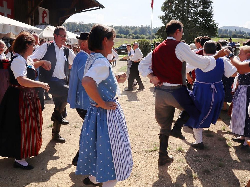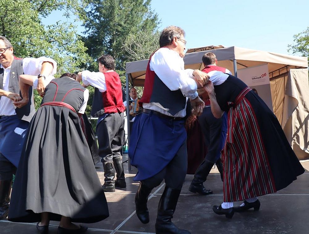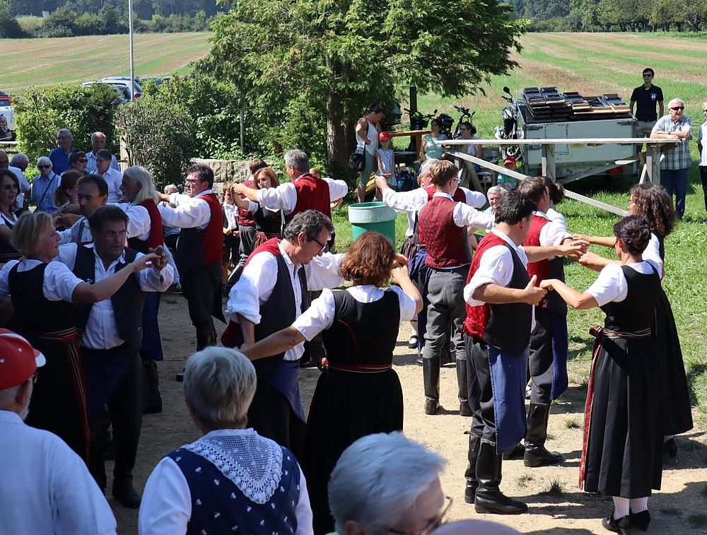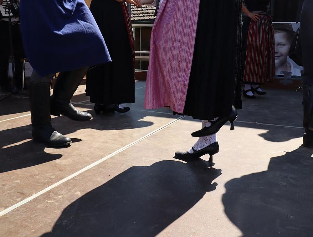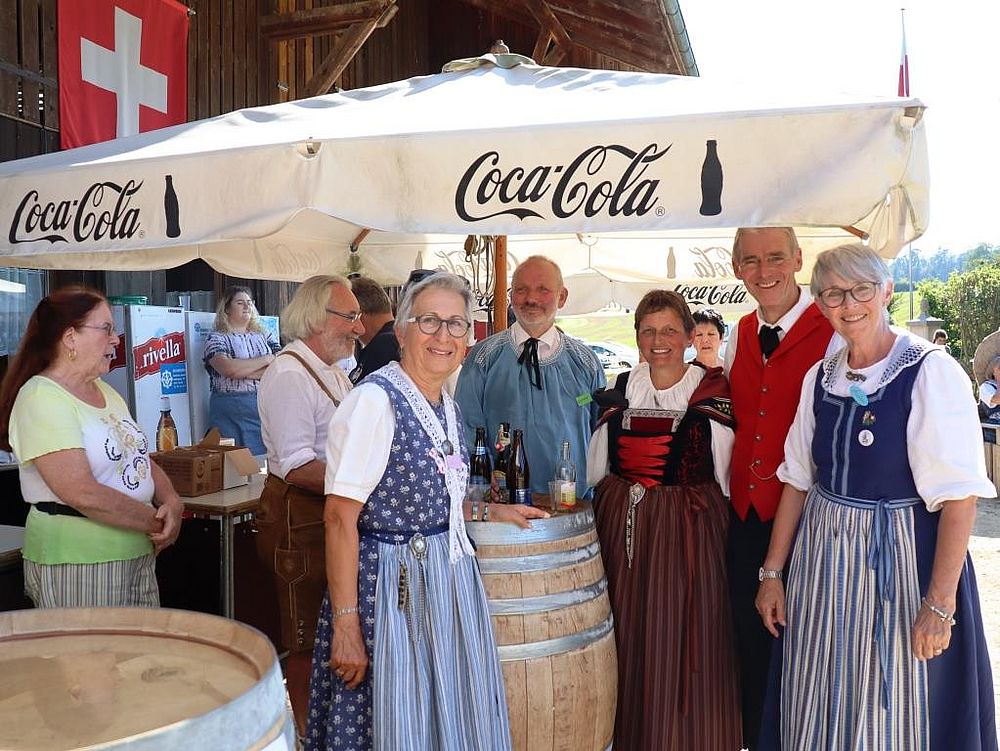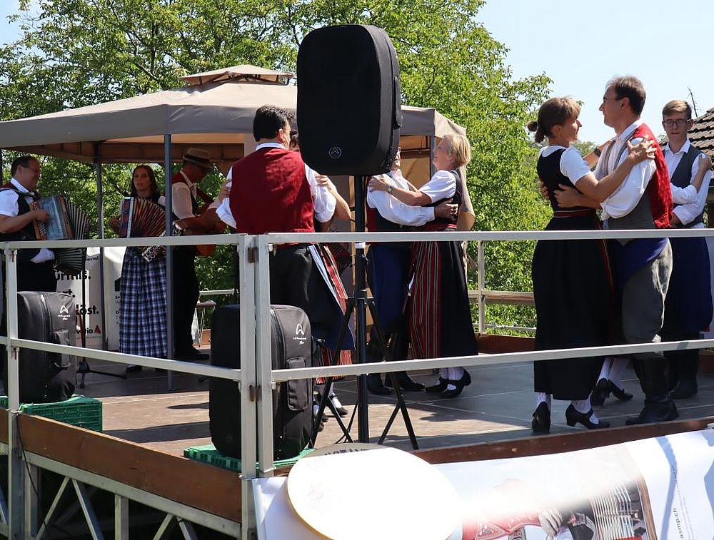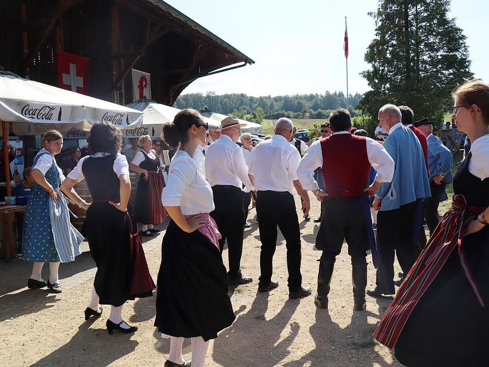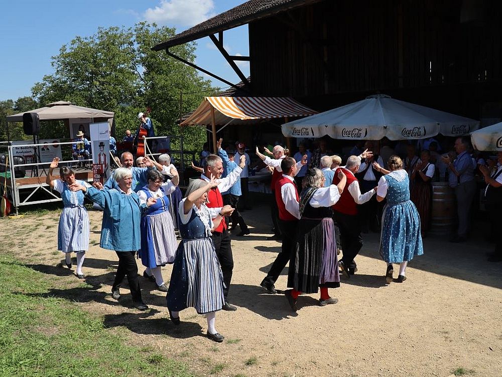 Sonntags geht es schon früh los, punkt 9 Uhr fährt der Car wortwörtlich mit Sack und Pack und wieder mit der Begleitung von Sämi und Susi I. zur Sichtern. Dort ist Chornschüüre-Stubete des VSV, die um 10 Uhr mit einem Gottesdienst im Freien beginnt. Heute sind wir alle in der Tracht unterwegs, haben doch beide Gruppen einen Auftritt an diesem Anlass. Unsere Gäste zeigen ein gut 30 minütiges Programm, bei dem es „wild“ zu und her geht und die Stimmung unter den Gästen, entsprechend den Temperaturen, ziemlich angeheizt wird. Da kommt unser Auftritt, begleitet von der Ländlerkapelle Wartebärg, eher bescheiden daher. Wenn ich die zwei Tanzstiele miteinander vergleiche, fällt mir auf, dass die “Glasinger“ sehr viel Oberkörperarbeit leisten und die Schritte eher einfacher sind, wogegen unsere Schrittfolge anspruchsvoller zu sein scheint, aber der Oberkörper nicht so gefordert wird. Nebst viel Örgelimusik sind diese Tanzeinlagen eine willkommene Abwechslung für die Anwesenden. Die Musik der Österreicher spielt auch zum freien Tanzen auf, was rege genutzt wird von vielen Besuchern. Kurz entschlossen entscheiden die beiden Tanzleiterinnen Elke und Karin, zwei gemeinsame Tänze zu zeigen (“Walzer us der Rosezyt“ und “Polka d’Echallens“) und wir Muttenzer tanzen zu den Klängen der Schwyzerörgeli-Grossformation Basel “Im Örgelihuus“. Das tolle Wochenende neigt sich dem Ende entgegen, Raphi fährt diejenigen, die mit dem Flugzeug heimkehren, zum Flughafen und kommt mit der Reiseverpflegung für im Bus retour. Langsam werden Trachten gegen leichte Reisebekleidung getauscht, auch ein Bad im Brunnen genommen, nochmals etwas gegessen und getrunken und dann kommt schon das Abschiednehmen. Kaum zu glauben, dass das nach nur drei Tagen so schwer fallen kann. In der Hoffnung auf ein Wiedersehen, wo auch immer, steigen unsere Freunde in den Car und fahren müde und überwältigt von all den Eindrücken und begleitet von unserem und dem Winken des Chornschüüre Teams Richtung Liestal und dann wohl der Heimat entgegen. Auch wir machen uns auf in Richtung Muttenz; kurz entschlossen gehen wir noch Essen und lassen den Abend gemeinsam ausklingen.