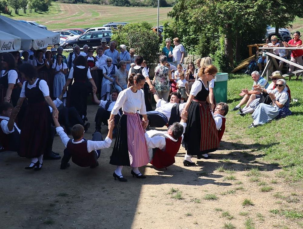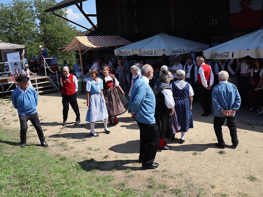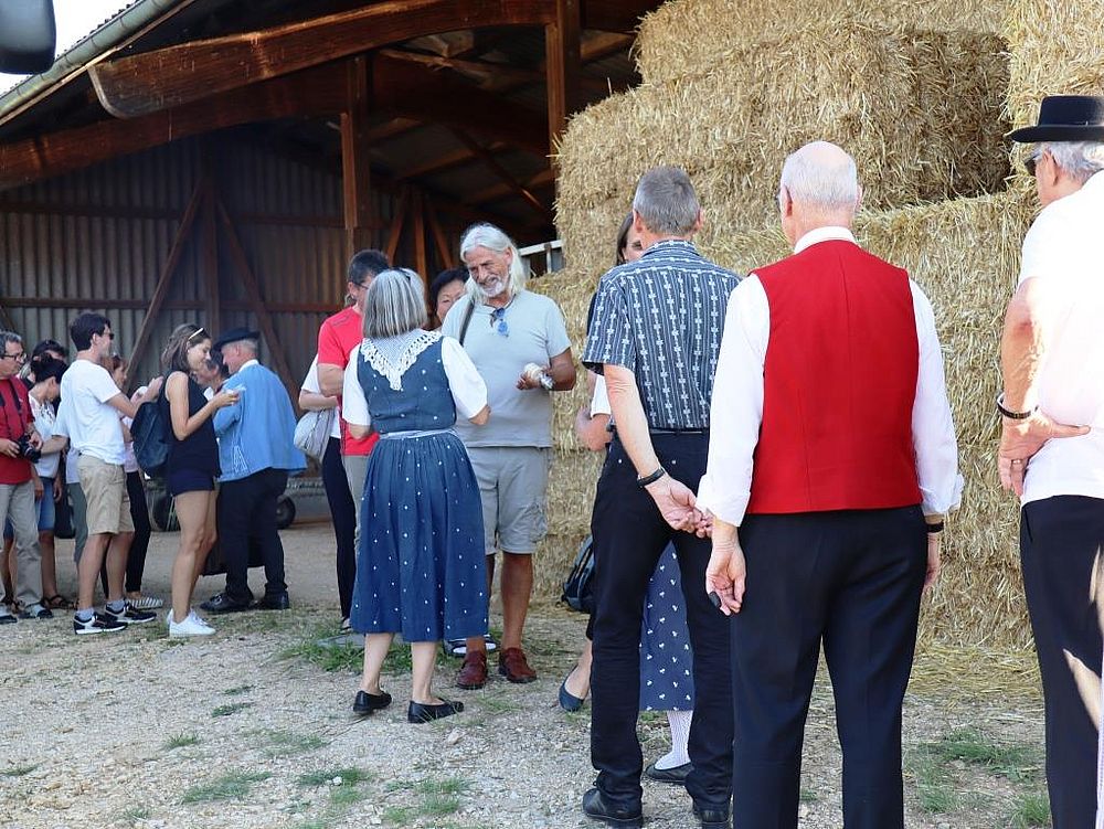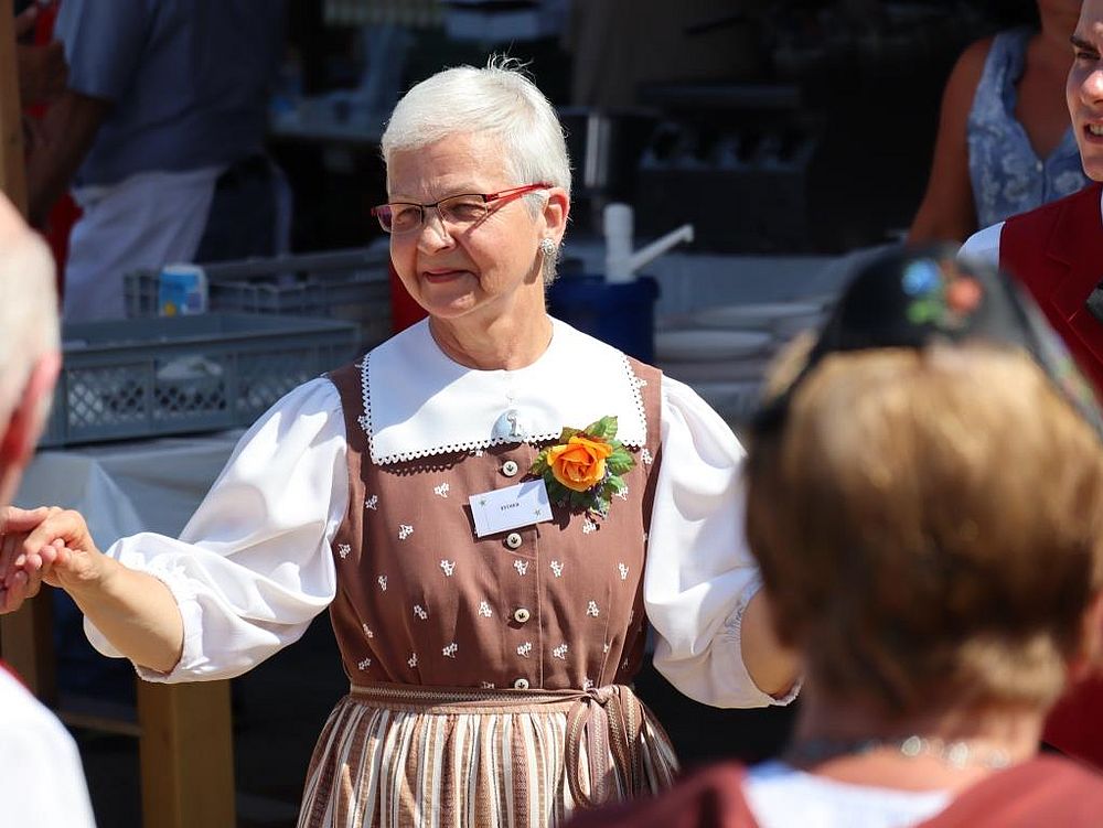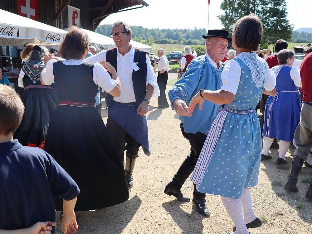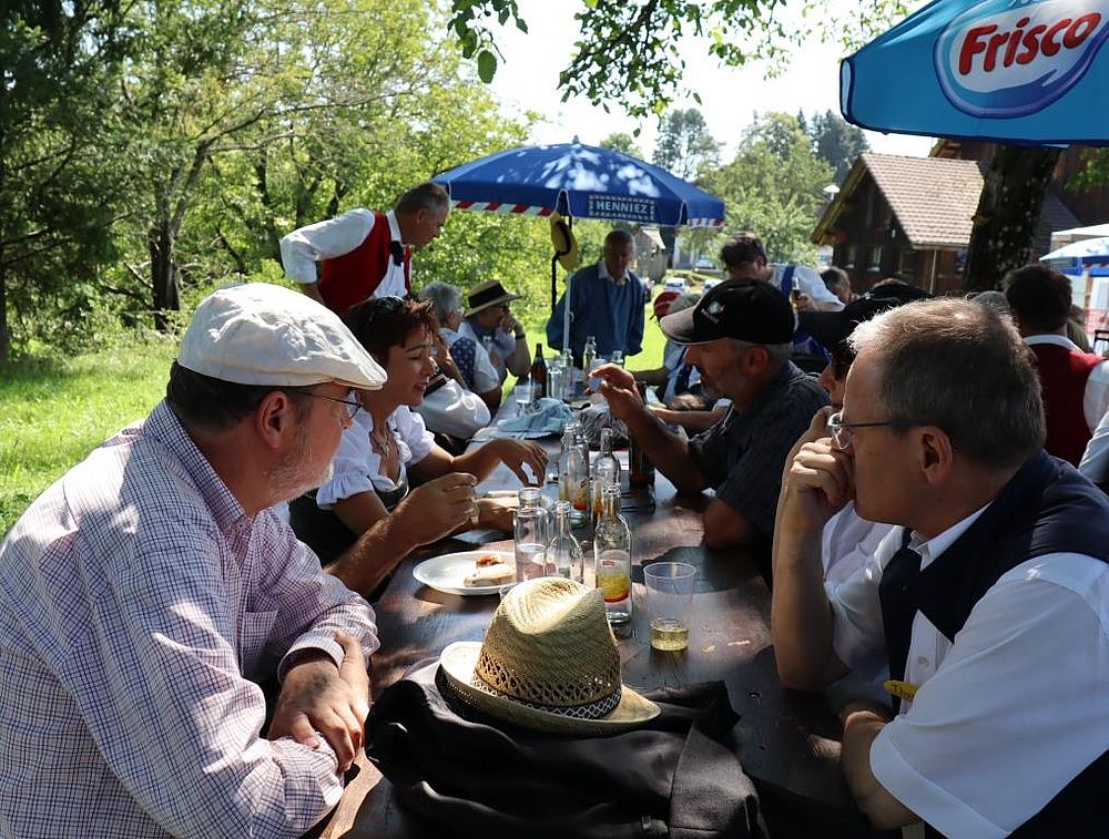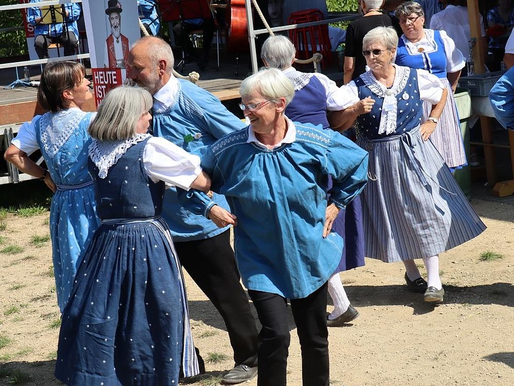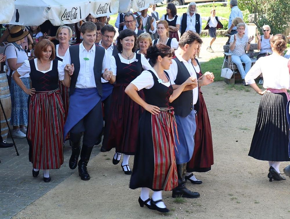 Sonntags geht es schon früh los, punkt 9 Uhr fährt der Car wortwörtlich mit Sack und Pack und wieder mit der Begleitung von Sämi und Susi I. zur Sichtern. Dort ist Chornschüüre-Stubete des VSV, die um 10 Uhr mit einem Gottesdienst im Freien beginnt. Heute sind wir alle in der Tracht unterwegs, haben doch beide Gruppen einen Auftritt an diesem Anlass. Unsere Gäste zeigen ein gut 30 minütiges Programm, bei dem es „wild“ zu und her geht und die Stimmung unter den Gästen, entsprechend den Temperaturen, ziemlich angeheizt wird. Da kommt unser Auftritt, begleitet von der Ländlerkapelle Wartebärg, eher bescheiden daher. Wenn ich die zwei Tanzstiele miteinander vergleiche, fällt mir auf, dass die “Glasinger“ sehr viel Oberkörperarbeit leisten und die Schritte eher einfacher sind, wogegen unsere Schrittfolge anspruchsvoller zu sein scheint, aber der Oberkörper nicht so gefordert wird. Nebst viel Örgelimusik sind diese Tanzeinlagen eine willkommene Abwechslung für die Anwesenden. Die Musik der Österreicher spielt auch zum freien Tanzen auf, was rege genutzt wird von vielen Besuchern. Kurz entschlossen entscheiden die beiden Tanzleiterinnen Elke und Karin, zwei gemeinsame Tänze zu zeigen (“Walzer us der Rosezyt“ und “Polka d’Echallens“) und wir Muttenzer tanzen zu den Klängen der Schwyzerörgeli-Grossformation Basel “Im Örgelihuus“. Das tolle Wochenende neigt sich dem Ende entgegen, Raphi fährt diejenigen, die mit dem Flugzeug heimkehren, zum Flughafen und kommt mit der Reiseverpflegung für im Bus retour. Langsam werden Trachten gegen leichte Reisebekleidung getauscht, auch ein Bad im Brunnen genommen, nochmals etwas gegessen und getrunken und dann kommt schon das Abschiednehmen. Kaum zu glauben, dass das nach nur drei Tagen so schwer fallen kann. In der Hoffnung auf ein Wiedersehen, wo auch immer, steigen unsere Freunde in den Car und fahren müde und überwältigt von all den Eindrücken und begleitet von unserem und dem Winken des Chornschüüre Teams Richtung Liestal und dann wohl der Heimat entgegen. Auch wir machen uns auf in Richtung Muttenz; kurz entschlossen gehen wir noch Essen und lassen den Abend gemeinsam ausklingen.