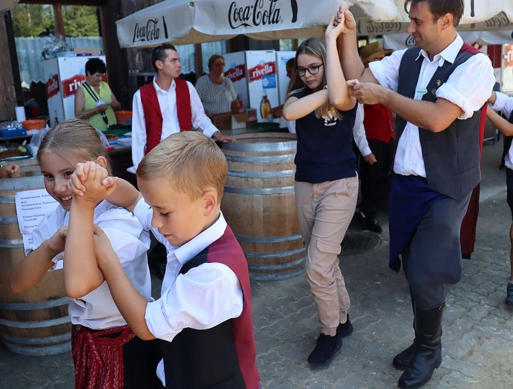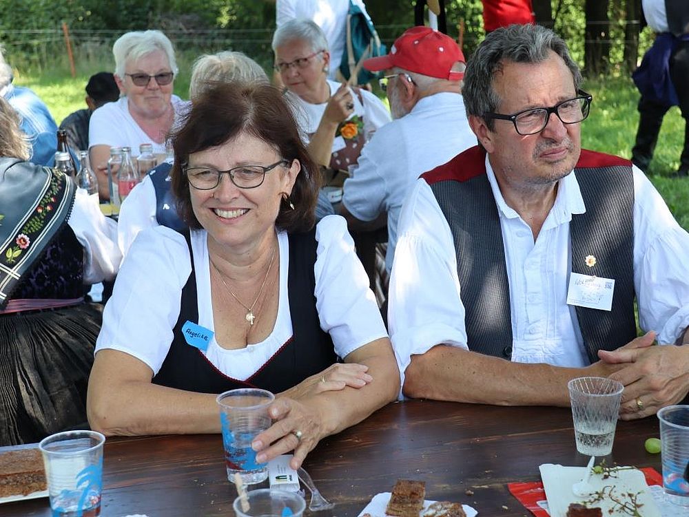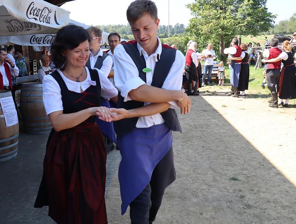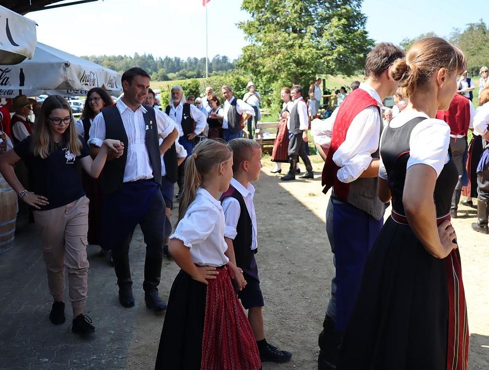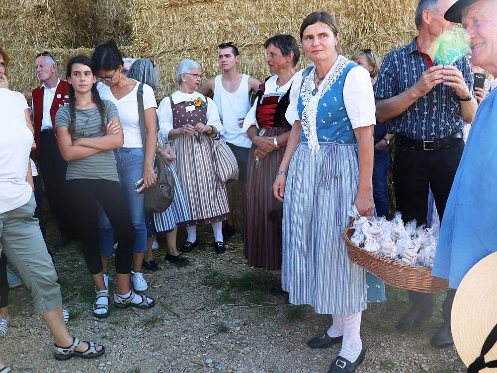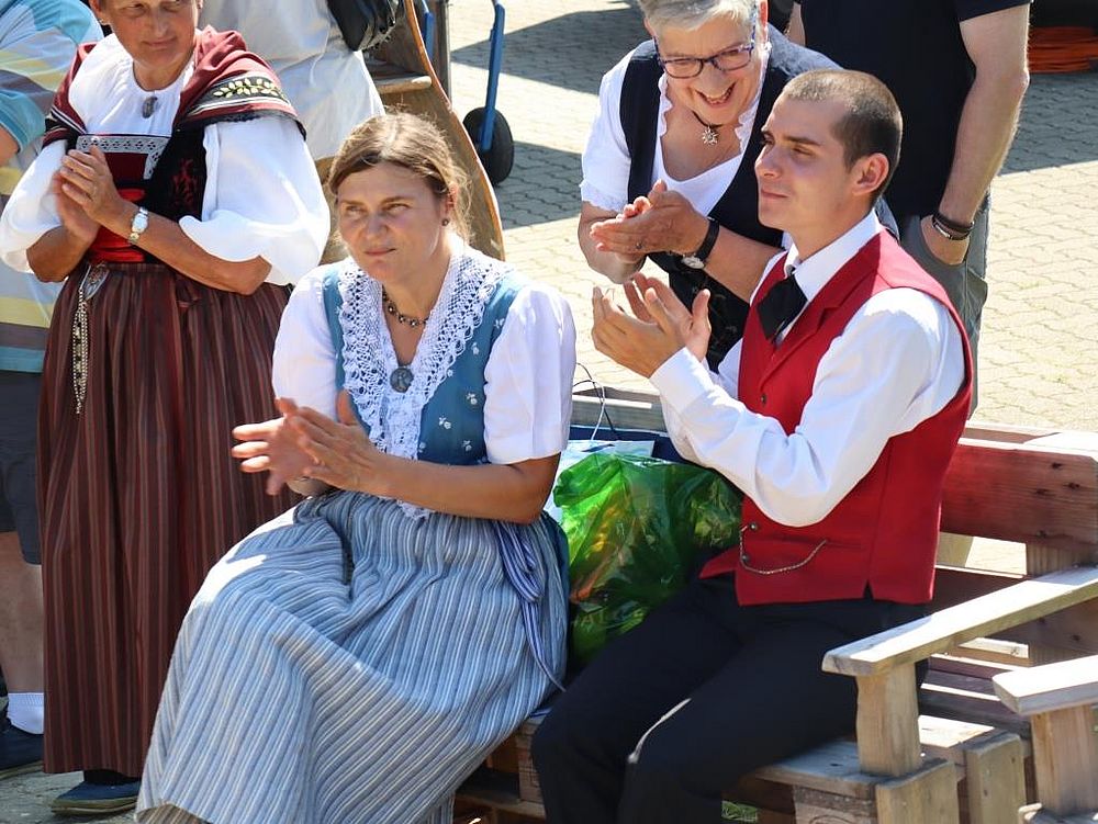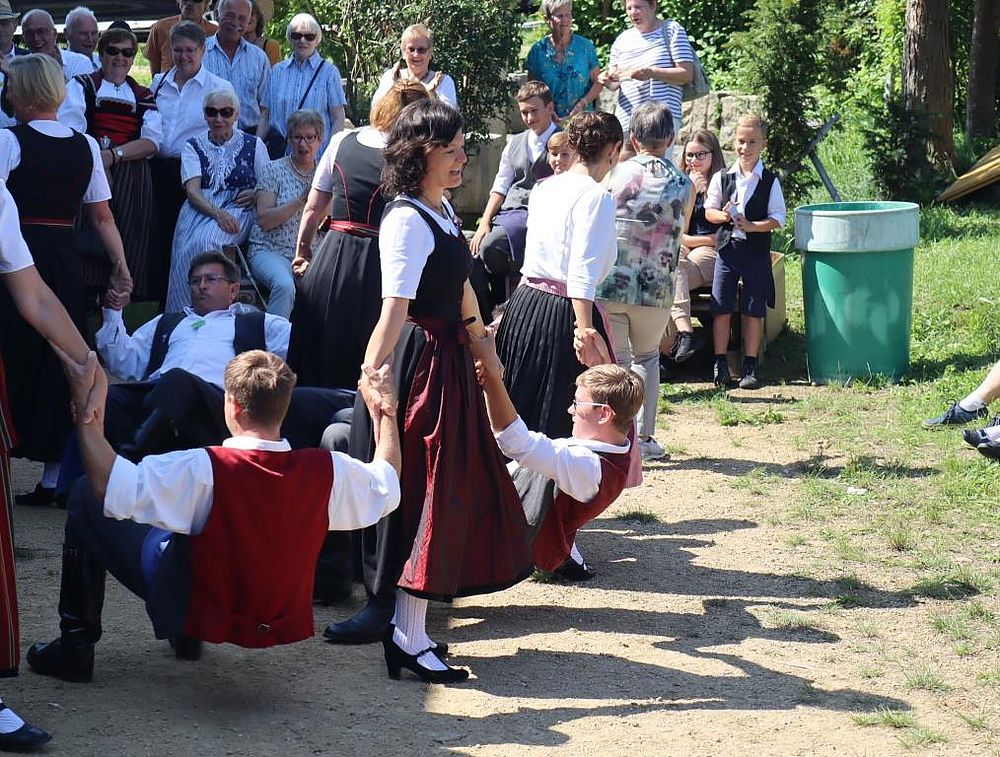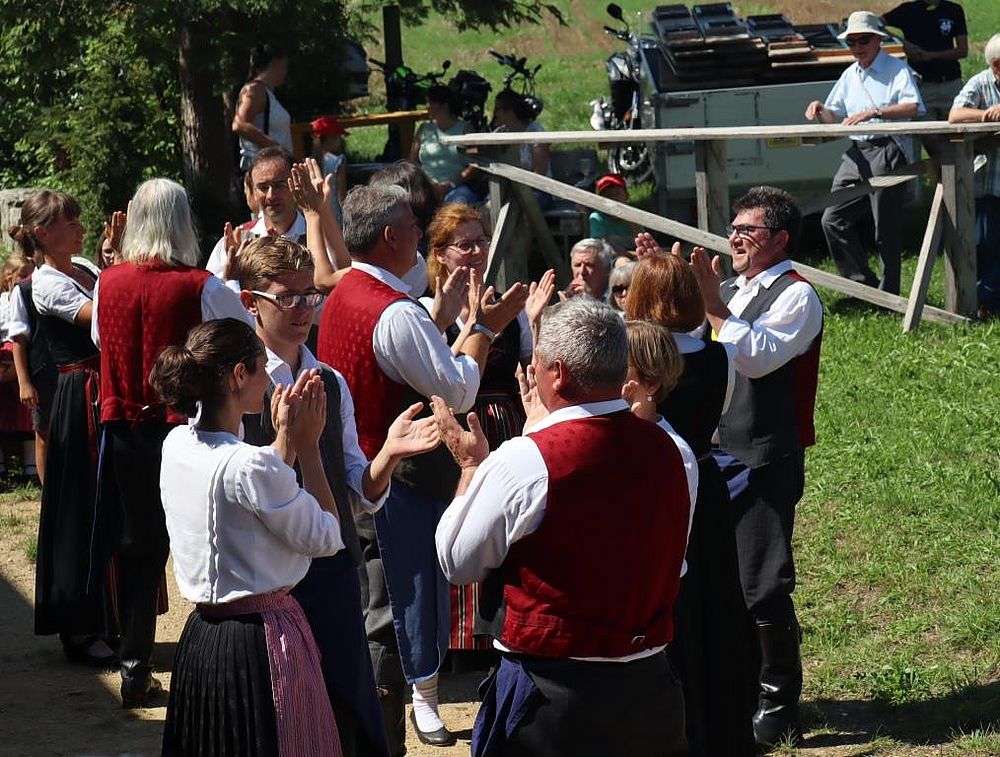 Sonntags geht es schon früh los, punkt 9 Uhr fährt der Car wortwörtlich mit Sack und Pack und wieder mit der Begleitung von Sämi und Susi I. zur Sichtern. Dort ist Chornschüüre-Stubete des VSV, die um 10 Uhr mit einem Gottesdienst im Freien beginnt. Heute sind wir alle in der Tracht unterwegs, haben doch beide Gruppen einen Auftritt an diesem Anlass. Unsere Gäste zeigen ein gut 30 minütiges Programm, bei dem es „wild“ zu und her geht und die Stimmung unter den Gästen, entsprechend den Temperaturen, ziemlich angeheizt wird. Da kommt unser Auftritt, begleitet von der Ländlerkapelle Wartebärg, eher bescheiden daher. Wenn ich die zwei Tanzstiele miteinander vergleiche, fällt mir auf, dass die “Glasinger“ sehr viel Oberkörperarbeit leisten und die Schritte eher einfacher sind, wogegen unsere Schrittfolge anspruchsvoller zu sein scheint, aber der Oberkörper nicht so gefordert wird. Nebst viel Örgelimusik sind diese Tanzeinlagen eine willkommene Abwechslung für die Anwesenden. Die Musik der Österreicher spielt auch zum freien Tanzen auf, was rege genutzt wird von vielen Besuchern. Kurz entschlossen entscheiden die beiden Tanzleiterinnen Elke und Karin, zwei gemeinsame Tänze zu zeigen (“Walzer us der Rosezyt“ und “Polka d’Echallens“) und wir Muttenzer tanzen zu den Klängen der Schwyzerörgeli-Grossformation Basel “Im Örgelihuus“. Das tolle Wochenende neigt sich dem Ende entgegen, Raphi fährt diejenigen, die mit dem Flugzeug heimkehren, zum Flughafen und kommt mit der Reiseverpflegung für im Bus retour. Langsam werden Trachten gegen leichte Reisebekleidung getauscht, auch ein Bad im Brunnen genommen, nochmals etwas gegessen und getrunken und dann kommt schon das Abschiednehmen. Kaum zu glauben, dass das nach nur drei Tagen so schwer fallen kann. In der Hoffnung auf ein Wiedersehen, wo auch immer, steigen unsere Freunde in den Car und fahren müde und überwältigt von all den Eindrücken und begleitet von unserem und dem Winken des Chornschüüre Teams Richtung Liestal und dann wohl der Heimat entgegen. Auch wir machen uns auf in Richtung Muttenz; kurz entschlossen gehen wir noch Essen und lassen den Abend gemeinsam ausklingen.