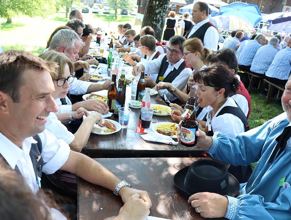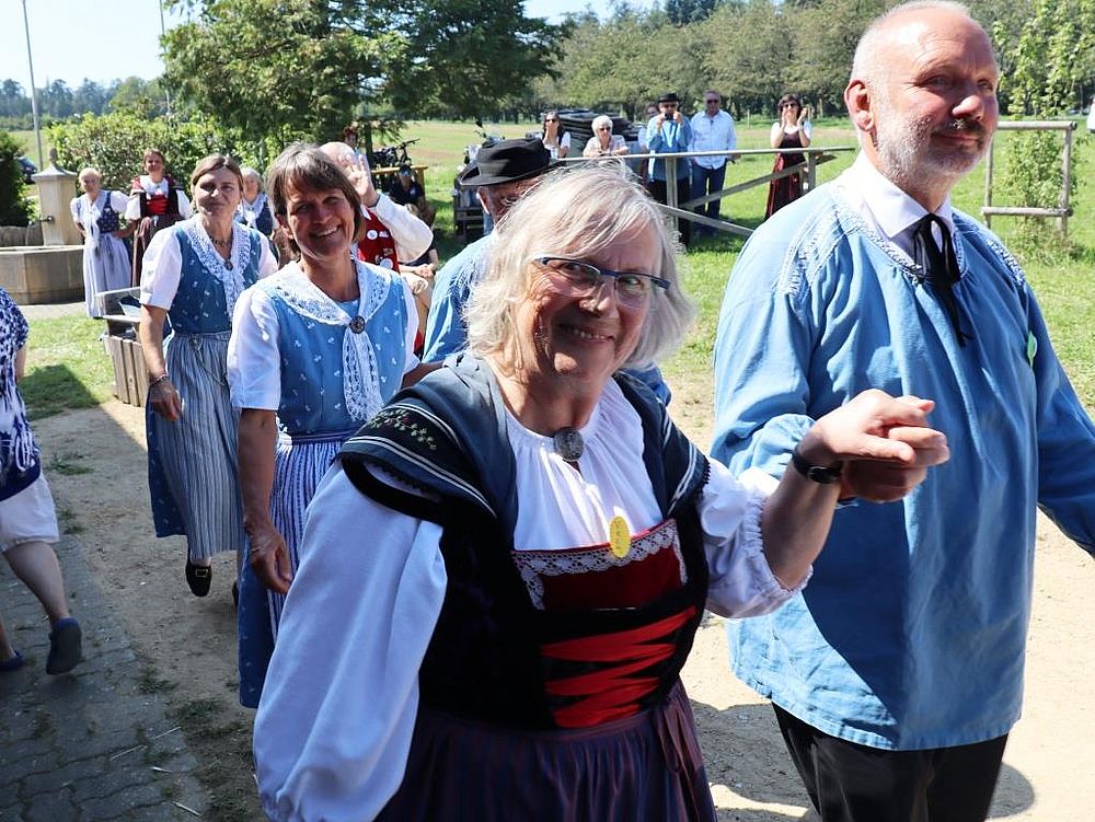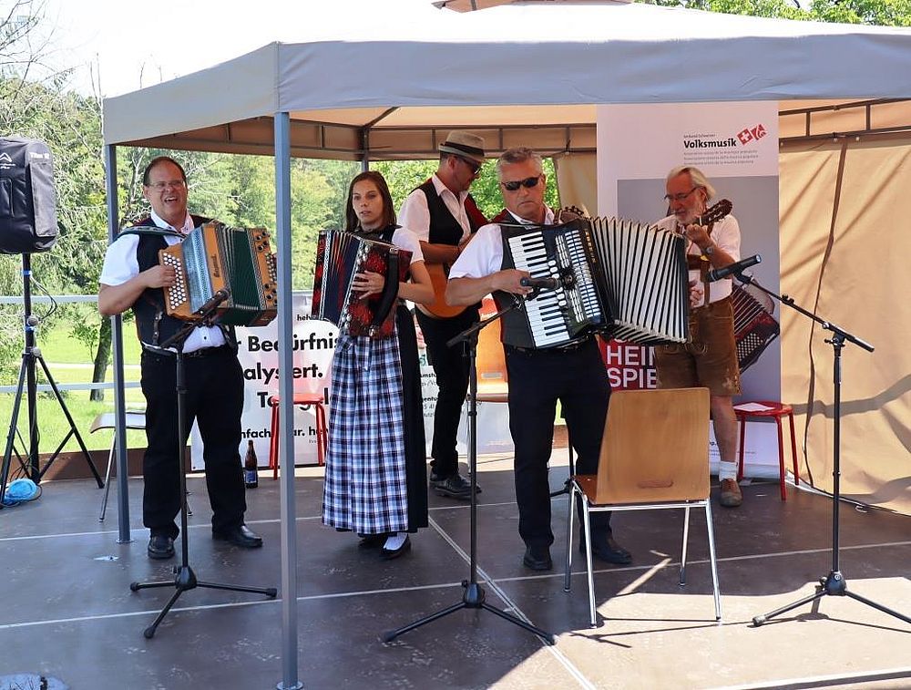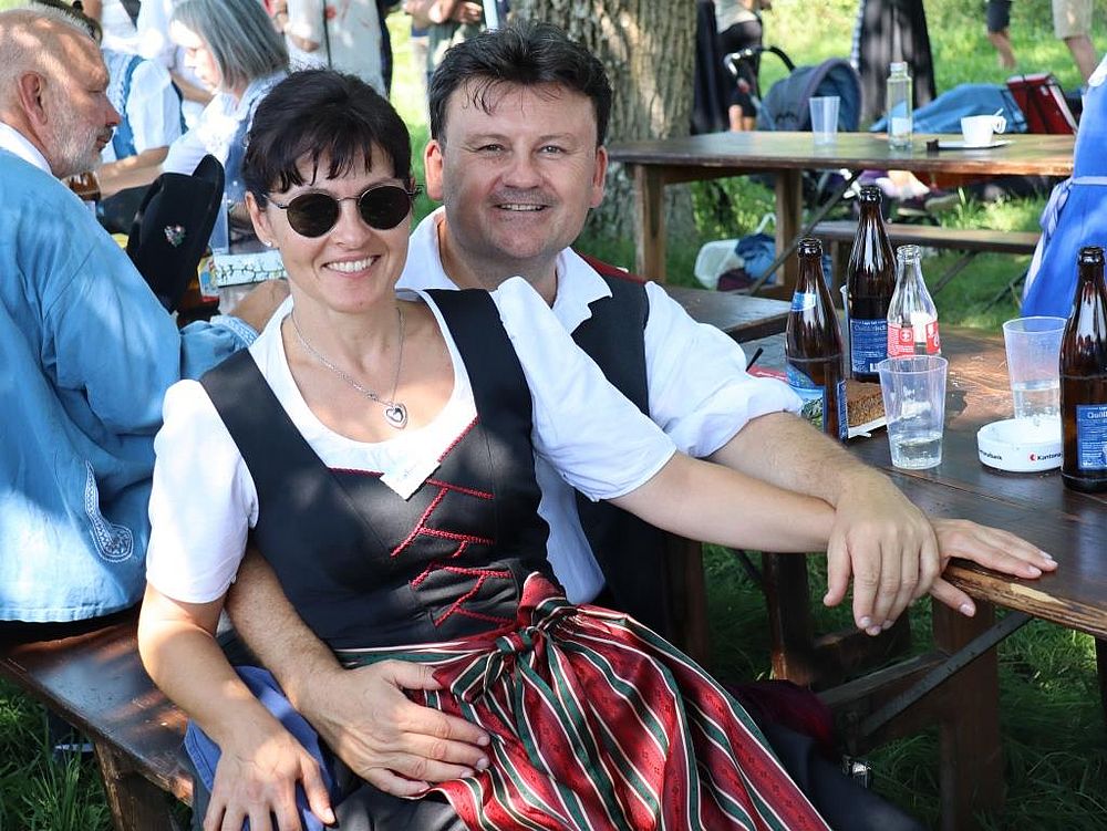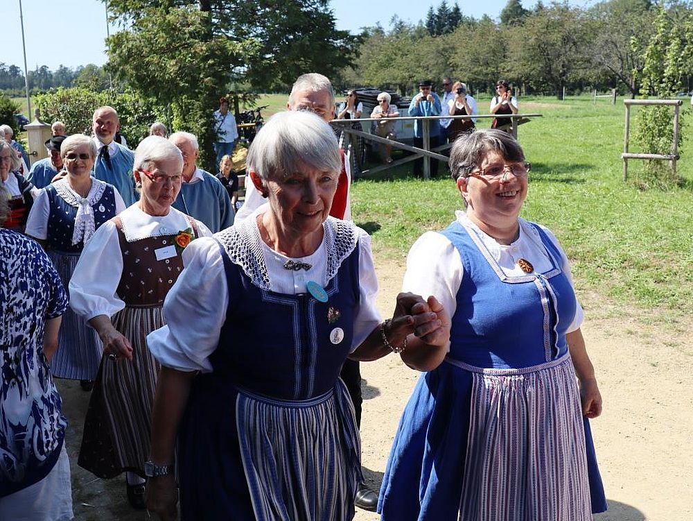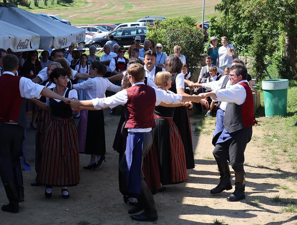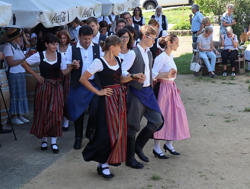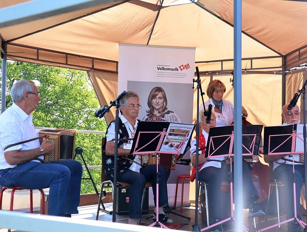 Sonntags geht es schon früh los, punkt 9 Uhr fährt der Car wortwörtlich mit Sack und Pack und wieder mit der Begleitung von Sämi und Susi I. zur Sichtern. Dort ist Chornschüüre-Stubete des VSV, die um 10 Uhr mit einem Gottesdienst im Freien beginnt. Heute sind wir alle in der Tracht unterwegs, haben doch beide Gruppen einen Auftritt an diesem Anlass. Unsere Gäste zeigen ein gut 30 minütiges Programm, bei dem es „wild“ zu und her geht und die Stimmung unter den Gästen, entsprechend den Temperaturen, ziemlich angeheizt wird. Da kommt unser Auftritt, begleitet von der Ländlerkapelle Wartebärg, eher bescheiden daher. Wenn ich die zwei Tanzstiele miteinander vergleiche, fällt mir auf, dass die “Glasinger“ sehr viel Oberkörperarbeit leisten und die Schritte eher einfacher sind, wogegen unsere Schrittfolge anspruchsvoller zu sein scheint, aber der Oberkörper nicht so gefordert wird. Nebst viel Örgelimusik sind diese Tanzeinlagen eine willkommene Abwechslung für die Anwesenden. Die Musik der Österreicher spielt auch zum freien Tanzen auf, was rege genutzt wird von vielen Besuchern. Kurz entschlossen entscheiden die beiden Tanzleiterinnen Elke und Karin, zwei gemeinsame Tänze zu zeigen (“Walzer us der Rosezyt“ und “Polka d’Echallens“) und wir Muttenzer tanzen zu den Klängen der Schwyzerörgeli-Grossformation Basel “Im Örgelihuus“. Das tolle Wochenende neigt sich dem Ende entgegen, Raphi fährt diejenigen, die mit dem Flugzeug heimkehren, zum Flughafen und kommt mit der Reiseverpflegung für im Bus retour. Langsam werden Trachten gegen leichte Reisebekleidung getauscht, auch ein Bad im Brunnen genommen, nochmals etwas gegessen und getrunken und dann kommt schon das Abschiednehmen. Kaum zu glauben, dass das nach nur drei Tagen so schwer fallen kann. In der Hoffnung auf ein Wiedersehen, wo auch immer, steigen unsere Freunde in den Car und fahren müde und überwältigt von all den Eindrücken und begleitet von unserem und dem Winken des Chornschüüre Teams Richtung Liestal und dann wohl der Heimat entgegen. Auch wir machen uns auf in Richtung Muttenz; kurz entschlossen gehen wir noch Essen und lassen den Abend gemeinsam ausklingen.