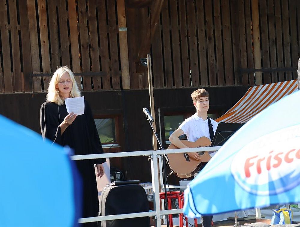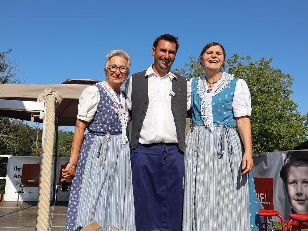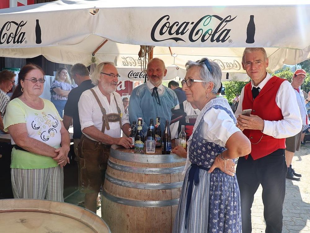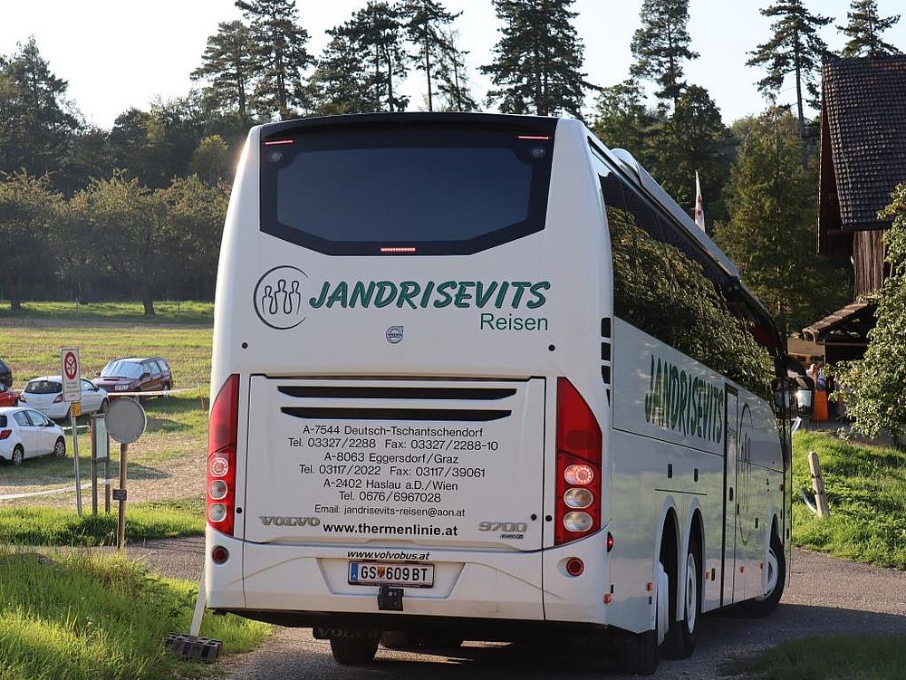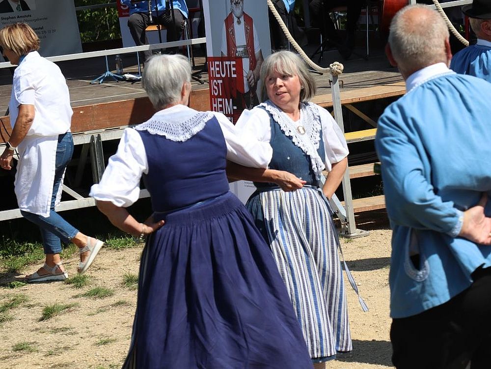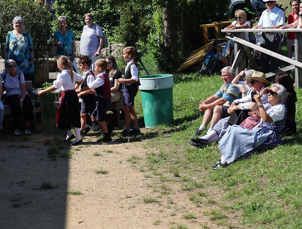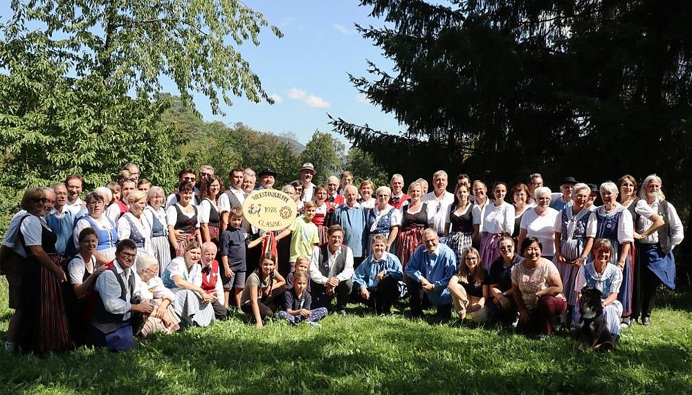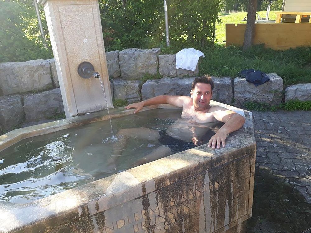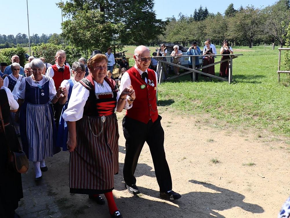 Sonntags geht es schon früh los, punkt 9 Uhr fährt der Car wortwörtlich mit Sack und Pack und wieder mit der Begleitung von Sämi und Susi I. zur Sichtern. Dort ist Chornschüüre-Stubete des VSV, die um 10 Uhr mit einem Gottesdienst im Freien beginnt. Heute sind wir alle in der Tracht unterwegs, haben doch beide Gruppen einen Auftritt an diesem Anlass. Unsere Gäste zeigen ein gut 30 minütiges Programm, bei dem es „wild“ zu und her geht und die Stimmung unter den Gästen, entsprechend den Temperaturen, ziemlich angeheizt wird. Da kommt unser Auftritt, begleitet von der Ländlerkapelle Wartebärg, eher bescheiden daher. Wenn ich die zwei Tanzstiele miteinander vergleiche, fällt mir auf, dass die “Glasinger“ sehr viel Oberkörperarbeit leisten und die Schritte eher einfacher sind, wogegen unsere Schrittfolge anspruchsvoller zu sein scheint, aber der Oberkörper nicht so gefordert wird. Nebst viel Örgelimusik sind diese Tanzeinlagen eine willkommene Abwechslung für die Anwesenden. Die Musik der Österreicher spielt auch zum freien Tanzen auf, was rege genutzt wird von vielen Besuchern. Kurz entschlossen entscheiden die beiden Tanzleiterinnen Elke und Karin, zwei gemeinsame Tänze zu zeigen (“Walzer us der Rosezyt“ und “Polka d’Echallens“) und wir Muttenzer tanzen zu den Klängen der Schwyzerörgeli-Grossformation Basel “Im Örgelihuus“. Das tolle Wochenende neigt sich dem Ende entgegen, Raphi fährt diejenigen, die mit dem Flugzeug heimkehren, zum Flughafen und kommt mit der Reiseverpflegung für im Bus retour. Langsam werden Trachten gegen leichte Reisebekleidung getauscht, auch ein Bad im Brunnen genommen, nochmals etwas gegessen und getrunken und dann kommt schon das Abschiednehmen. Kaum zu glauben, dass das nach nur drei Tagen so schwer fallen kann. In der Hoffnung auf ein Wiedersehen, wo auch immer, steigen unsere Freunde in den Car und fahren müde und überwältigt von all den Eindrücken und begleitet von unserem und dem Winken des Chornschüüre Teams Richtung Liestal und dann wohl der Heimat entgegen. Auch wir machen uns auf in Richtung Muttenz; kurz entschlossen gehen wir noch Essen und lassen den Abend gemeinsam ausklingen.
