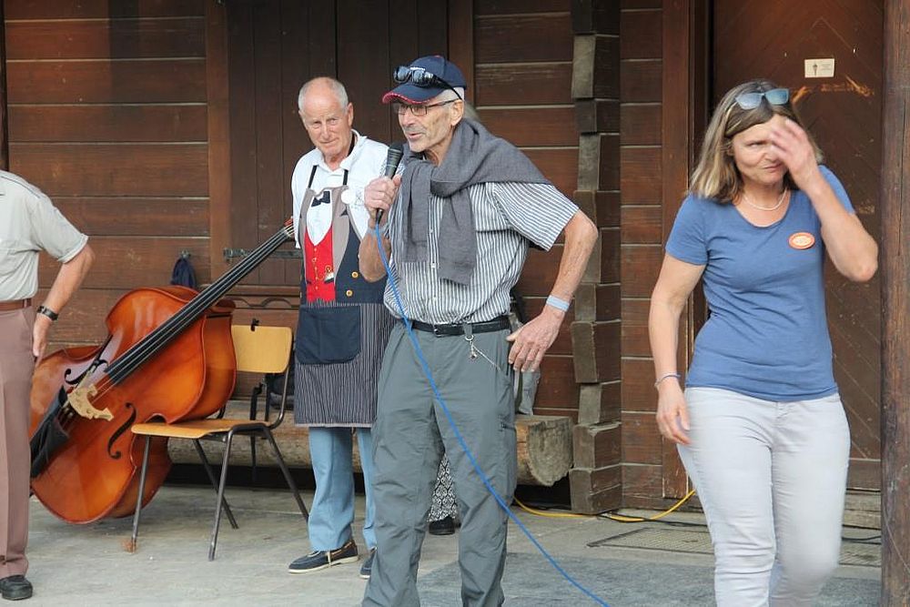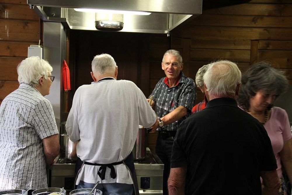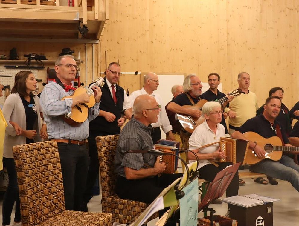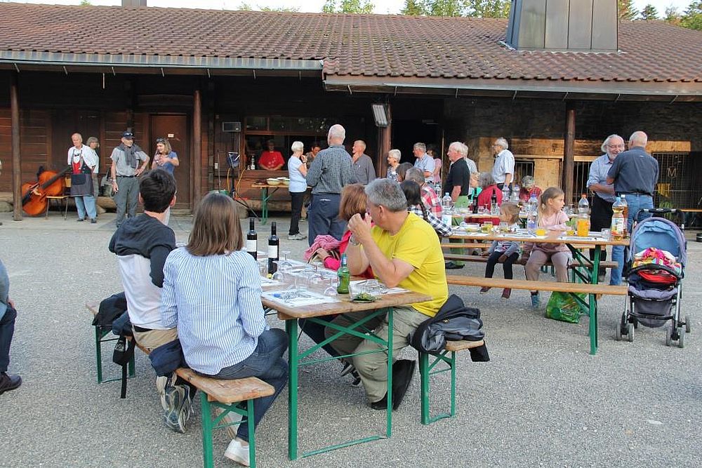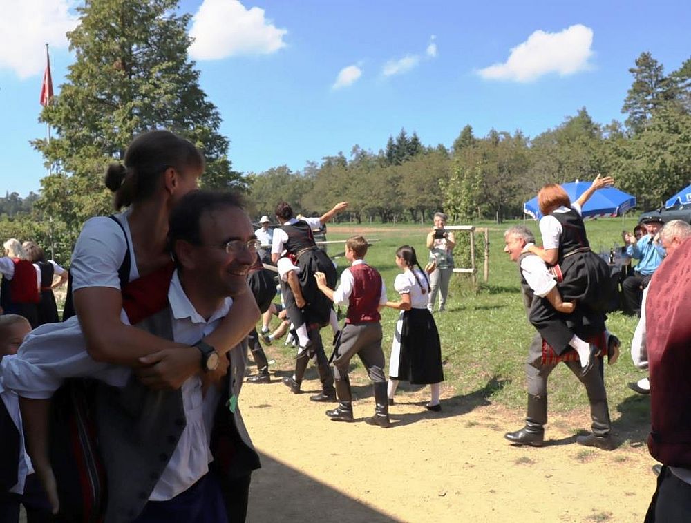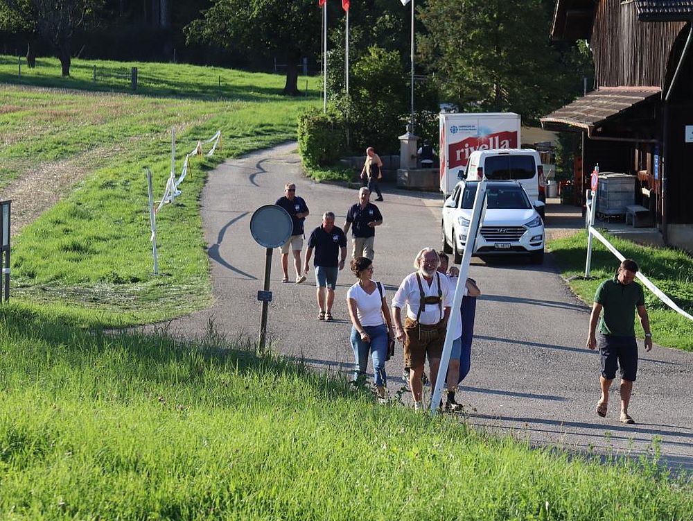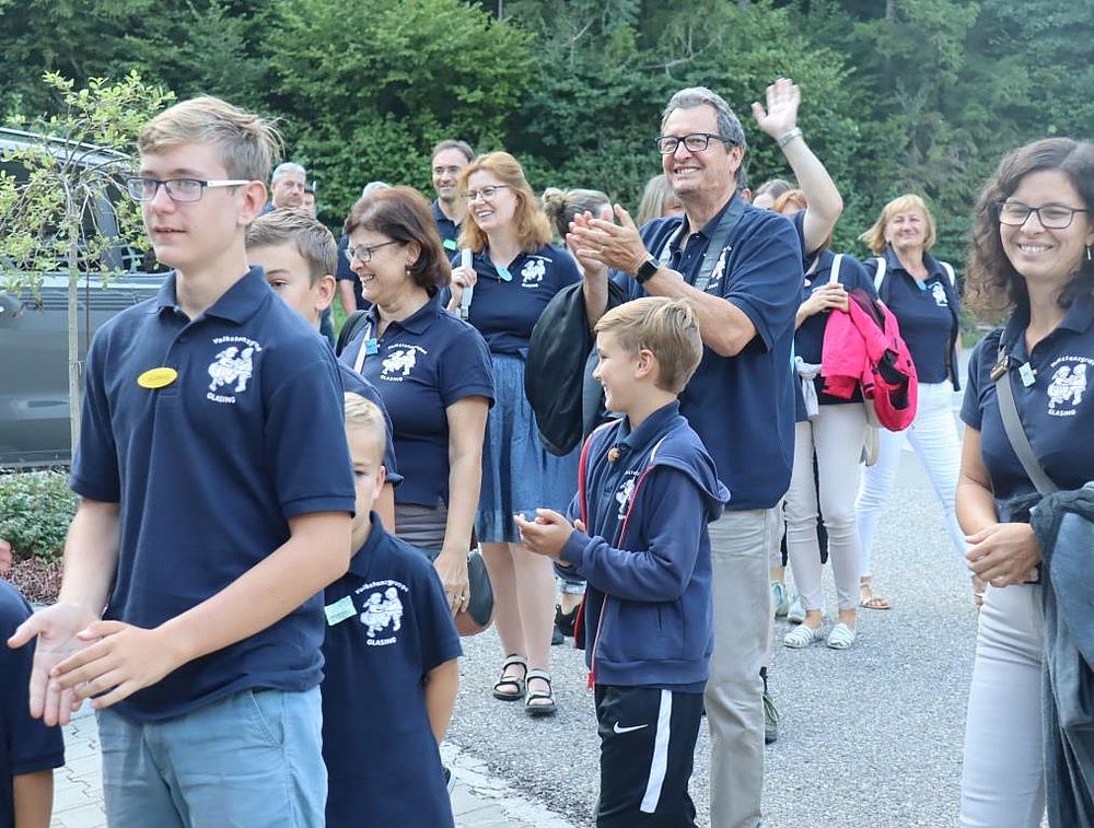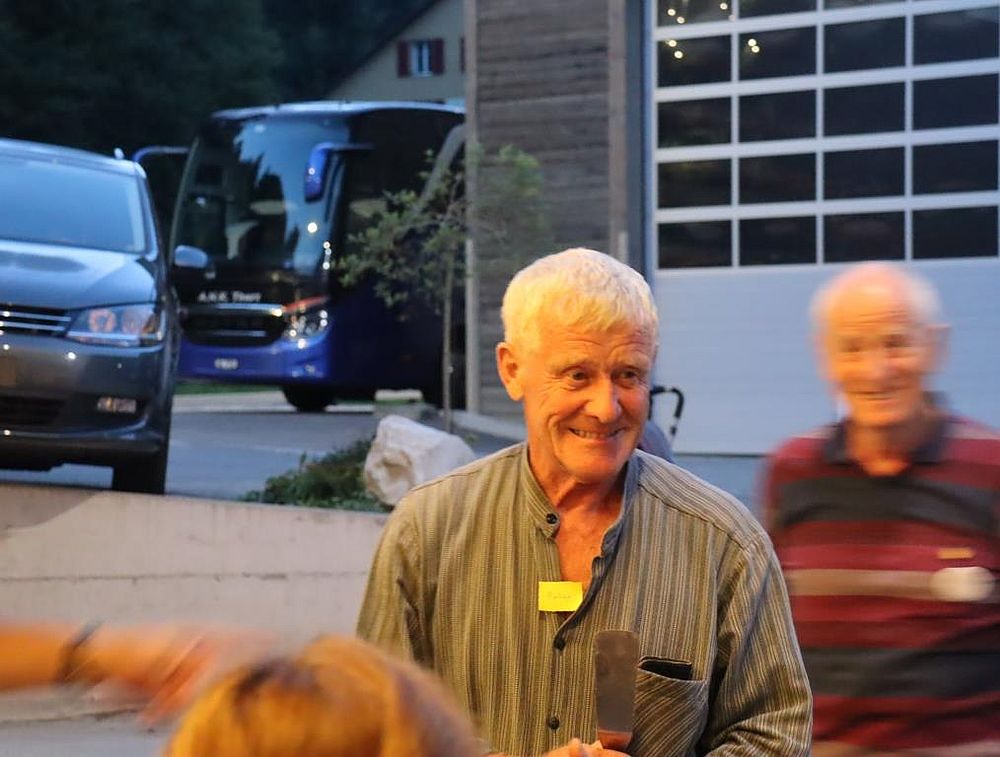Nach dem Zimmerbezug gibt es auf dem Gemeindeplatz einen Willkommensapéro mit Alphornklängen von Köbi Dolder und Erläuterungen zum Dorf von Vreni Hungerbühler. Danach fährt die Gruppe, bestehend aus 37 Erwachsenen zwischen 17 und 67 Jahren und 9 Kindern zwischen 3 ½ und 14 ½ Jahren per Car auf den Sulzchopf. Zuerst geniessen viele von uns die schöne Aussicht übers Dorf, über die Stadt Basel, bis in den Schwarzwald und zum Elsass. Danach ist das Essen bereit, hungrig geniessen alle Salat, Risotto und zum Schluss ein Kuchenbuffet. Dazwischen wird gesungen, musiziert und getanzt. Karin hat dazu ein vielfältiges Programm zusammengestellt und führt durch die Lieder und mit Andrea abwechselnd durch die Tänze. Alle machen mit Begeisterung mit und wir verbringen alle zusammen einen gemütlichen Abend. Wir freuen uns alle daran, dass Sämi, der wieder mit seiner Gesundheit kämpft, einige Zeit mit uns verbringen kann und auch die Geschenke der Glasinger entgegennehmen kann. Nach 22 Uhr möchten unsere Gäste zurück ins Hotel, um am nächsten Tag ausgeruht zu sein. Ein Musikant spielt einige Takte „Muss i denn zum Städtele hinaus“ und wie in einer eingeübten Choreographie stehen unsere Gäste auf, jeder nimmt sein Geschirr und Tischset, bringt es in die Küche und macht sich auf den kurzen Weg zum Bus und wir, wir bleiben total “geflasht“ vor den leeren Tischen zurück. Nach einer kurzen Erholung machen wir uns ans Aufräumen und gehen gegen Mitternacht müde, aber sehr glücklich heim.