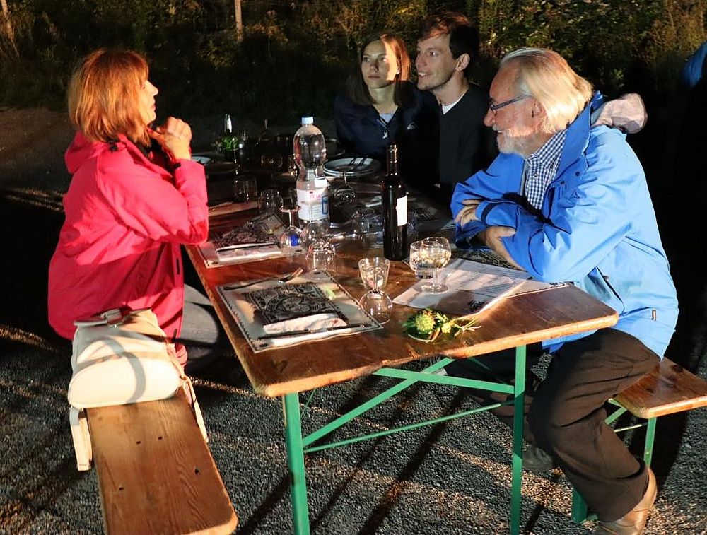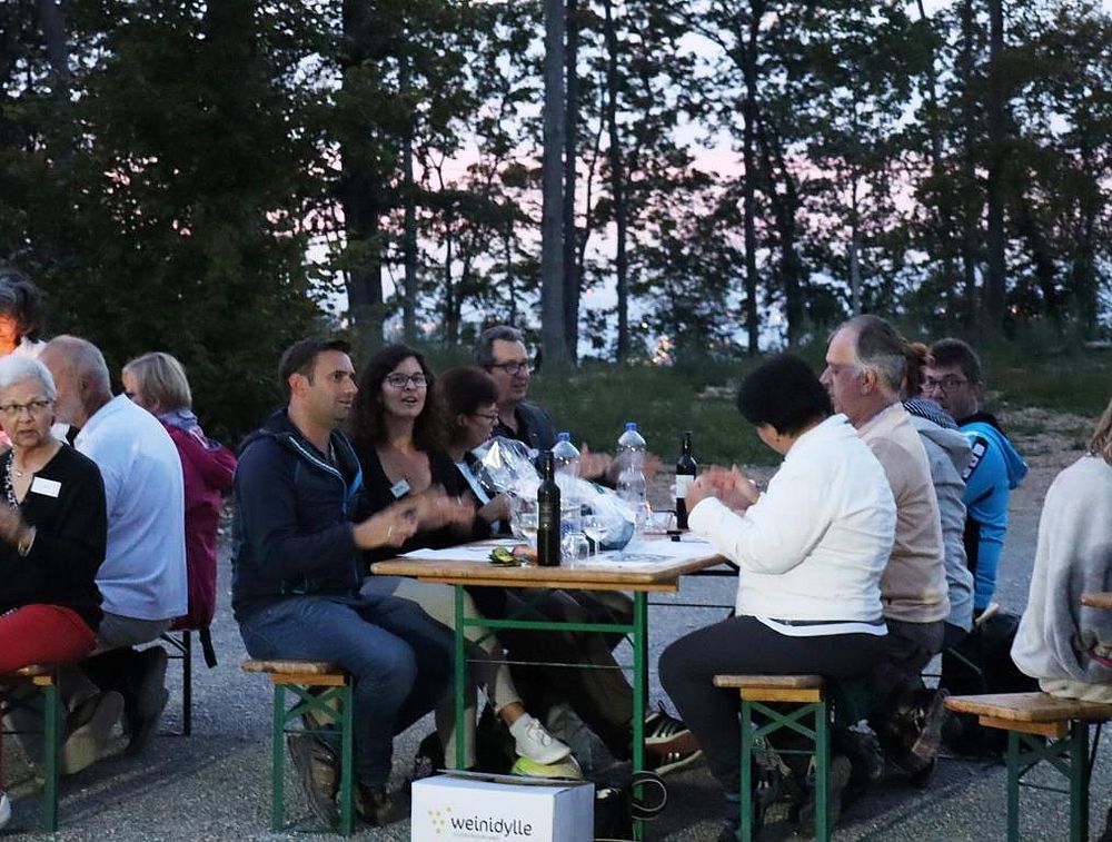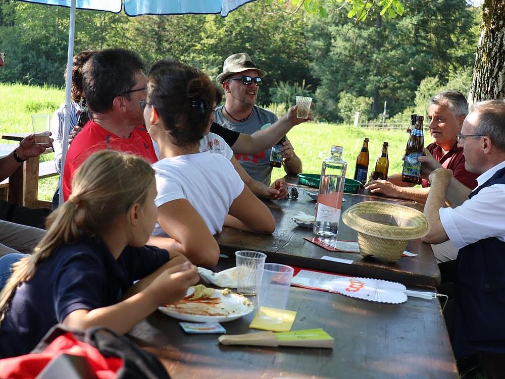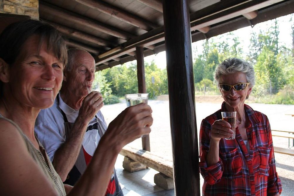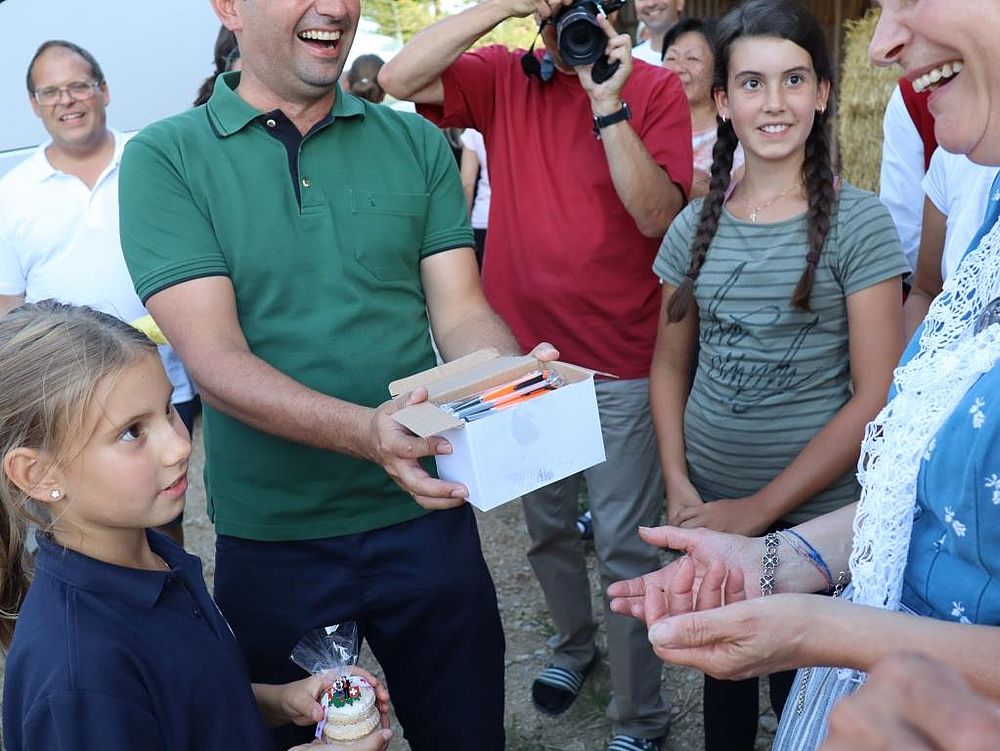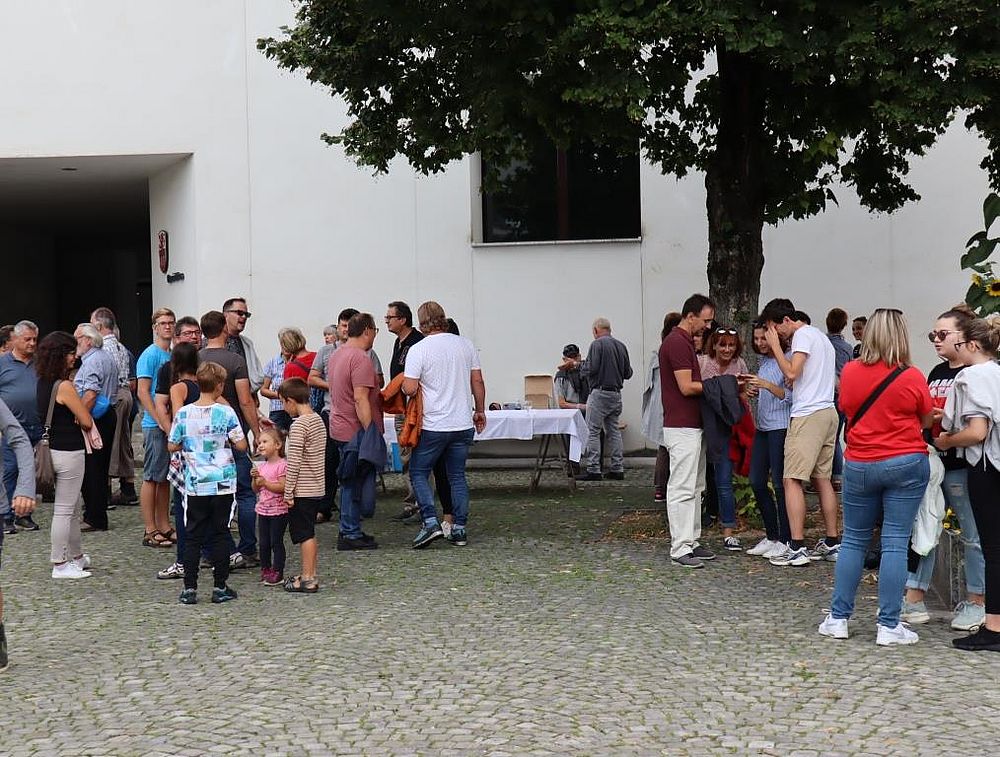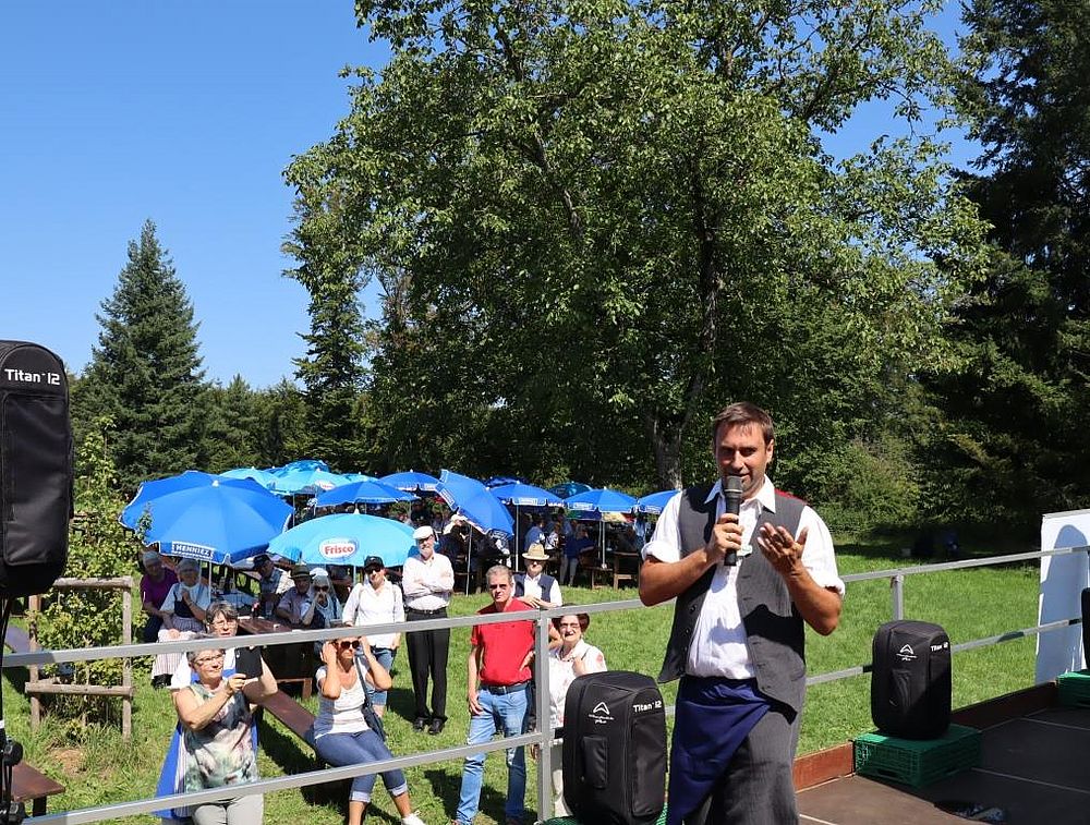 Nach dem Zimmerbezug gibt es auf dem Gemeindeplatz einen Willkommensapéro mit Alphornklängen von Köbi Dolder und Erläuterungen zum Dorf von Vreni Hungerbühler. Danach fährt die Gruppe, bestehend aus 37 Erwachsenen zwischen 17 und 67 Jahren und 9 Kindern zwischen 3 ½ und 14 ½ Jahren per Car auf den Sulzchopf. Zuerst geniessen viele von uns die schöne Aussicht übers Dorf, über die Stadt Basel, bis in den Schwarzwald und zum Elsass. Danach ist das Essen bereit, hungrig geniessen alle Salat, Risotto und zum Schluss ein Kuchenbuffet. Dazwischen wird gesungen, musiziert und getanzt. Karin hat dazu ein vielfältiges Programm zusammengestellt und führt durch die Lieder und mit Andrea abwechselnd durch die Tänze. Alle machen mit Begeisterung mit und wir verbringen alle zusammen einen gemütlichen Abend. Wir freuen uns alle daran, dass Sämi, der wieder mit seiner Gesundheit kämpft, einige Zeit mit uns verbringen kann und auch die Geschenke der Glasinger entgegennehmen kann. Nach 22 Uhr möchten unsere Gäste zurück ins Hotel, um am nächsten Tag ausgeruht zu sein. Ein Musikant spielt einige Takte „Muss i denn zum Städtele hinaus“ und wie in einer eingeübten Choreographie stehen unsere Gäste auf, jeder nimmt sein Geschirr und Tischset, bringt es in die Küche und macht sich auf den kurzen Weg zum Bus und wir, wir bleiben total “geflasht“ vor den leeren Tischen zurück. Nach einer kurzen Erholung machen wir uns ans Aufräumen und gehen gegen Mitternacht müde, aber sehr glücklich heim.