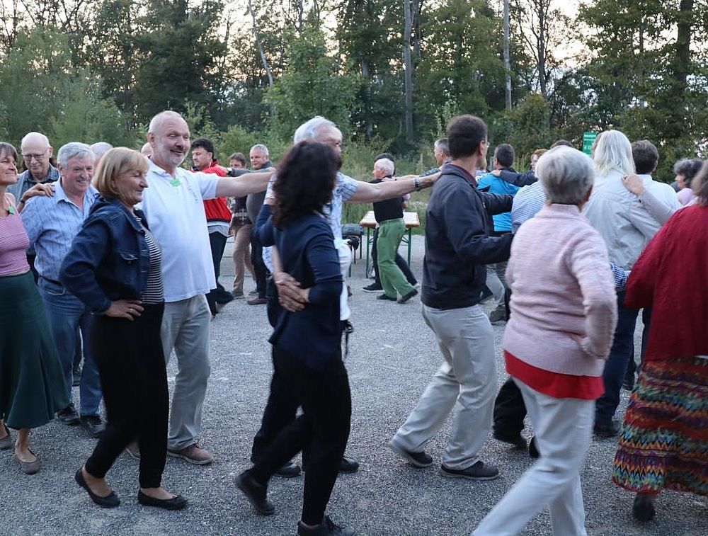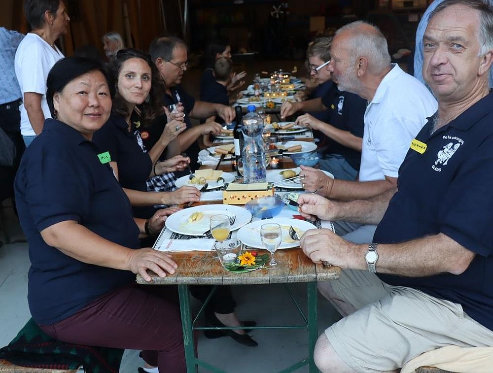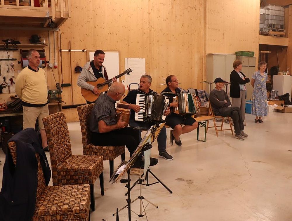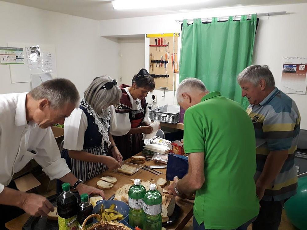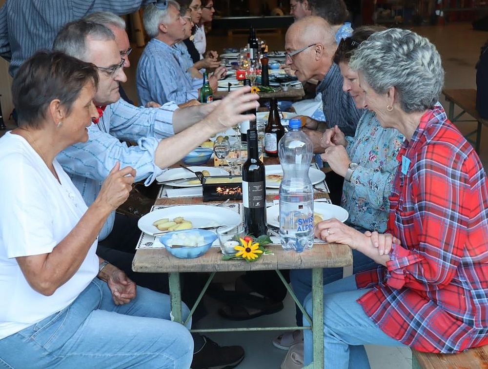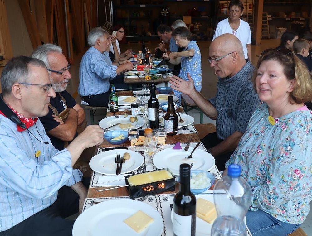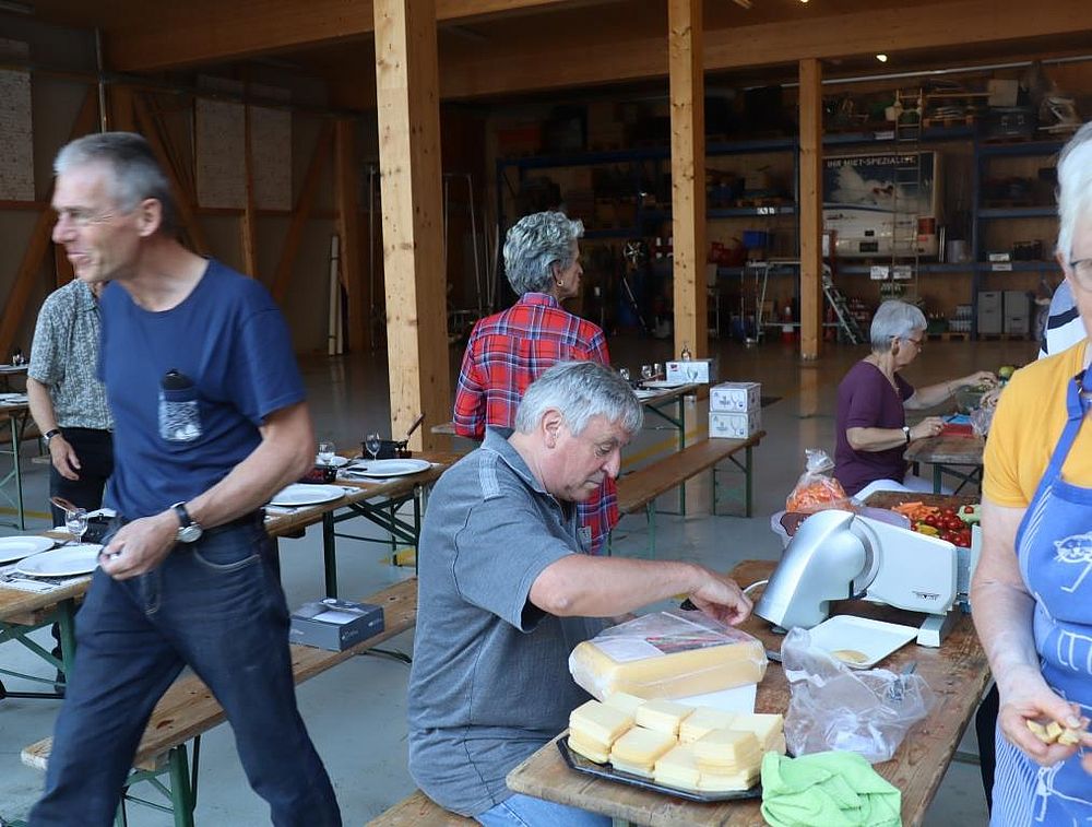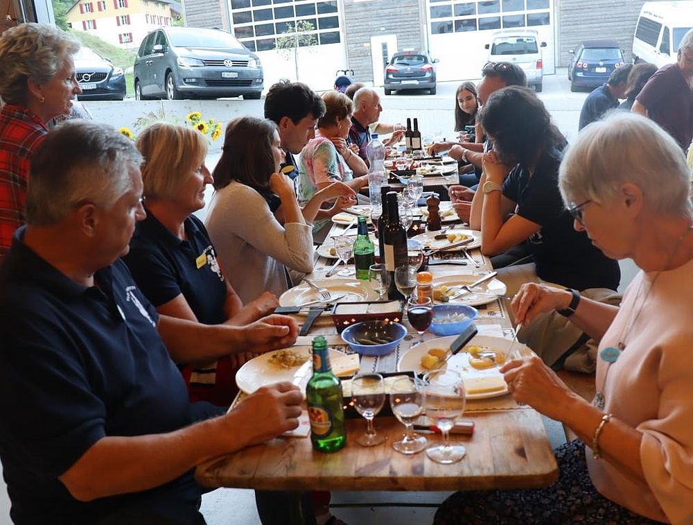 Um 17.30 Uhr steigt die Gruppe wieder in den Car und begleitet von Sämi geht die Fahrt via Rheinfelden, Magden, Gelterkinden nach Rümlingen zur Einstellhalle der ANK. Freundlicherweise wird uns die leere Halle von der ANK für diesen Abend zur Verfügung gestellt. Fleissige Hände stellen wiederum Tische auf, decken sie ein, schnipseln Gemüse für den Apéro und Früchte für den Fruchtsalat, kochen Kartoffeln, schneiden Käse und noch vieles mehr. Beim Eintreffen des Cars ist auf alle Fälle alles bereit und es kann losgehen mit dem Apéro und nachher mit einem feinen Raclette. Als alle satt sind machen sich die Musikanten der “Glasinger“ und die Ländlerkapelle Wartebärg bereit zum Musizieren und auch Elisabeth mit dem Örgeli ist mit von der Partie. Wie schon am Vorabend spielen wenn immer möglich alle Musikanten und Musikantinnen zusammen, es macht Freude, zu diesen Klängen zu tanzen. Es bleibt kaum Zeit fürs Dessert und schon machen sich unsere Freunde wieder auf den Weg nach Muttenz, von diesem ereignisreichen Tag sind alle müde und freuen sich auf ein Bett – wir auch, nachdem alles wieder aufgeräumt, das ganze Material in die Autos verteilt ist und wir zurück ins Unterbaselbiet fahren können.