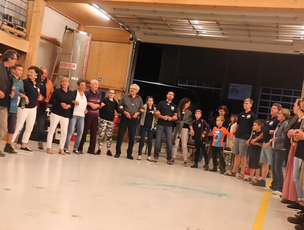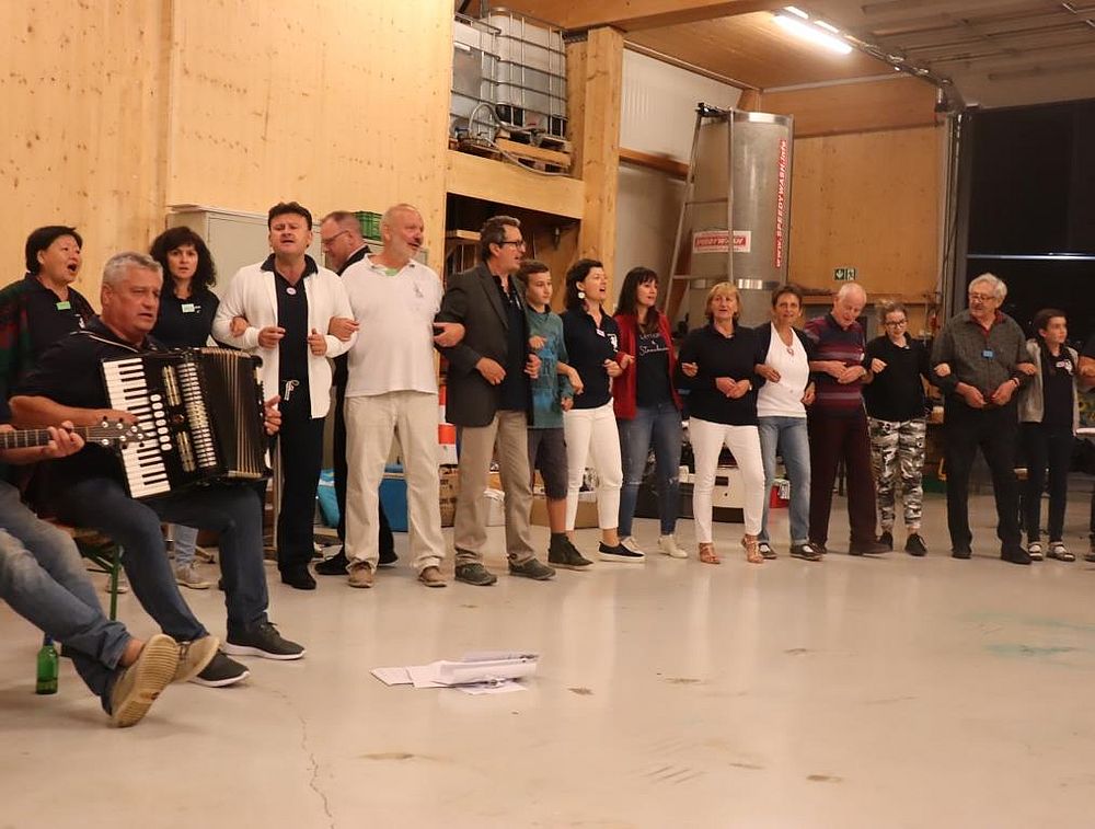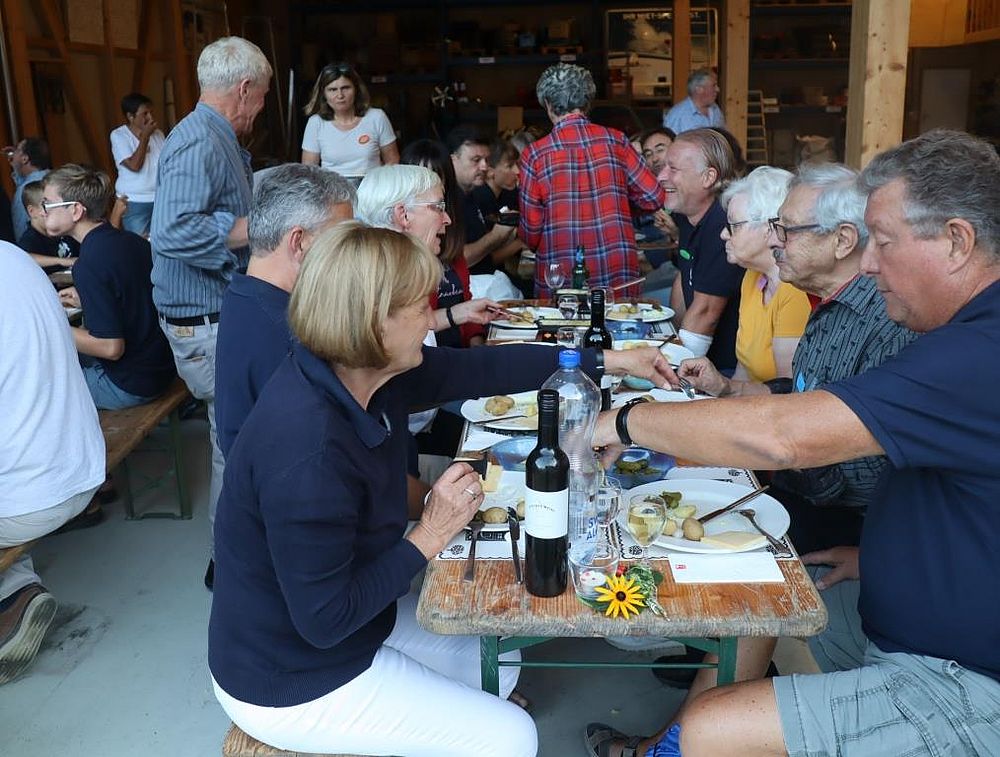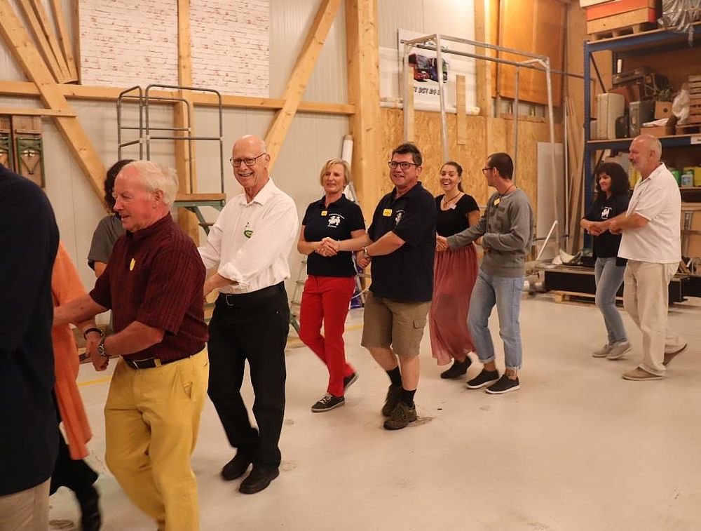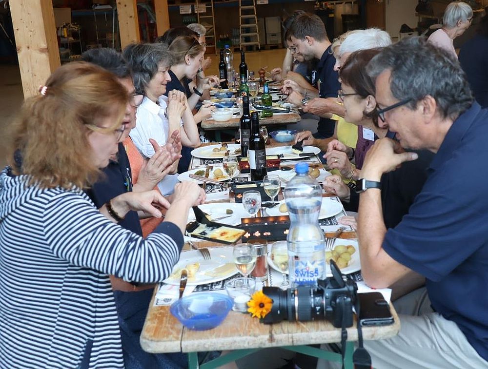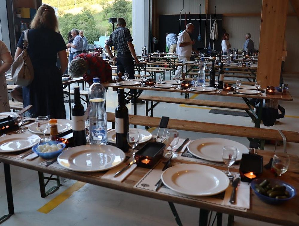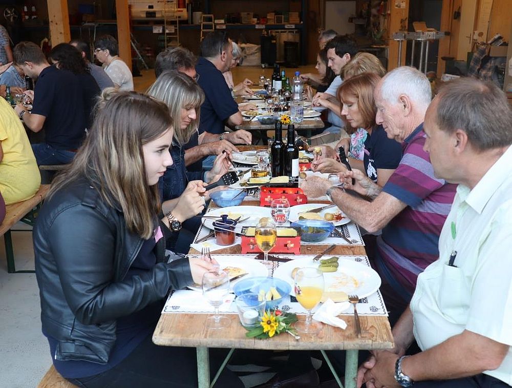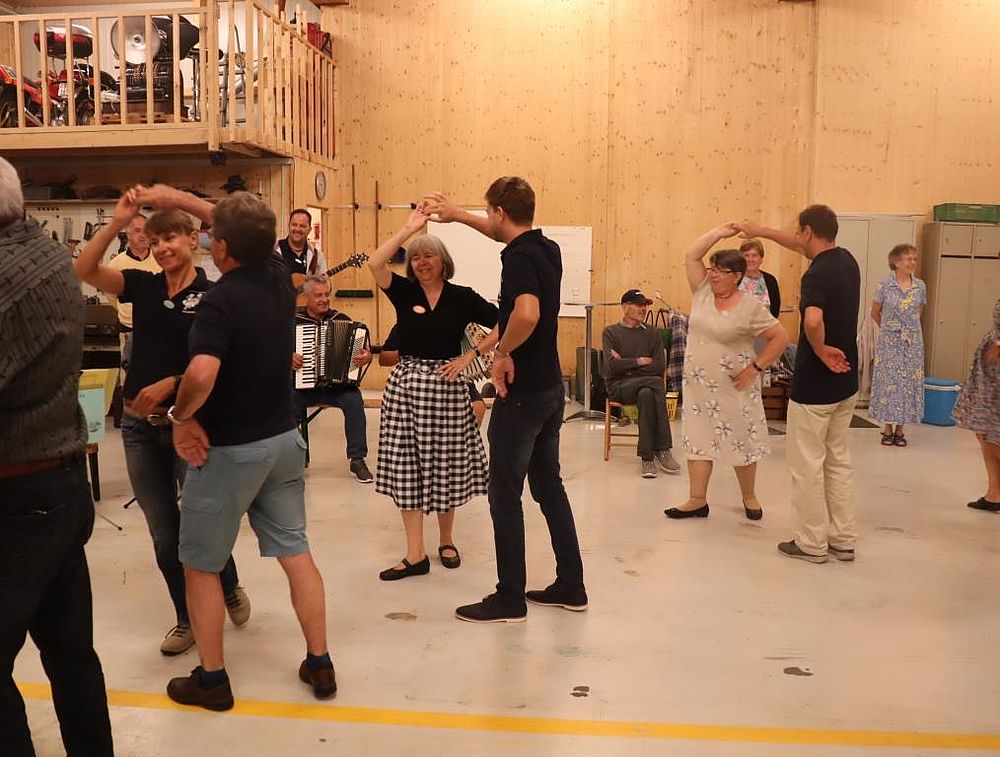 Um 17.30 Uhr steigt die Gruppe wieder in den Car und begleitet von Sämi geht die Fahrt via Rheinfelden, Magden, Gelterkinden nach Rümlingen zur Einstellhalle der ANK. Freundlicherweise wird uns die leere Halle von der ANK für diesen Abend zur Verfügung gestellt. Fleissige Hände stellen wiederum Tische auf, decken sie ein, schnipseln Gemüse für den Apéro und Früchte für den Fruchtsalat, kochen Kartoffeln, schneiden Käse und noch vieles mehr. Beim Eintreffen des Cars ist auf alle Fälle alles bereit und es kann losgehen mit dem Apéro und nachher mit einem feinen Raclette. Als alle satt sind machen sich die Musikanten der “Glasinger“ und die Ländlerkapelle Wartebärg bereit zum Musizieren und auch Elisabeth mit dem Örgeli ist mit von der Partie. Wie schon am Vorabend spielen wenn immer möglich alle Musikanten und Musikantinnen zusammen, es macht Freude, zu diesen Klängen zu tanzen. Es bleibt kaum Zeit fürs Dessert und schon machen sich unsere Freunde wieder auf den Weg nach Muttenz, von diesem ereignisreichen Tag sind alle müde und freuen sich auf ein Bett – wir auch, nachdem alles wieder aufgeräumt, das ganze Material in die Autos verteilt ist und wir zurück ins Unterbaselbiet fahren können.