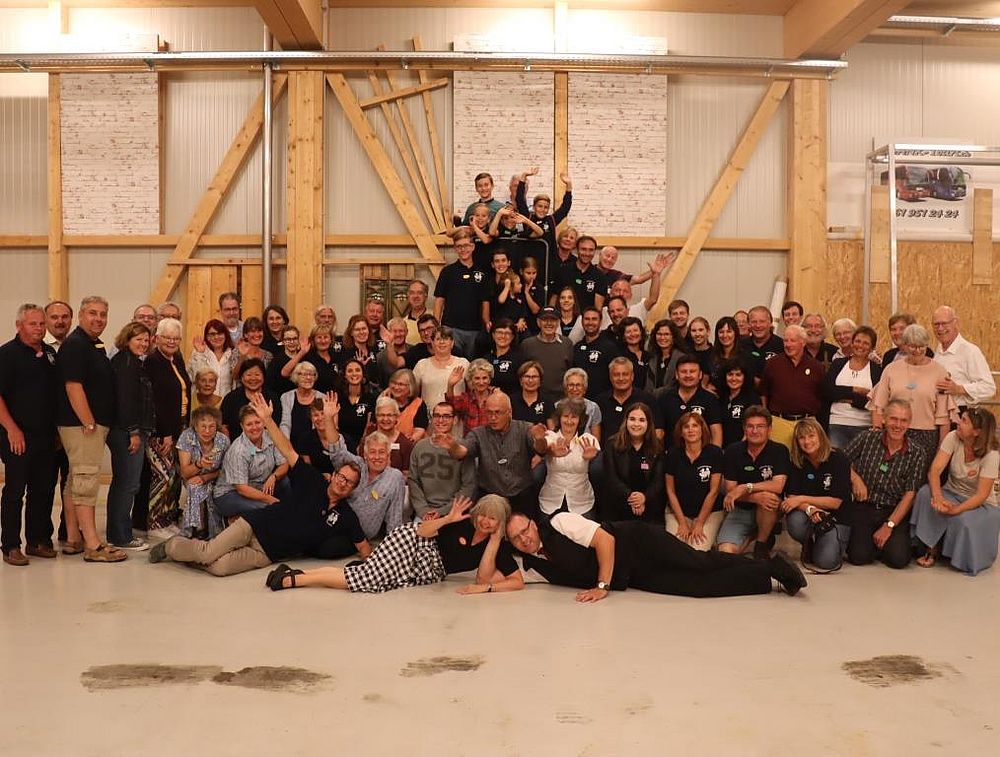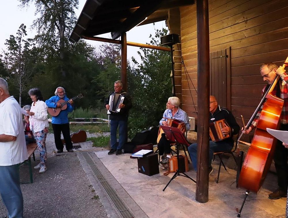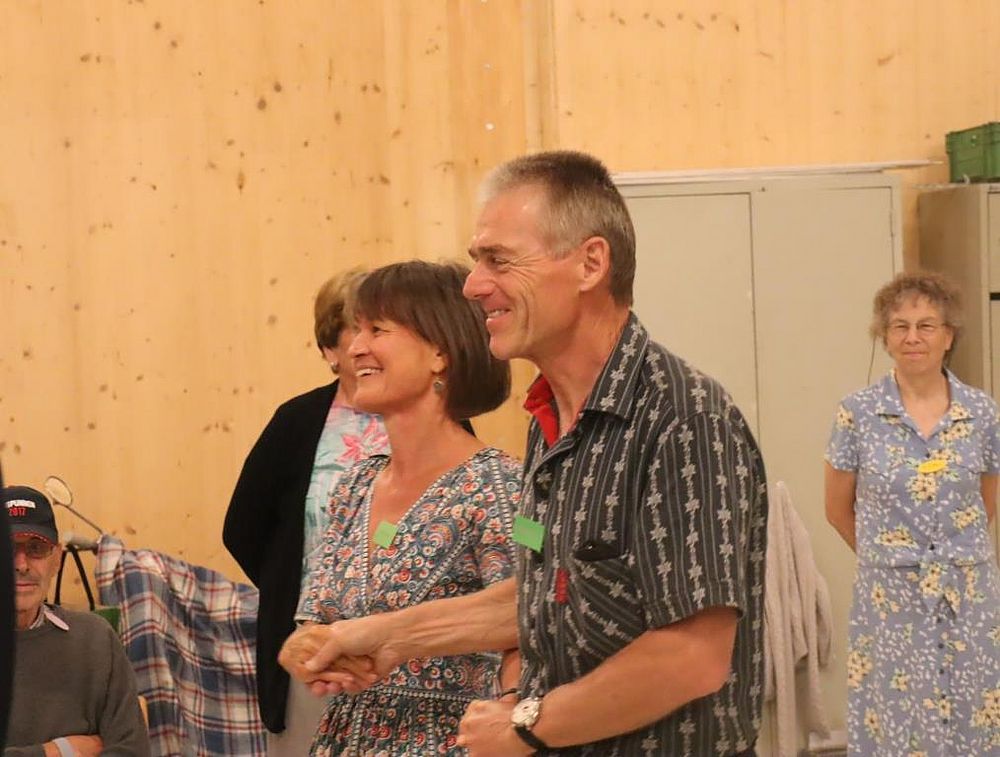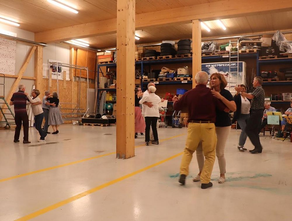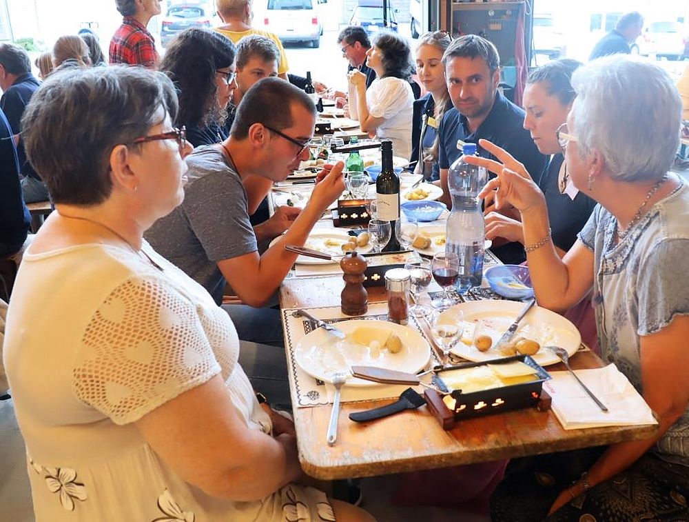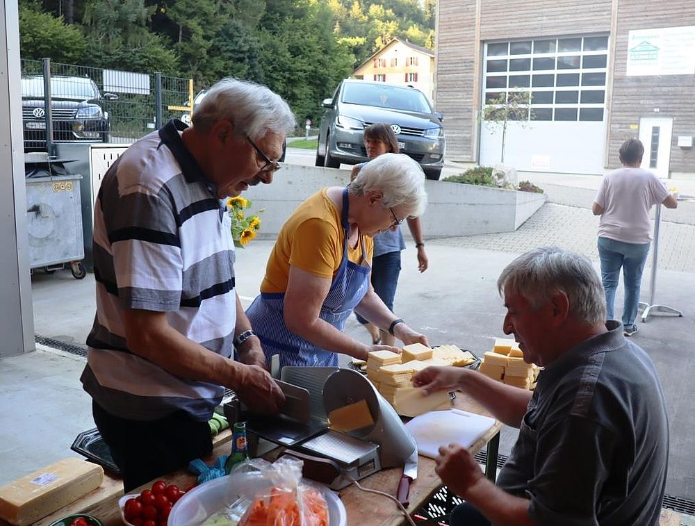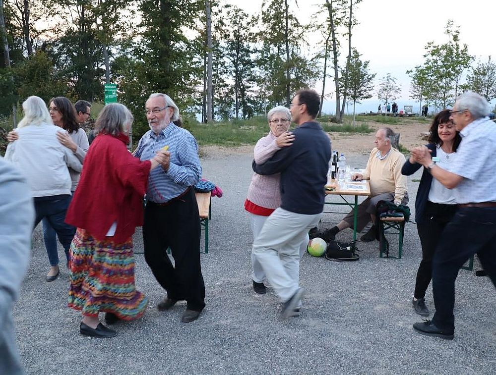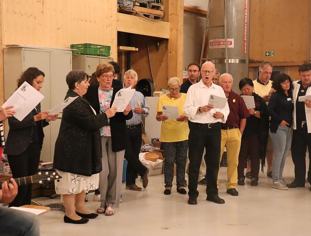 Um 17.30 Uhr steigt die Gruppe wieder in den Car und begleitet von Sämi geht die Fahrt via Rheinfelden, Magden, Gelterkinden nach Rümlingen zur Einstellhalle der ANK. Freundlicherweise wird uns die leere Halle von der ANK für diesen Abend zur Verfügung gestellt. Fleissige Hände stellen wiederum Tische auf, decken sie ein, schnipseln Gemüse für den Apéro und Früchte für den Fruchtsalat, kochen Kartoffeln, schneiden Käse und noch vieles mehr. Beim Eintreffen des Cars ist auf alle Fälle alles bereit und es kann losgehen mit dem Apéro und nachher mit einem feinen Raclette. Als alle satt sind machen sich die Musikanten der “Glasinger“ und die Ländlerkapelle Wartebärg bereit zum Musizieren und auch Elisabeth mit dem Örgeli ist mit von der Partie. Wie schon am Vorabend spielen wenn immer möglich alle Musikanten und Musikantinnen zusammen, es macht Freude, zu diesen Klängen zu tanzen. Es bleibt kaum Zeit fürs Dessert und schon machen sich unsere Freunde wieder auf den Weg nach Muttenz, von diesem ereignisreichen Tag sind alle müde und freuen sich auf ein Bett – wir auch, nachdem alles wieder aufgeräumt, das ganze Material in die Autos verteilt ist und wir zurück ins Unterbaselbiet fahren können.