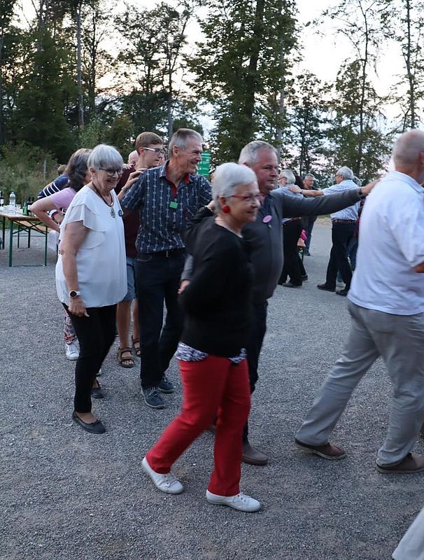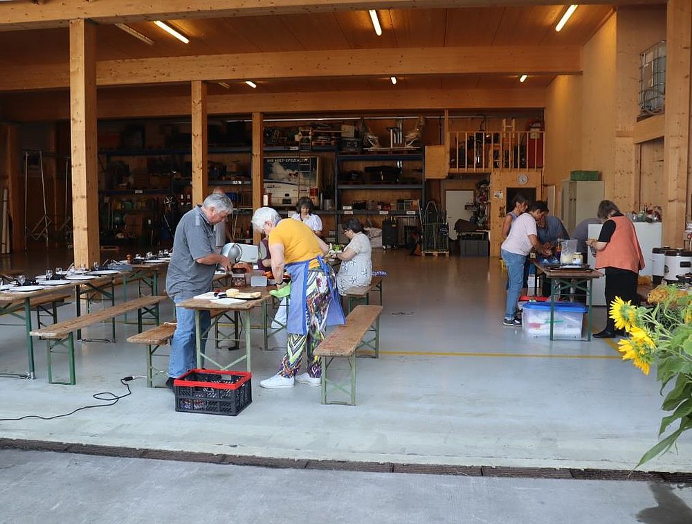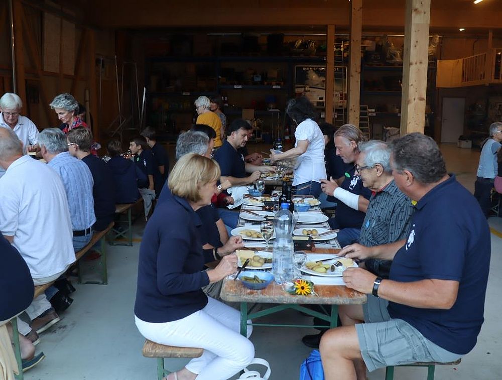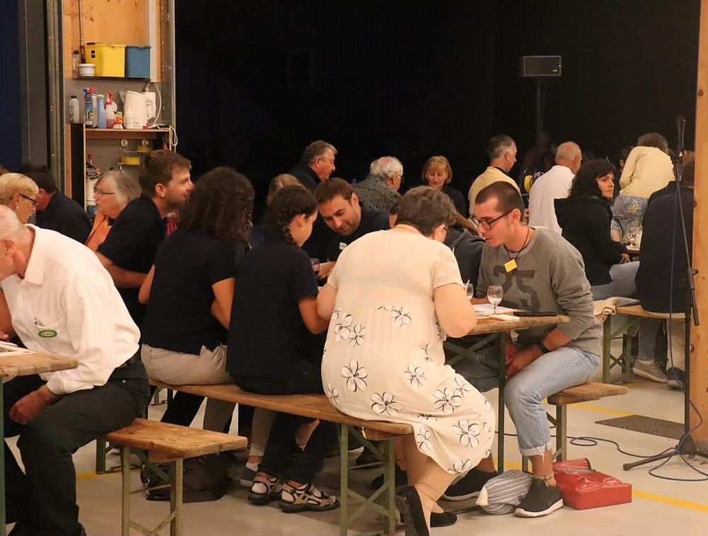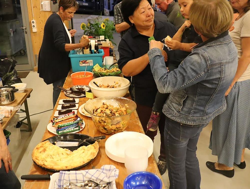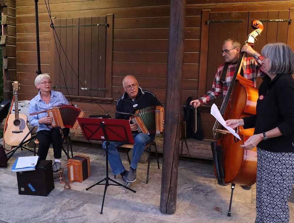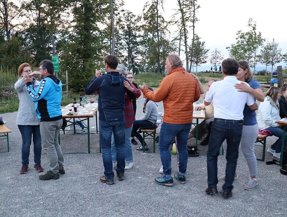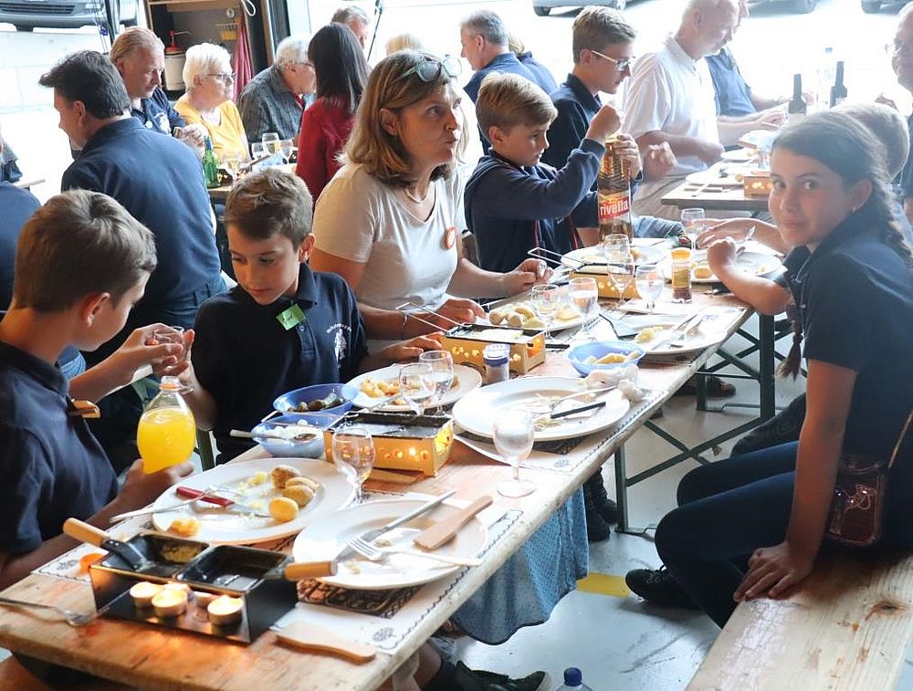 Um 17.30 Uhr steigt die Gruppe wieder in den Car und begleitet von Sämi geht die Fahrt via Rheinfelden, Magden, Gelterkinden nach Rümlingen zur Einstellhalle der ANK. Freundlicherweise wird uns die leere Halle von der ANK für diesen Abend zur Verfügung gestellt. Fleissige Hände stellen wiederum Tische auf, decken sie ein, schnipseln Gemüse für den Apéro und Früchte für den Fruchtsalat, kochen Kartoffeln, schneiden Käse und noch vieles mehr. Beim Eintreffen des Cars ist auf alle Fälle alles bereit und es kann losgehen mit dem Apéro und nachher mit einem feinen Raclette. Als alle satt sind machen sich die Musikanten der “Glasinger“ und die Ländlerkapelle Wartebärg bereit zum Musizieren und auch Elisabeth mit dem Örgeli ist mit von der Partie. Wie schon am Vorabend spielen wenn immer möglich alle Musikanten und Musikantinnen zusammen, es macht Freude, zu diesen Klängen zu tanzen. Es bleibt kaum Zeit fürs Dessert und schon machen sich unsere Freunde wieder auf den Weg nach Muttenz, von diesem ereignisreichen Tag sind alle müde und freuen sich auf ein Bett – wir auch, nachdem alles wieder aufgeräumt, das ganze Material in die Autos verteilt ist und wir zurück ins Unterbaselbiet fahren können.