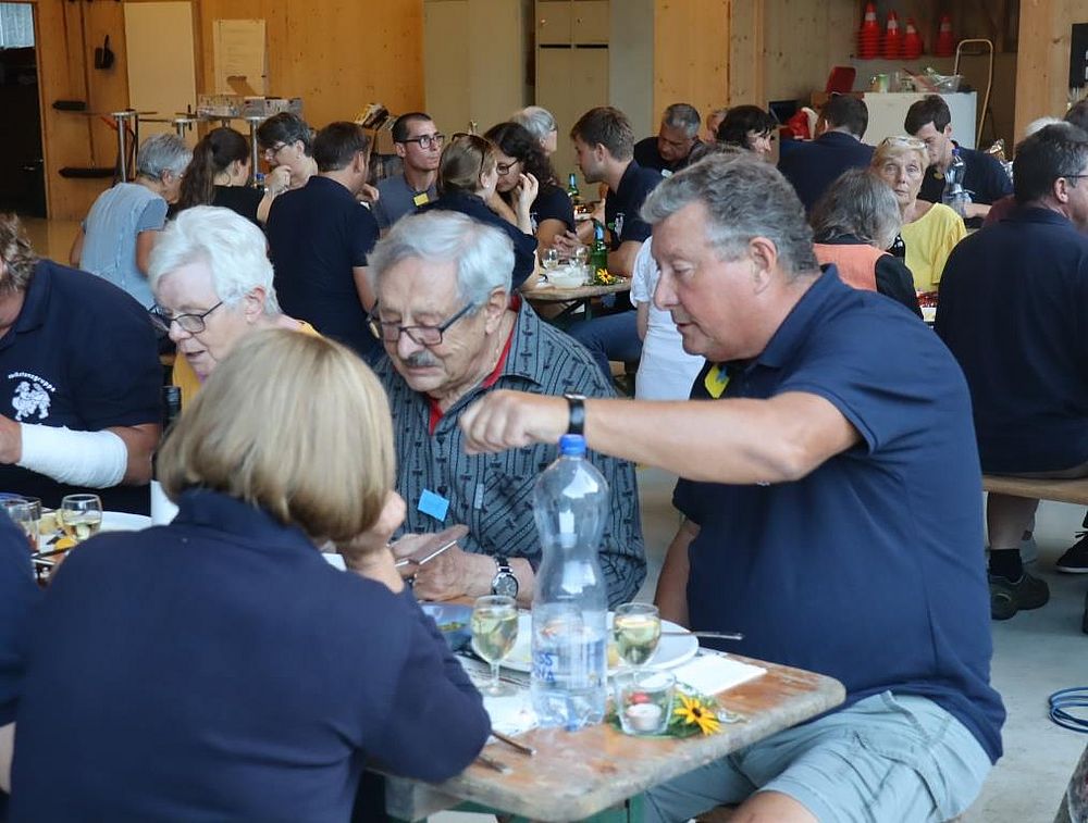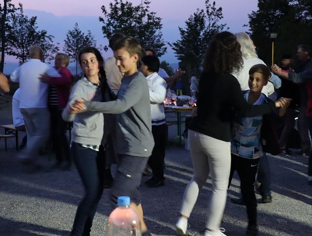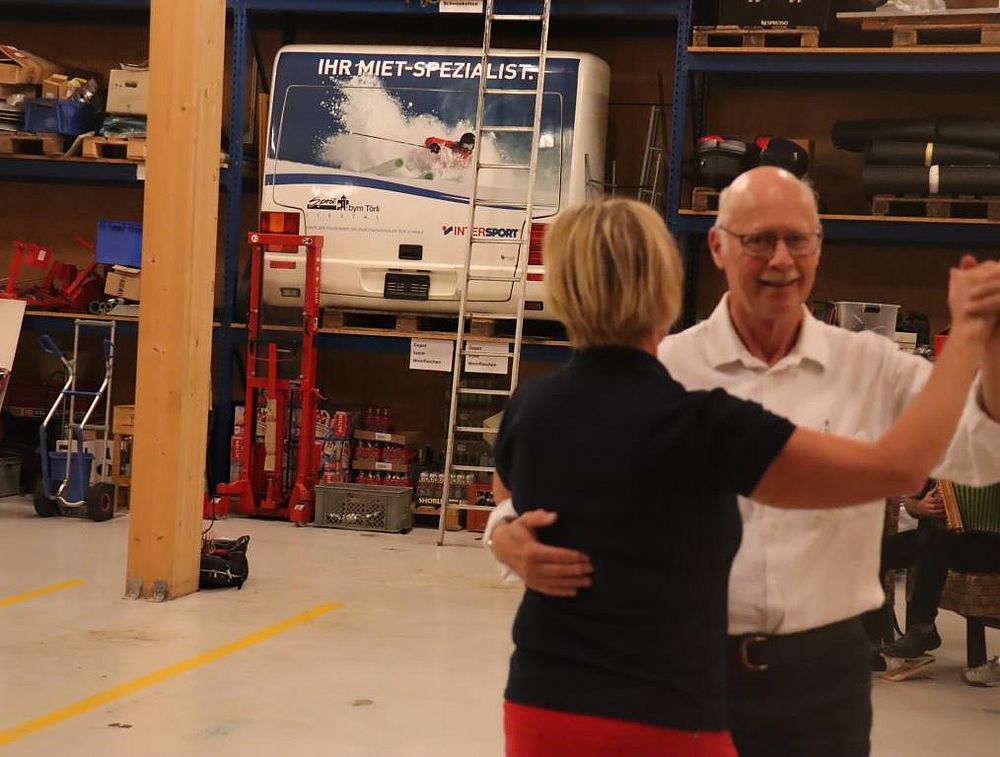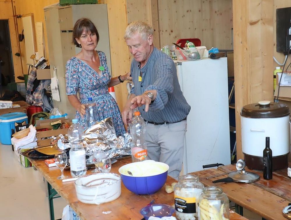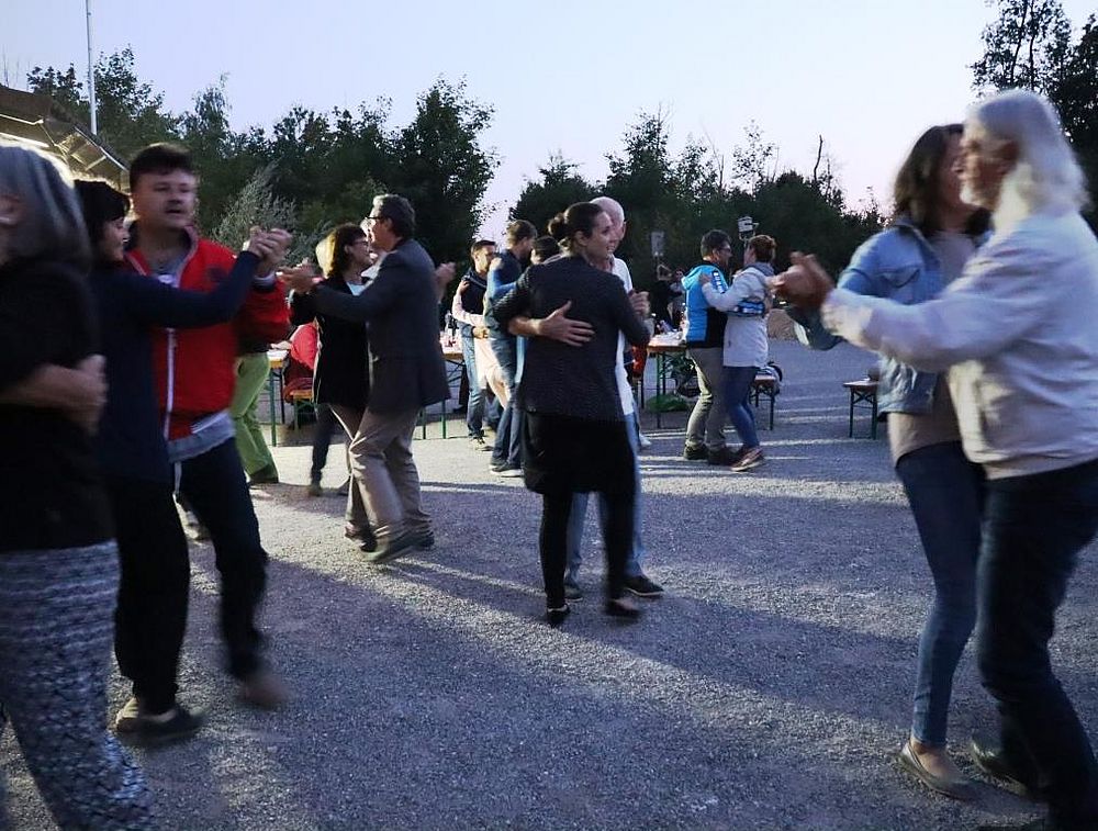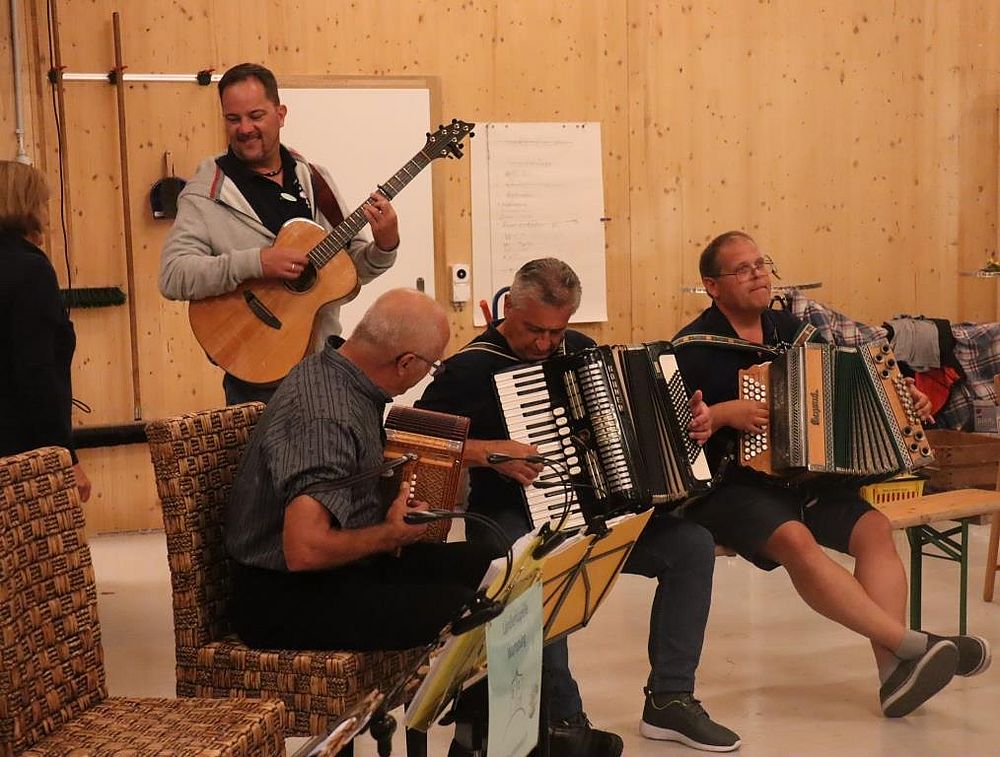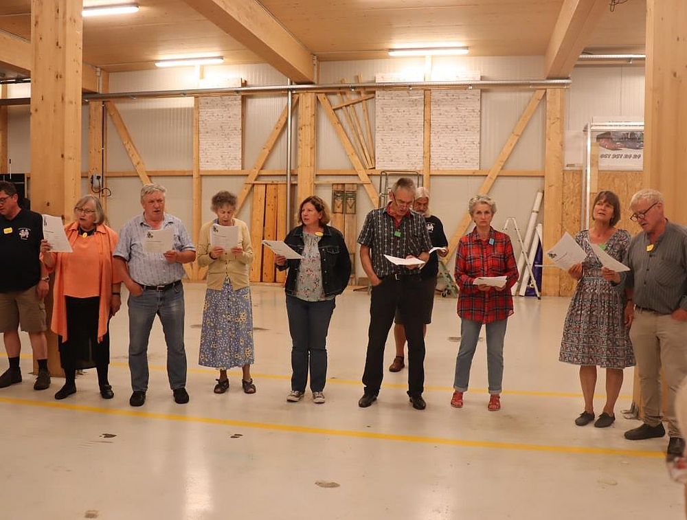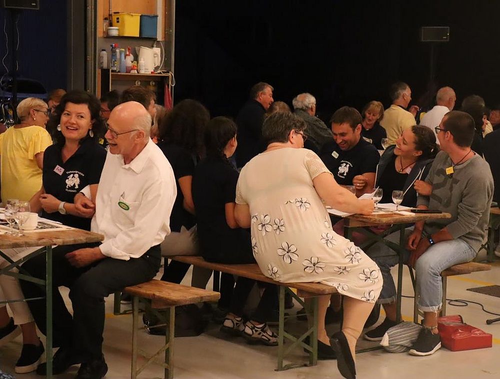 Um 17.30 Uhr steigt die Gruppe wieder in den Car und begleitet von Sämi geht die Fahrt via Rheinfelden, Magden, Gelterkinden nach Rümlingen zur Einstellhalle der ANK. Freundlicherweise wird uns die leere Halle von der ANK für diesen Abend zur Verfügung gestellt. Fleissige Hände stellen wiederum Tische auf, decken sie ein, schnipseln Gemüse für den Apéro und Früchte für den Fruchtsalat, kochen Kartoffeln, schneiden Käse und noch vieles mehr. Beim Eintreffen des Cars ist auf alle Fälle alles bereit und es kann losgehen mit dem Apéro und nachher mit einem feinen Raclette. Als alle satt sind machen sich die Musikanten der “Glasinger“ und die Ländlerkapelle Wartebärg bereit zum Musizieren und auch Elisabeth mit dem Örgeli ist mit von der Partie. Wie schon am Vorabend spielen wenn immer möglich alle Musikanten und Musikantinnen zusammen, es macht Freude, zu diesen Klängen zu tanzen. Es bleibt kaum Zeit fürs Dessert und schon machen sich unsere Freunde wieder auf den Weg nach Muttenz, von diesem ereignisreichen Tag sind alle müde und freuen sich auf ein Bett – wir auch, nachdem alles wieder aufgeräumt, das ganze Material in die Autos verteilt ist und wir zurück ins Unterbaselbiet fahren können.