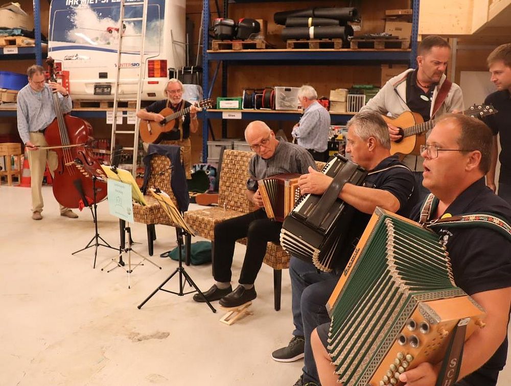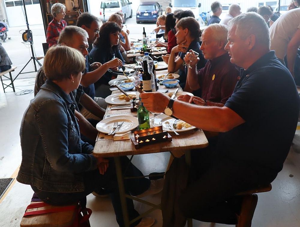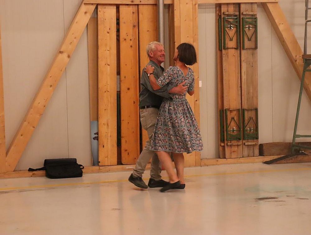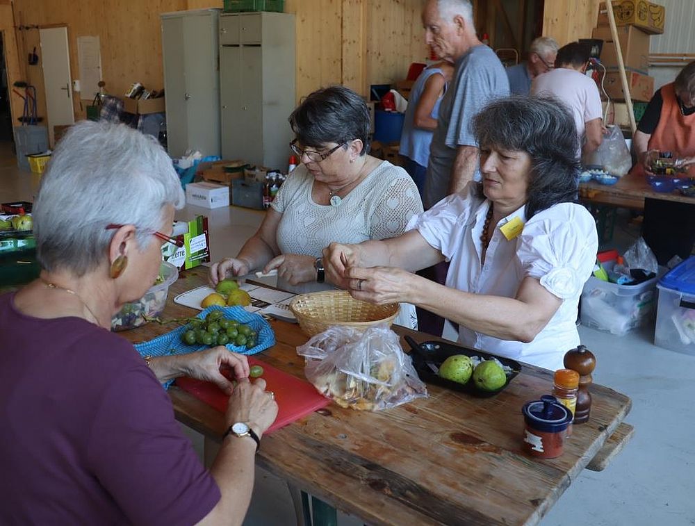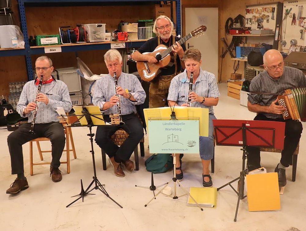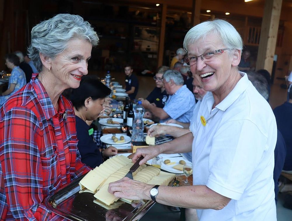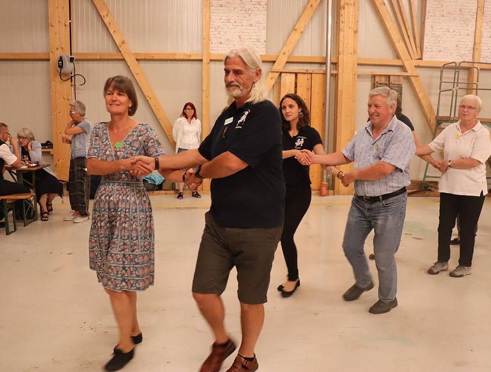 Um 17.30 Uhr steigt die Gruppe wieder in den Car und begleitet von Sämi geht die Fahrt via Rheinfelden, Magden, Gelterkinden nach Rümlingen zur Einstellhalle der ANK. Freundlicherweise wird uns die leere Halle von der ANK für diesen Abend zur Verfügung gestellt. Fleissige Hände stellen wiederum Tische auf, decken sie ein, schnipseln Gemüse für den Apéro und Früchte für den Fruchtsalat, kochen Kartoffeln, schneiden Käse und noch vieles mehr. Beim Eintreffen des Cars ist auf alle Fälle alles bereit und es kann losgehen mit dem Apéro und nachher mit einem feinen Raclette. Als alle satt sind machen sich die Musikanten der “Glasinger“ und die Ländlerkapelle Wartebärg bereit zum Musizieren und auch Elisabeth mit dem Örgeli ist mit von der Partie. Wie schon am Vorabend spielen wenn immer möglich alle Musikanten und Musikantinnen zusammen, es macht Freude, zu diesen Klängen zu tanzen. Es bleibt kaum Zeit fürs Dessert und schon machen sich unsere Freunde wieder auf den Weg nach Muttenz, von diesem ereignisreichen Tag sind alle müde und freuen sich auf ein Bett – wir auch, nachdem alles wieder aufgeräumt, das ganze Material in die Autos verteilt ist und wir zurück ins Unterbaselbiet fahren können.