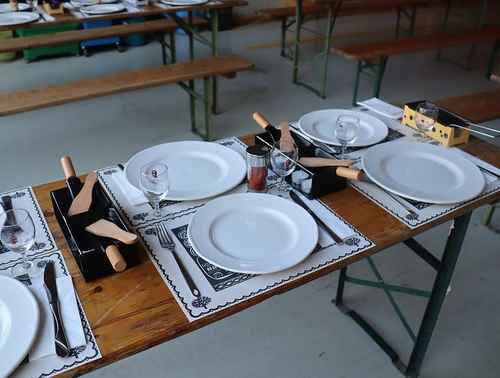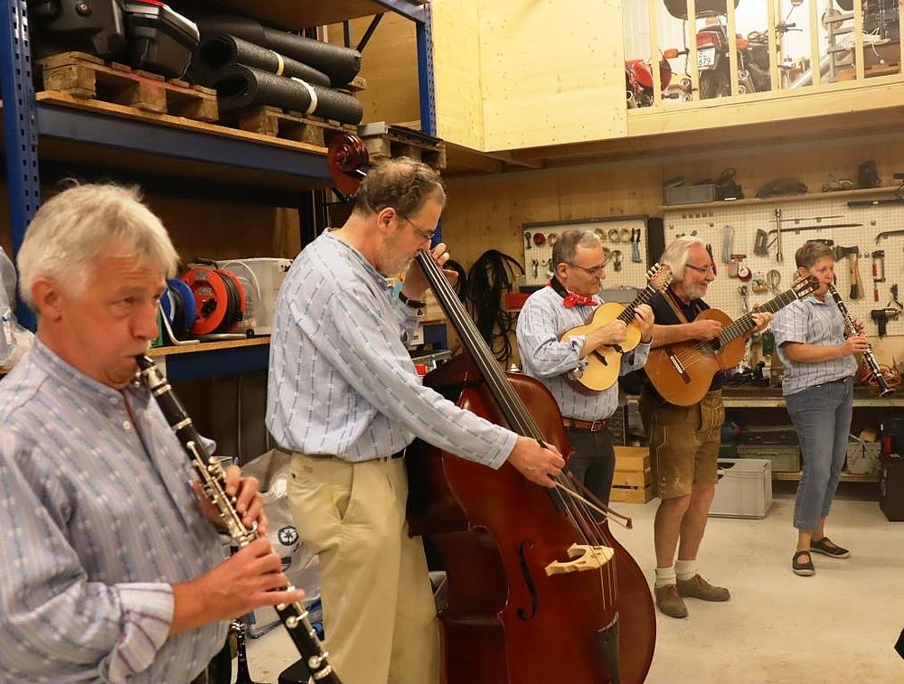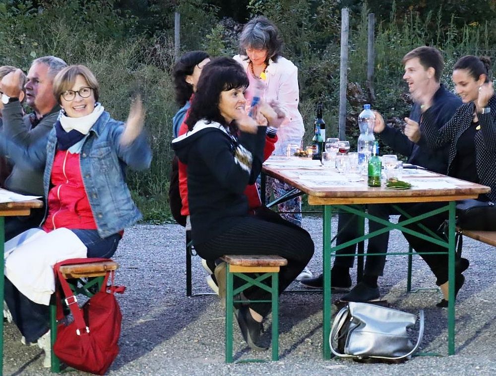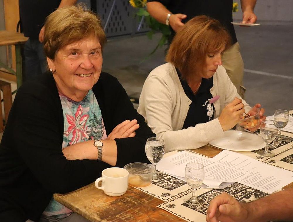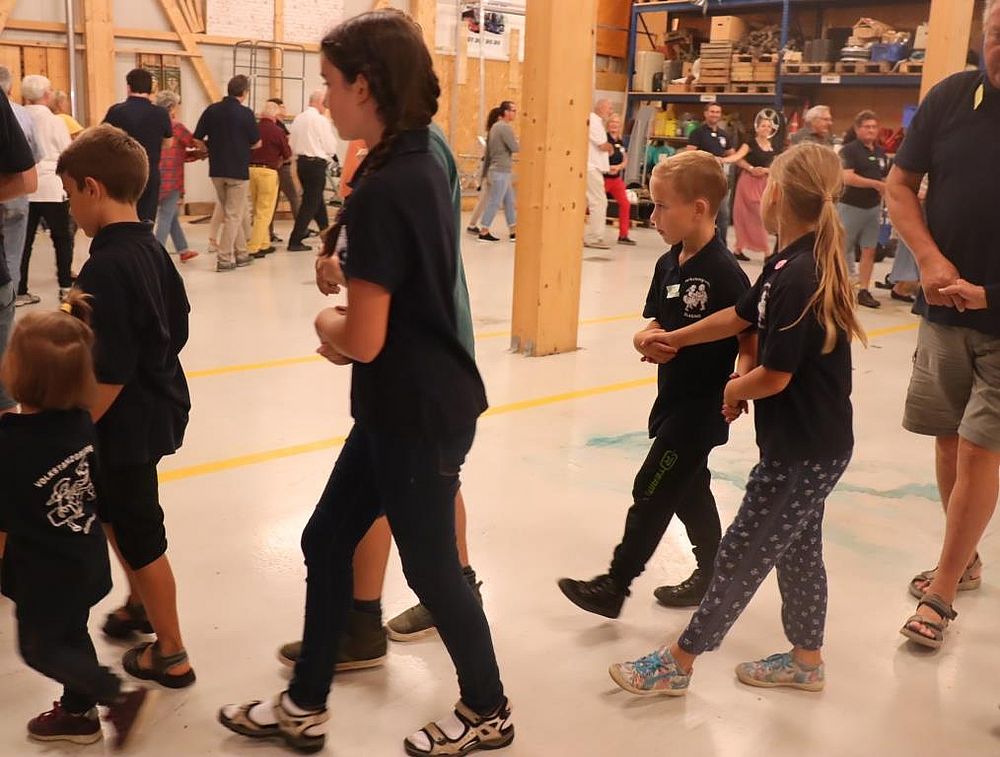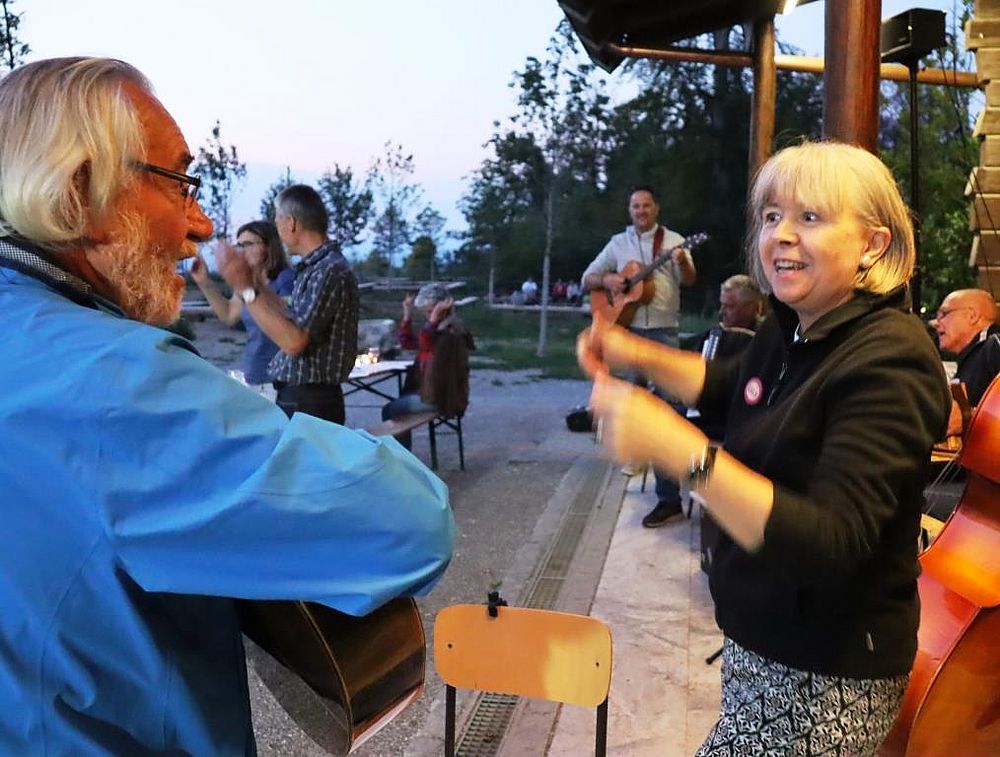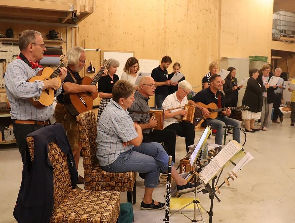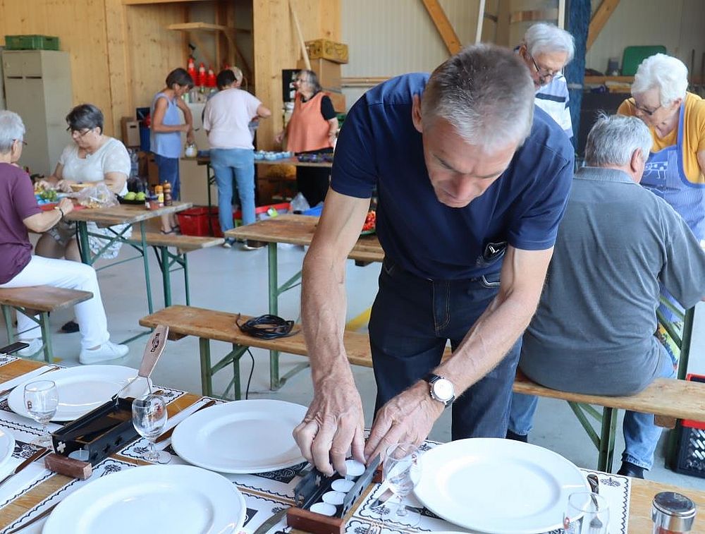 Um 17.30 Uhr steigt die Gruppe wieder in den Car und begleitet von Sämi geht die Fahrt via Rheinfelden, Magden, Gelterkinden nach Rümlingen zur Einstellhalle der ANK. Freundlicherweise wird uns die leere Halle von der ANK für diesen Abend zur Verfügung gestellt. Fleissige Hände stellen wiederum Tische auf, decken sie ein, schnipseln Gemüse für den Apéro und Früchte für den Fruchtsalat, kochen Kartoffeln, schneiden Käse und noch vieles mehr. Beim Eintreffen des Cars ist auf alle Fälle alles bereit und es kann losgehen mit dem Apéro und nachher mit einem feinen Raclette. Als alle satt sind machen sich die Musikanten der “Glasinger“ und die Ländlerkapelle Wartebärg bereit zum Musizieren und auch Elisabeth mit dem Örgeli ist mit von der Partie. Wie schon am Vorabend spielen wenn immer möglich alle Musikanten und Musikantinnen zusammen, es macht Freude, zu diesen Klängen zu tanzen. Es bleibt kaum Zeit fürs Dessert und schon machen sich unsere Freunde wieder auf den Weg nach Muttenz, von diesem ereignisreichen Tag sind alle müde und freuen sich auf ein Bett – wir auch, nachdem alles wieder aufgeräumt, das ganze Material in die Autos verteilt ist und wir zurück ins Unterbaselbiet fahren können.