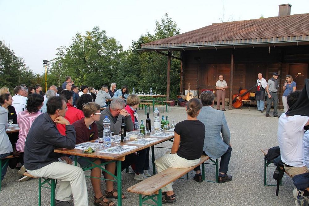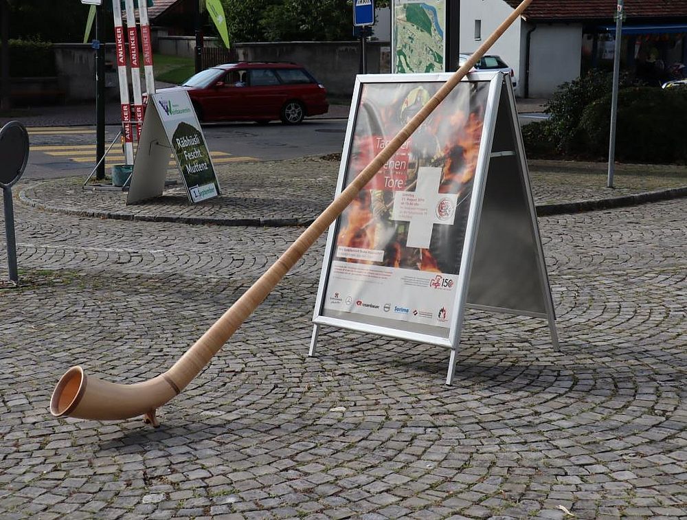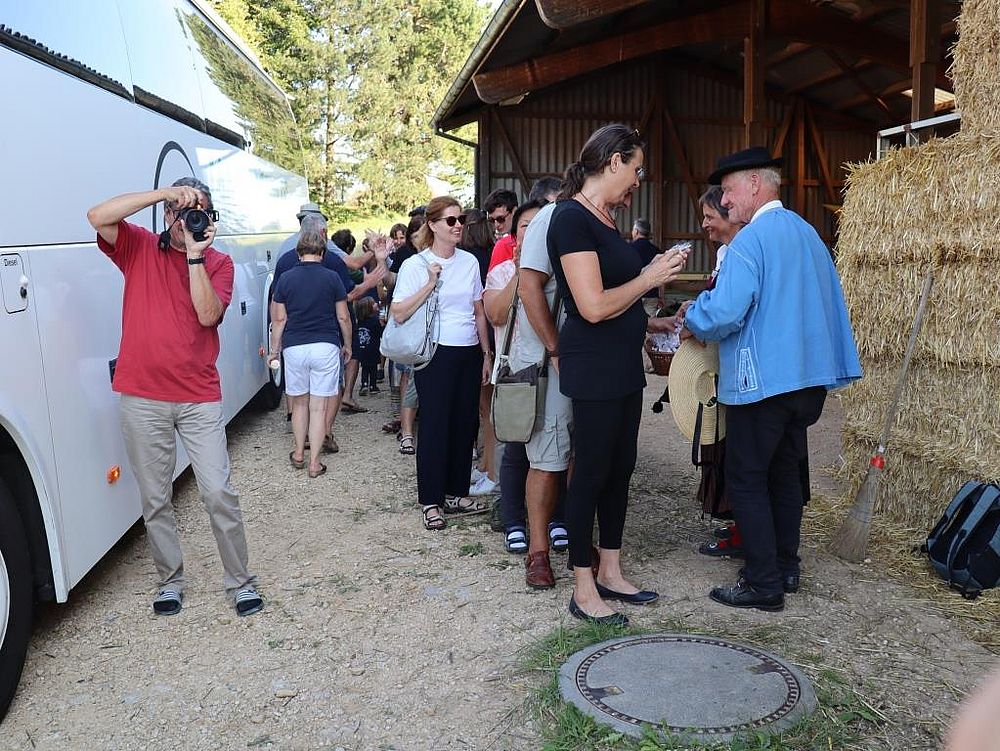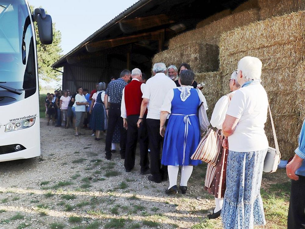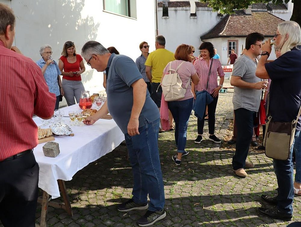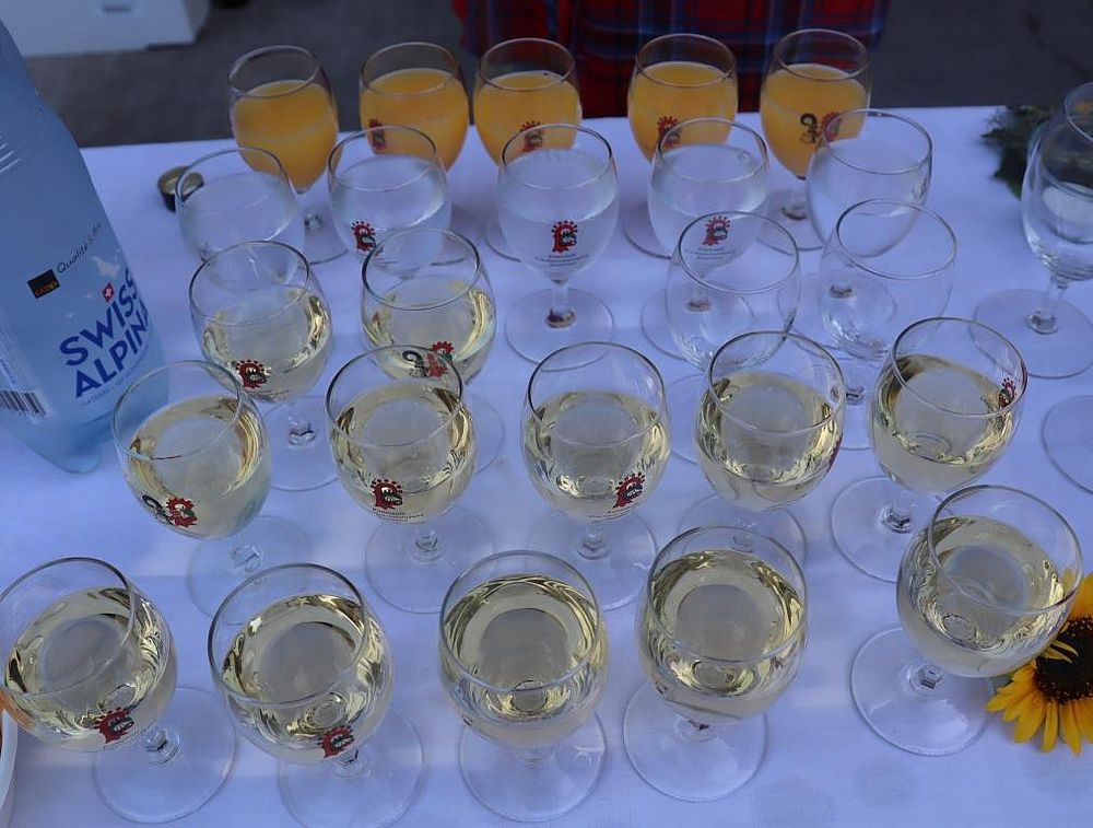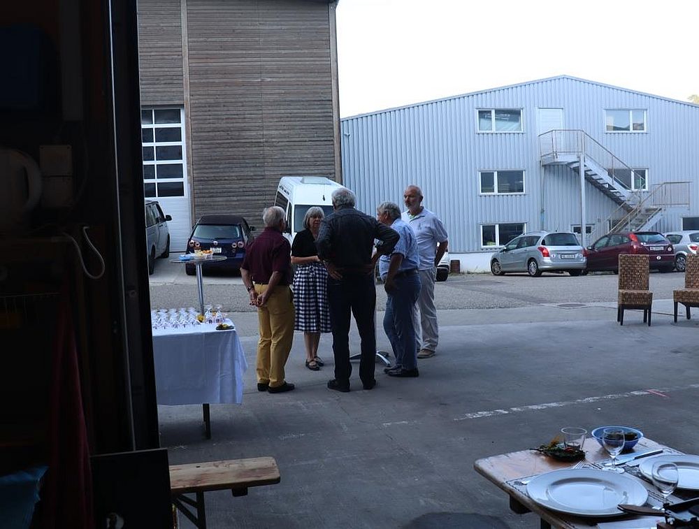 Am Freitagmorgen hole ich die Gäste, die nicht mit in Italien waren, am Flughafen ab. Nach einem Kaffee in meiner Küche sind die Hotelzimmer bezugsbereit. Während sich die Gäste etwas ausruhen, backe ich Brot und Zopf für den Empfangs-Apéro. Danach reicht die Zeit noch für einen kurzen Besuch auf dem Sulzchopf, wo wir den Abend verbringen werden und wo ein ganzes Heer von Trachtenleuten Tische deckt und dekoriert, Salate zubereitet und alles vorbereitet für den Risotto. Gerade als ich retour wollte, bekomme ich eine SMS, dass der Car mit unseren Gästen in Pratteln die Autobahn verlassen hat und in Bälde in Muttenz eintreffen wird. Zwei Minuten vor dem Car treffe ich bei der Dorfkirche ein und kann die Gäste empfangen und den Car einweisen.