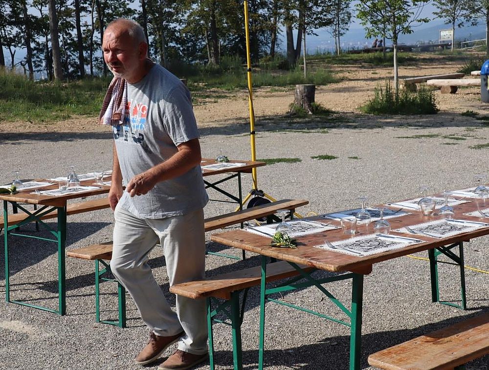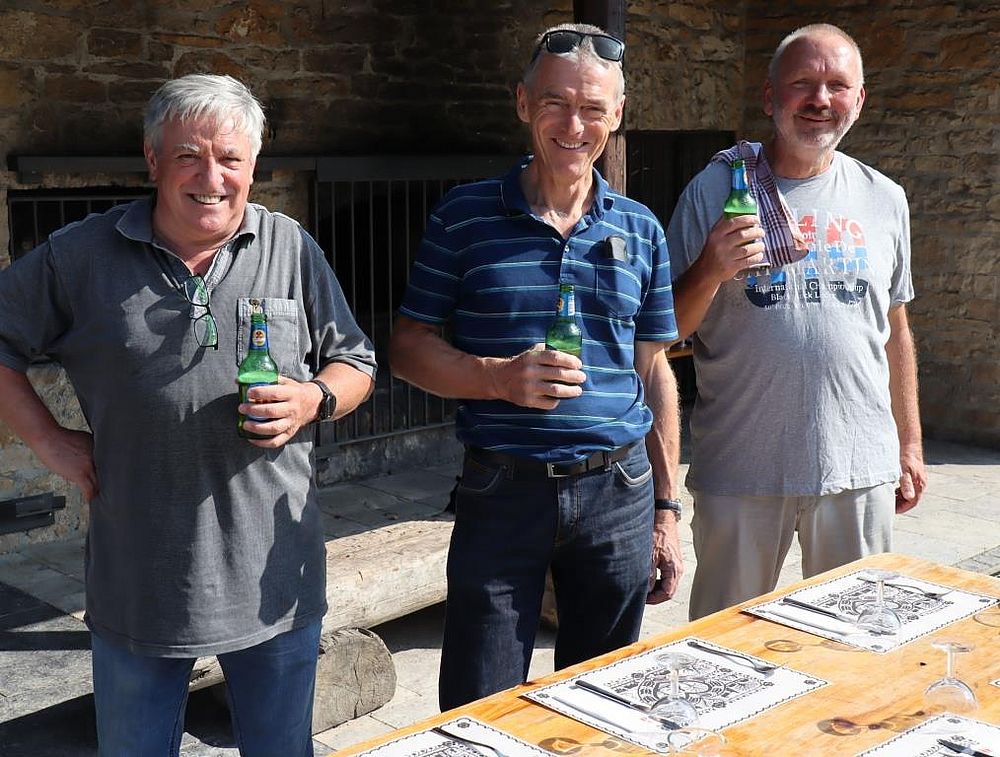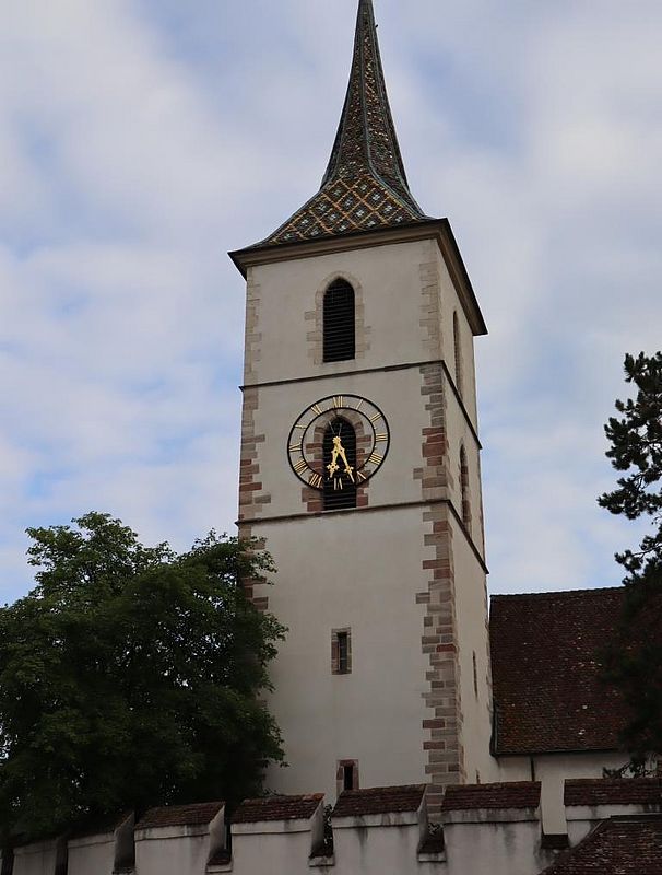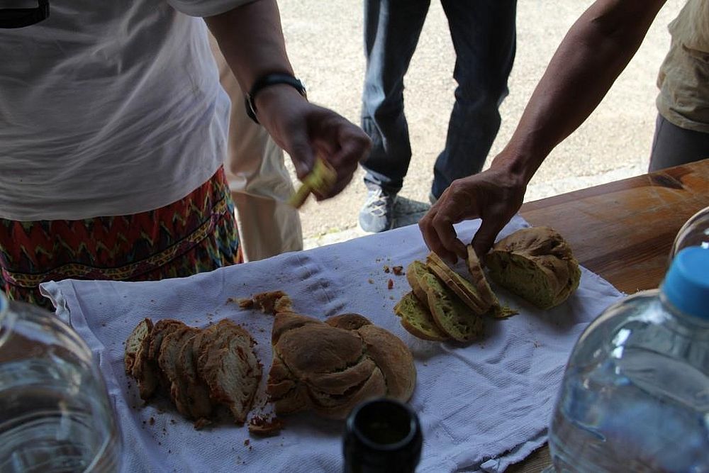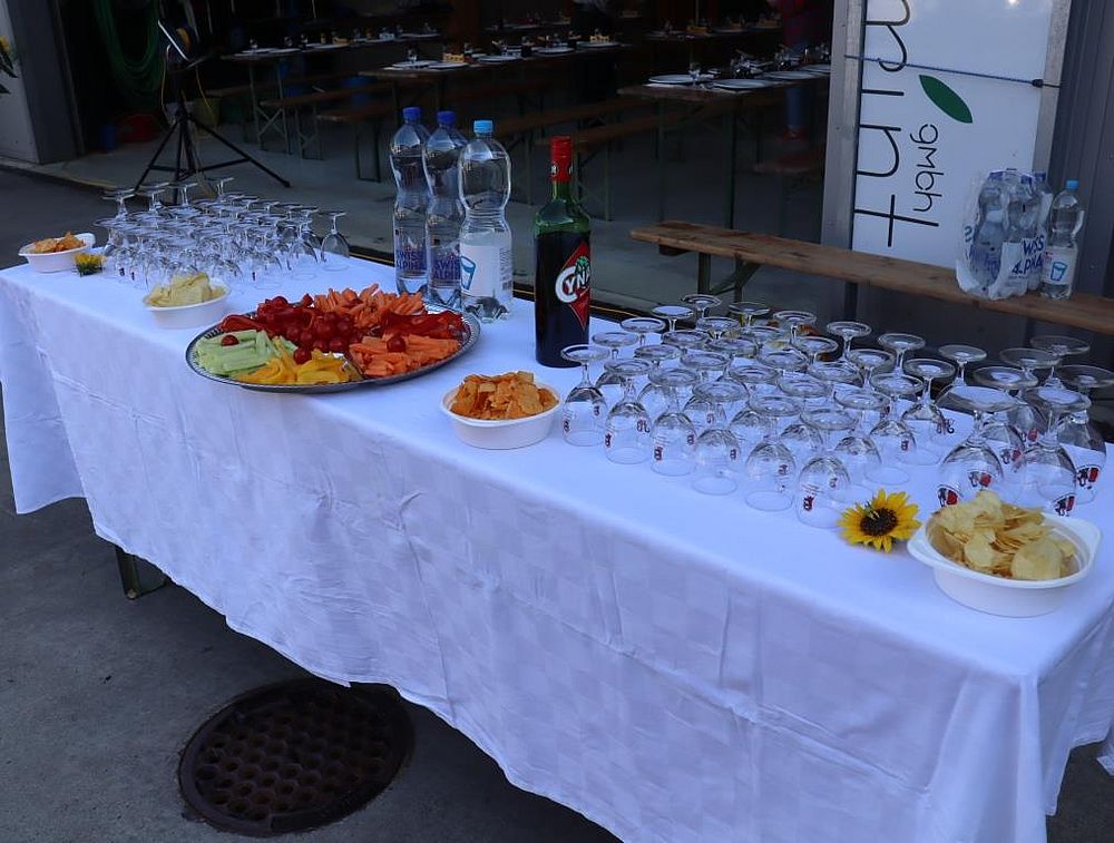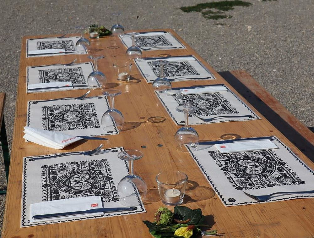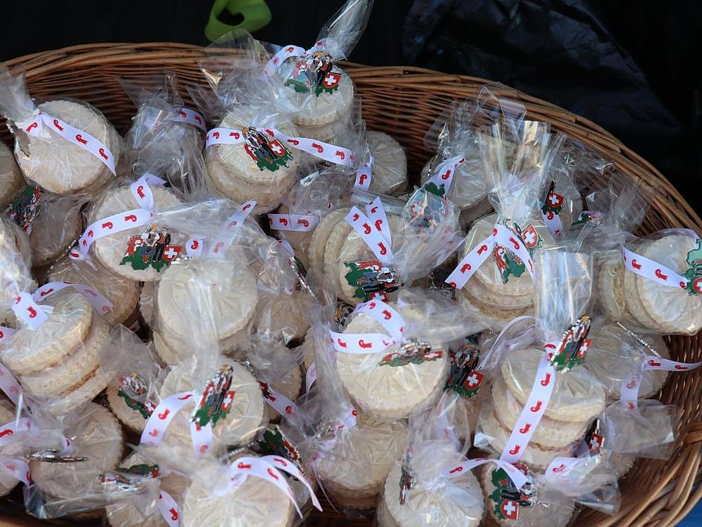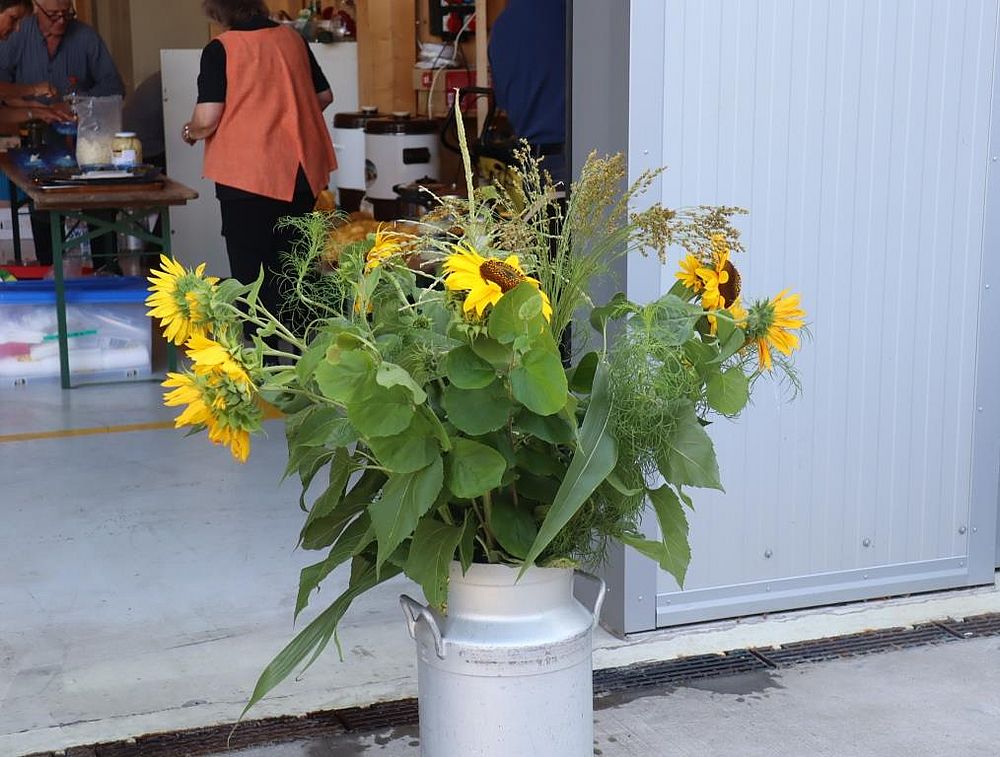 Am Freitagmorgen hole ich die Gäste, die nicht mit in Italien waren, am Flughafen ab. Nach einem Kaffee in meiner Küche sind die Hotelzimmer bezugsbereit. Während sich die Gäste etwas ausruhen, backe ich Brot und Zopf für den Empfangs-Apéro. Danach reicht die Zeit noch für einen kurzen Besuch auf dem Sulzchopf, wo wir den Abend verbringen werden und wo ein ganzes Heer von Trachtenleuten Tische deckt und dekoriert, Salate zubereitet und alles vorbereitet für den Risotto. Gerade als ich retour wollte, bekomme ich eine SMS, dass der Car mit unseren Gästen in Pratteln die Autobahn verlassen hat und in Bälde in Muttenz eintreffen wird. Zwei Minuten vor dem Car treffe ich bei der Dorfkirche ein und kann die Gäste empfangen und den Car einweisen.