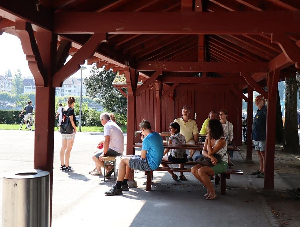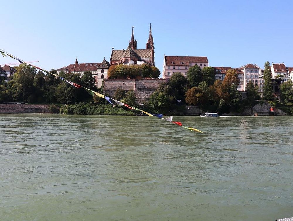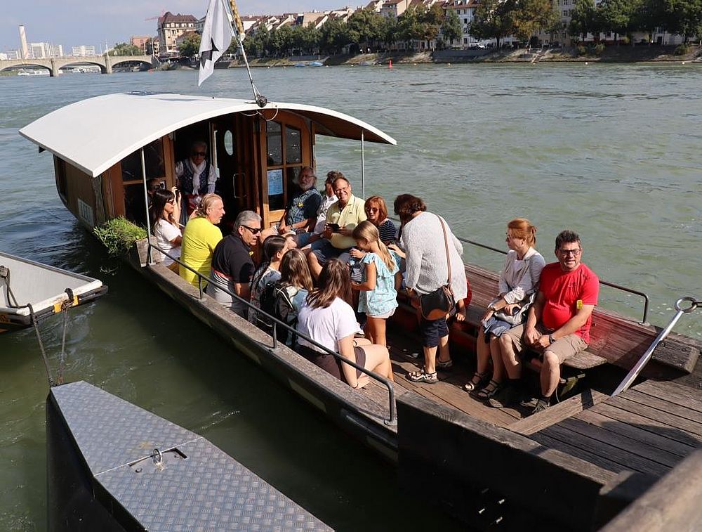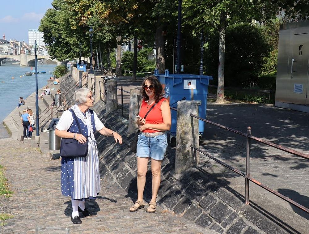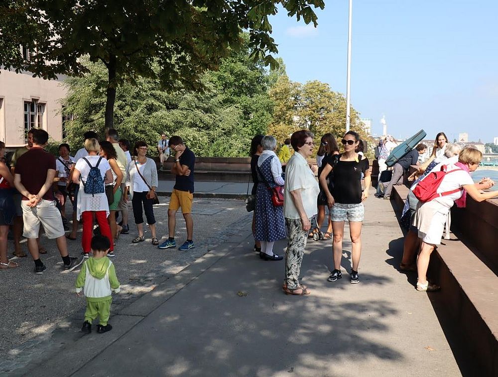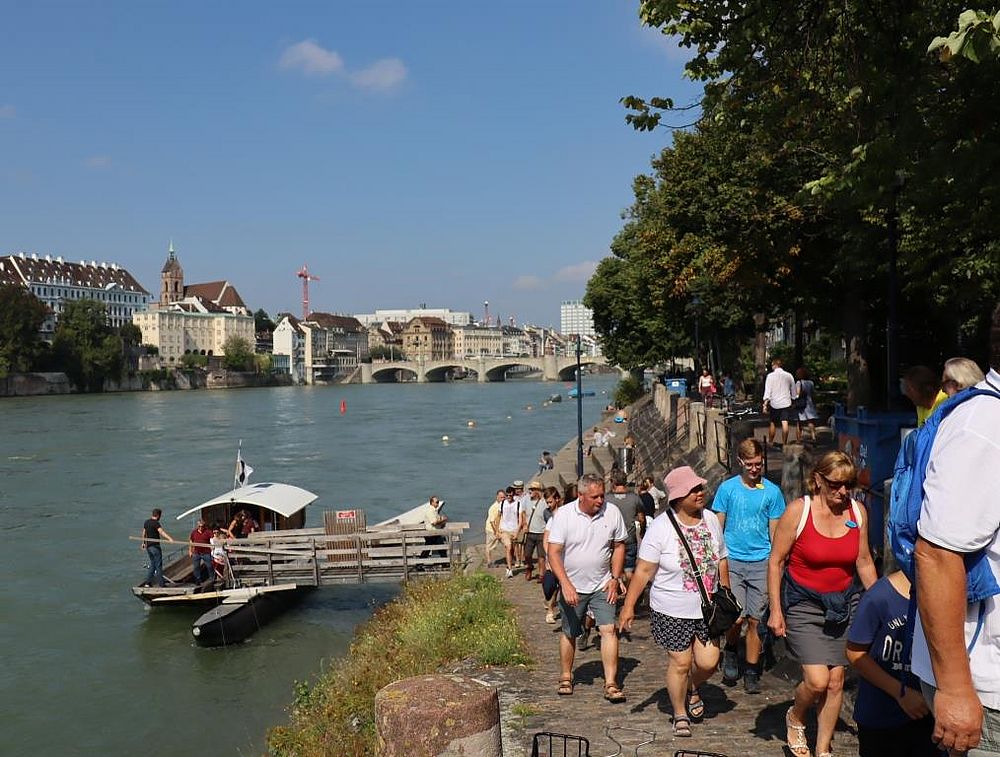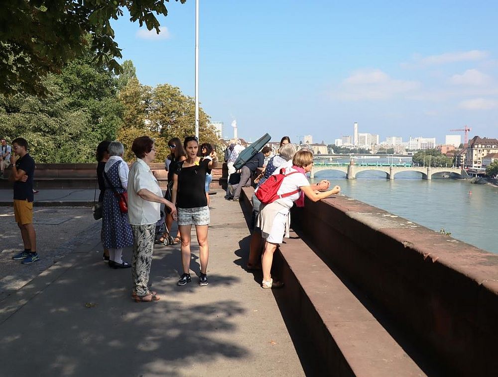 Am Samstag fahren unsere Gäste unter kundiger Reiseleitung von Margrit, Susi I. und Andrea nach Basel zum Sightseeing. Vom Marktplatz geht es zum Münsterplatz, zur Pfalz, runter zum Rhein, mit der Münsterfähre ins Kleinbasel und dort zum Solitude Park. Unterwegs entscheiden sich einige Mutige, bei dem schönen und warmen Wetter ein Bad im Rhein zu nehmen. Da erweist sich Werner, der zwischenzeitlich zur Gruppe gestossen ist, als kundiger Begleiter. Im Park wartet bereits Irene mit dem Pick Nick, bestehend aus Landjäger, Käse, Farmerstengel, Früchten von Hans, Brot und natürliche einer Flasche Wasser. Danach geht es als Höhepunkt in die Höhe, nämlich auf den Roche-Turm. Zwischenzeitlich hütet Andrea die Jüngste, die sich im Sandkasten vergnügt. Wieder zurück in Muttenz bleibt noch etwas Zeit, um sich mit Käse und Schokolade als Mitbringsel einzudecken.