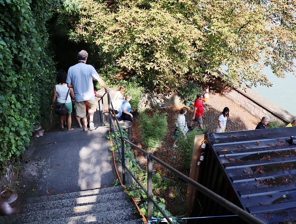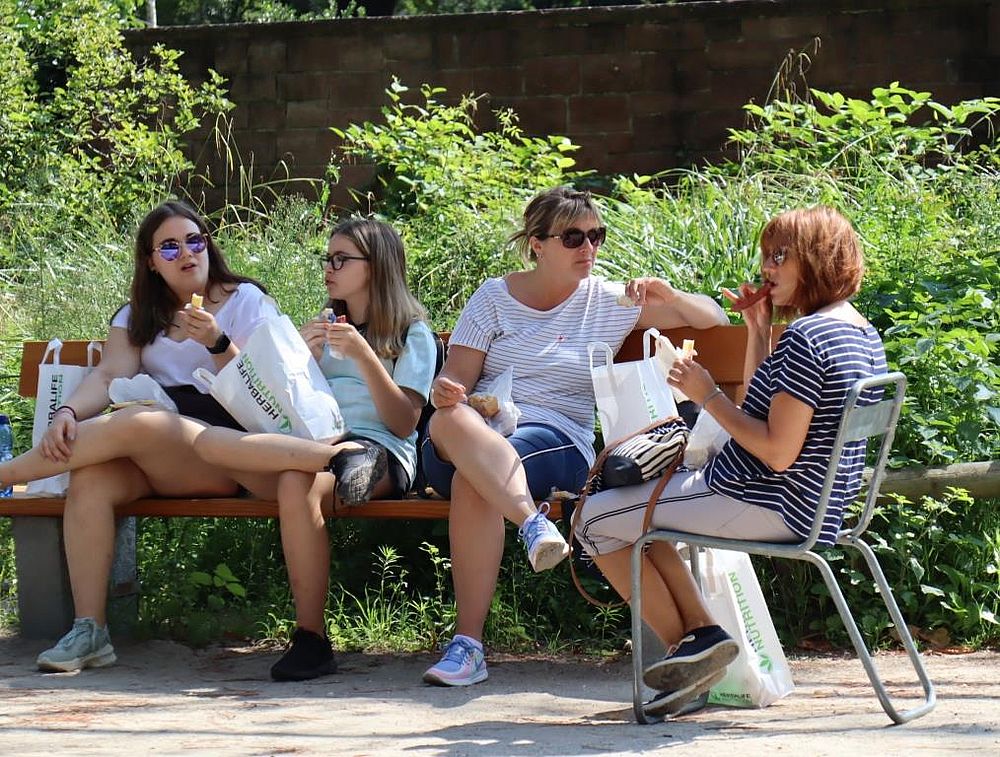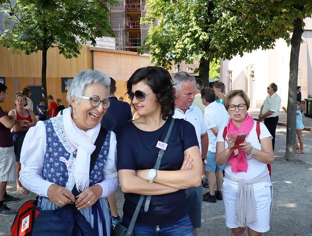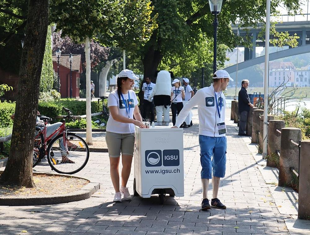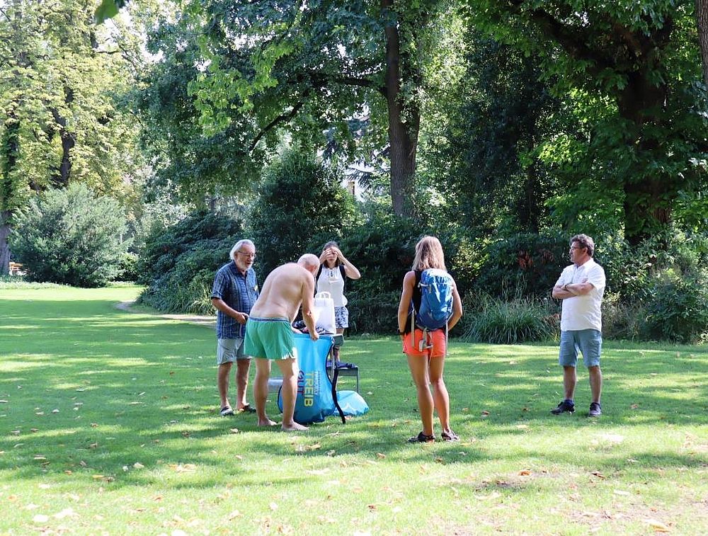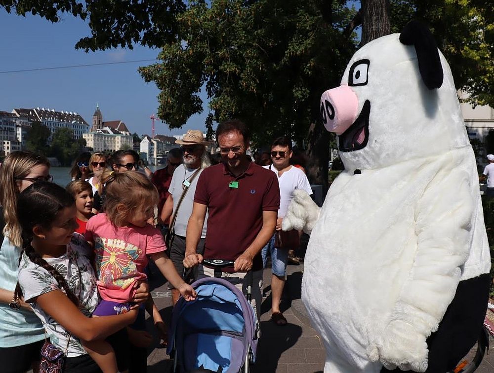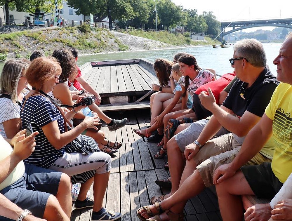 Am Samstag fahren unsere Gäste unter kundiger Reiseleitung von Margrit, Susi I. und Andrea nach Basel zum Sightseeing. Vom Marktplatz geht es zum Münsterplatz, zur Pfalz, runter zum Rhein, mit der Münsterfähre ins Kleinbasel und dort zum Solitude Park. Unterwegs entscheiden sich einige Mutige, bei dem schönen und warmen Wetter ein Bad im Rhein zu nehmen. Da erweist sich Werner, der zwischenzeitlich zur Gruppe gestossen ist, als kundiger Begleiter. Im Park wartet bereits Irene mit dem Pick Nick, bestehend aus Landjäger, Käse, Farmerstengel, Früchten von Hans, Brot und natürliche einer Flasche Wasser. Danach geht es als Höhepunkt in die Höhe, nämlich auf den Roche-Turm. Zwischenzeitlich hütet Andrea die Jüngste, die sich im Sandkasten vergnügt. Wieder zurück in Muttenz bleibt noch etwas Zeit, um sich mit Käse und Schokolade als Mitbringsel einzudecken.