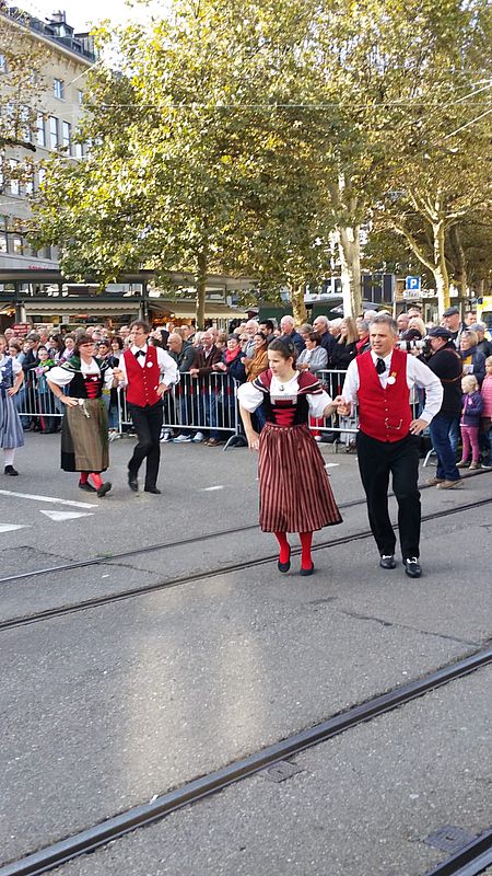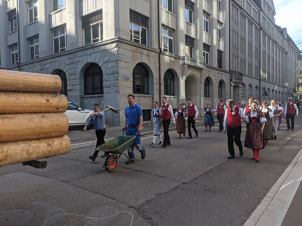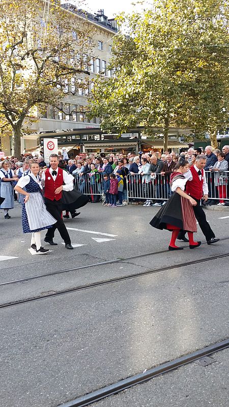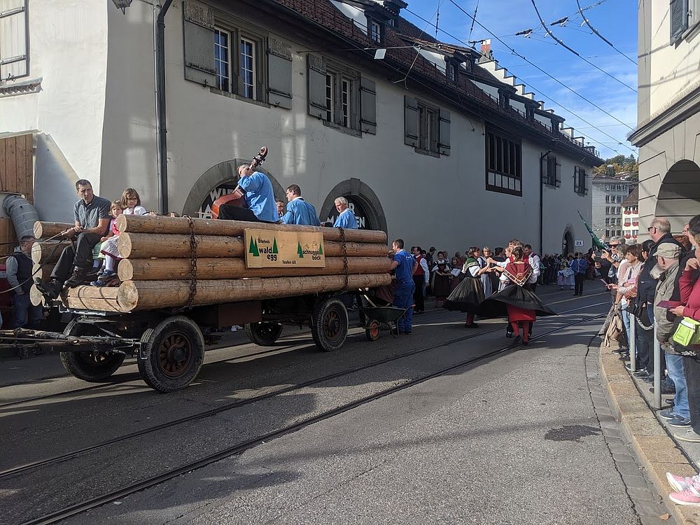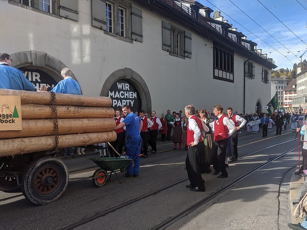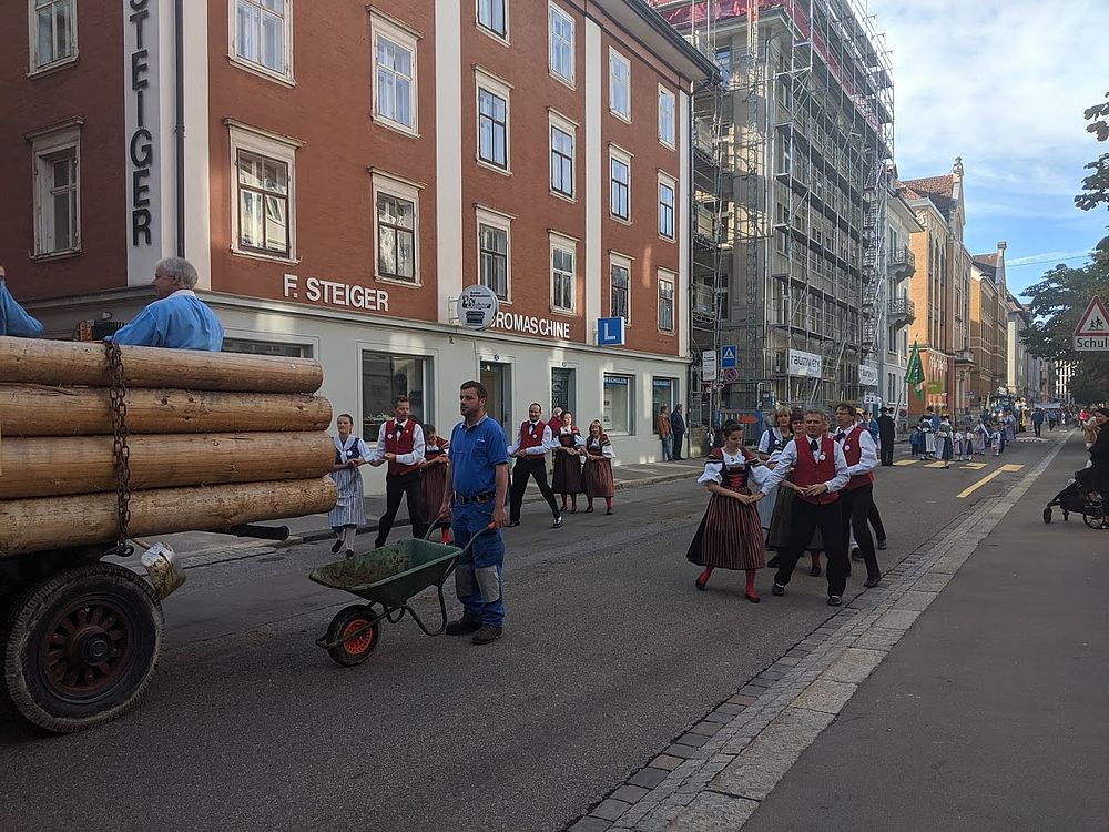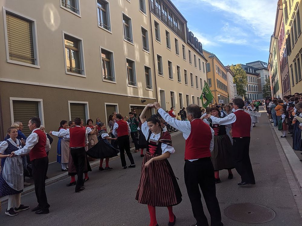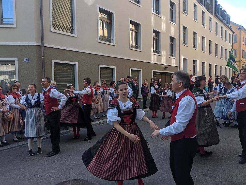 Kurz nach dem Startschuss des Umzugs setzte sich die Oberbaselbieter Karawane in Bewegung. Pünktlich dazu liess sich auch die Sonne sehen und strahlte am herrlich blauen Himmel über dem Umzug durch die Innenstadt. Zahlreiche Besucher*innen tummelten sich am Strassenrand hinter den Absperrungen und winkten, filmten, applaudierten. Eineinhalb Stunden über Teer, Kopfsteinpflaster, Tramschienen und abschüssige Strassen tanzten wir Trachtenleute zu den Stücken der OLK. Immer wieder stockte der Umzug, hin und wieder verloren wir die Musik aus den Ohren, sangen zwischendurch auch mal das Baselbieterlied oder tanzten ein C-Teil einmal mehr. Doch wir erreichten allesamt unversehrt, wenn auch gegen Schluss ein wenig ausser Atem, das Ende der Umzugsroute. Schnitzsäcke und abgelegte Jacken wanderten vom Musikantenwagen zurück in die Hände der Trachtenleute, danach folgte die Verabredung fürs Mittagessen. Ein kurzes Umschauen auf der Marktmeile war noch möglich, bevor wir uns in der Braustube zum gemeinsamen Essen zusammenfanden. Es wurde ein fröhlicher Plausch mit angeregten Unterhaltungen, ein schöner Abschluss für einen gelungenen Auftritt. Nach und nach verabschiedeten sich die einzelnen Trachtenleute, um noch ein wenig die Messehallen zu erkunden, den Festakt zu besuchen oder auch direkt die Heimreise anzutreten. Erschöpft und mit der Herbstsonne im Gesicht sassen irgendwann alle wieder im Zug, auf dem Weg zurück ins Baselbiet.