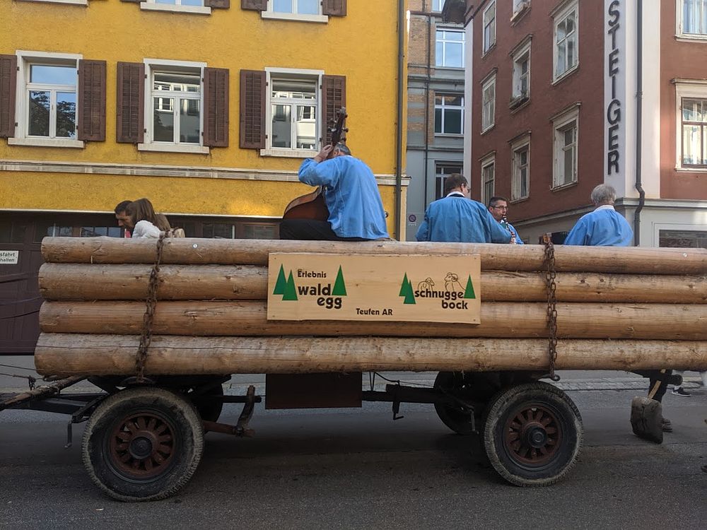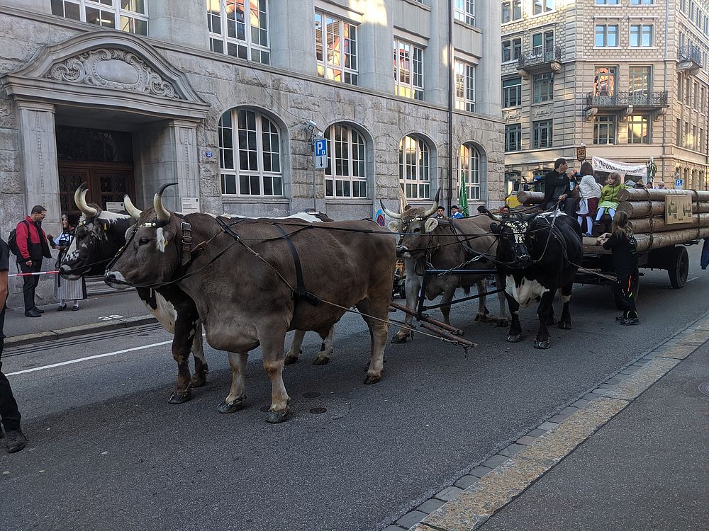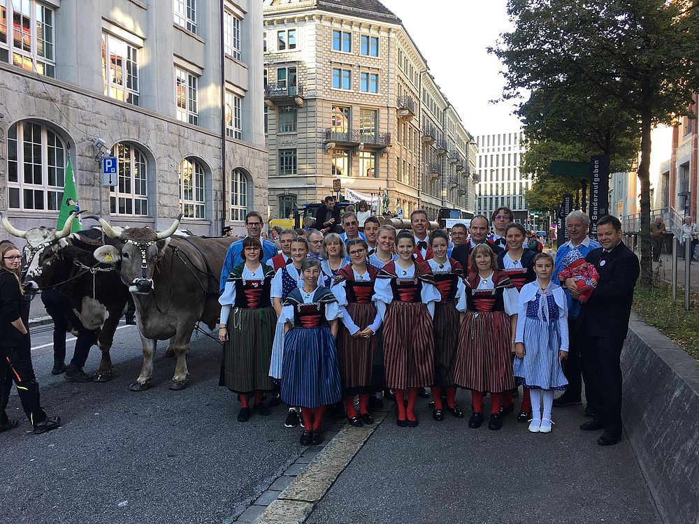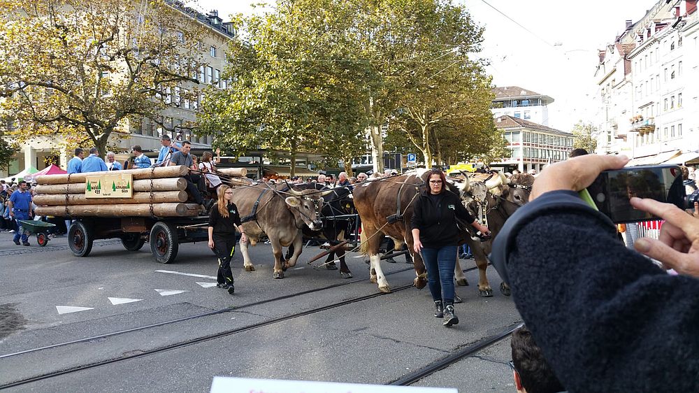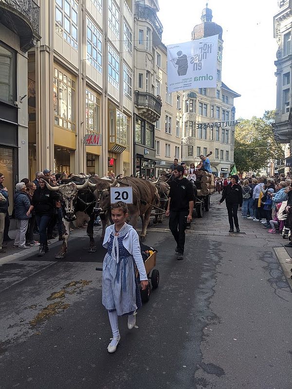 In den frühen Morgenstunden vom 12.10.2019 fanden sich 15 Trachtenleute aus den Ortgruppen Gelterkinden, Sissach und Waldenburgertal am Bahnhof Sissach zusammen. Die Oberbaselbieter Delegation trat ihre Zugreise zur OLMA aufgrund der herbstlichen Temperatur frisch und mehr oder weniger munter um 06:20 Uhr an. Im Zug nach Olten wurden Haare frisiert, Schultertücher gerichtet und Gipfeli gefrühstückt. Nach einem erneuten Umsteigen in Zürich erreichten wir den Bahnhof St. Gallen und wurden zum Startplatz 20 für den Umzug geleitet. Umgeben von Marschmusik, Thurgauer Kinderchörli und Backsteingebäuden ging es ans Aufwärmen. Chirsipfäffer und Krawall im Stall wollten eingetanzt werden, für den Umzug nicht wie gewohnt im Kreis, sondern in Laufrichtung vorwärts. Eine knappe Stunde vor Umzugsbeginn begann nach und nach die Oberbaselbieter Ländlerkapelle einzutrudeln, die auf einem hölzernen Wagen vorausfahren und die musikalische Live- Begleitung der Tänze ermöglichen würde. Die heimlichen Stars des Wagens waren jedoch dessen Zugtiere: Die vier Ochsen Peter, Fridolin, Max und Moritz, die mit einer stoischen Friedlichkeit jegliche Fotoshootings der Umzugsteilnehmenden und der Zuschauer*innen über sich ergehen liessen.