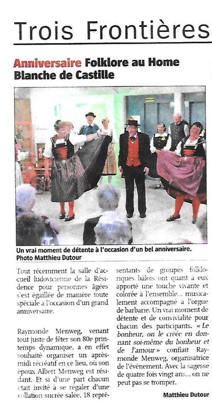 Esther Vifian, TG Muttenz und TG Basel-Stadt, erhielt von einer in St-Louis wohnhaften Bekannten (Raymonde Menweg) die Idee gesteckt, dass sie zu ihrem 80. Geburtstag dem Altersheim Residence Blanche de Castille in St. Louis eine Geburtstagsüberraschung bereiten möchte, und zwar einen Nachmittag mit Volkstänzen aus der Schweiz. Bewohner in diesem Altersheim ist auch ihr Ehemann Albert.