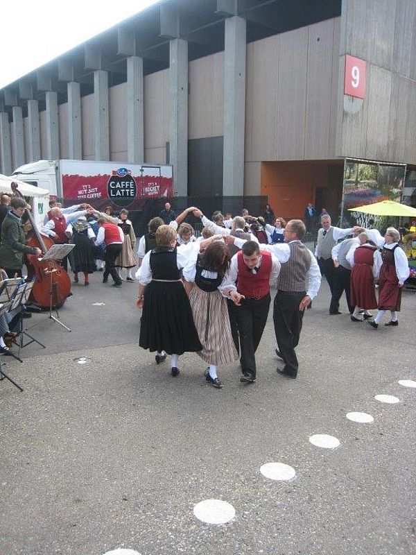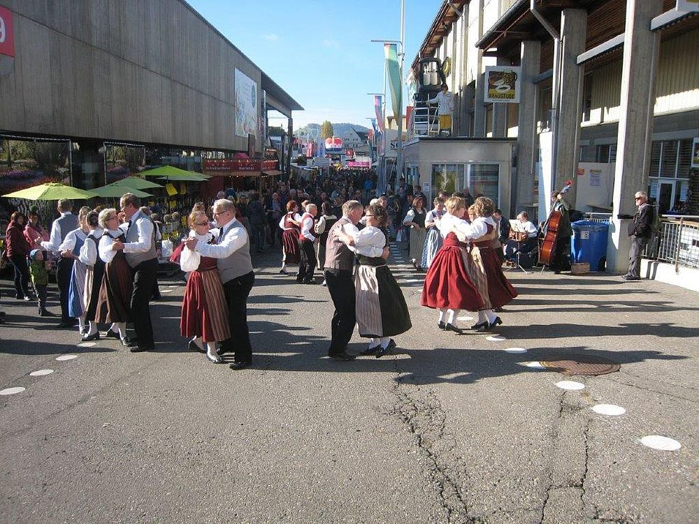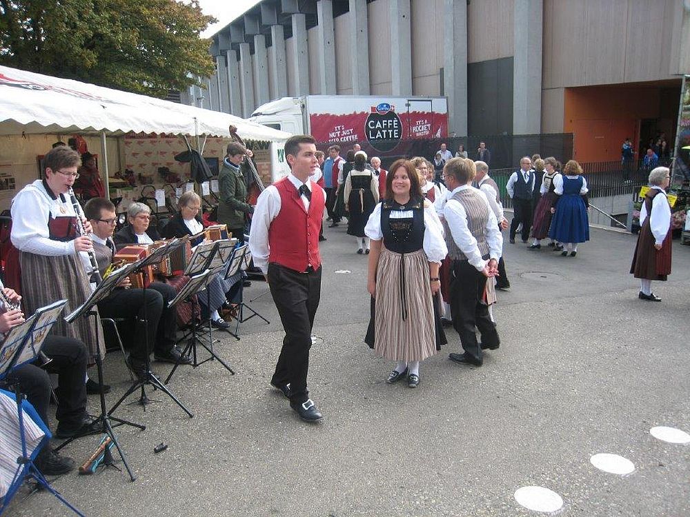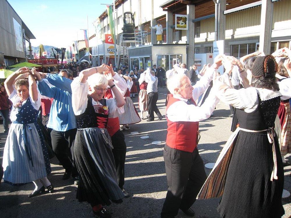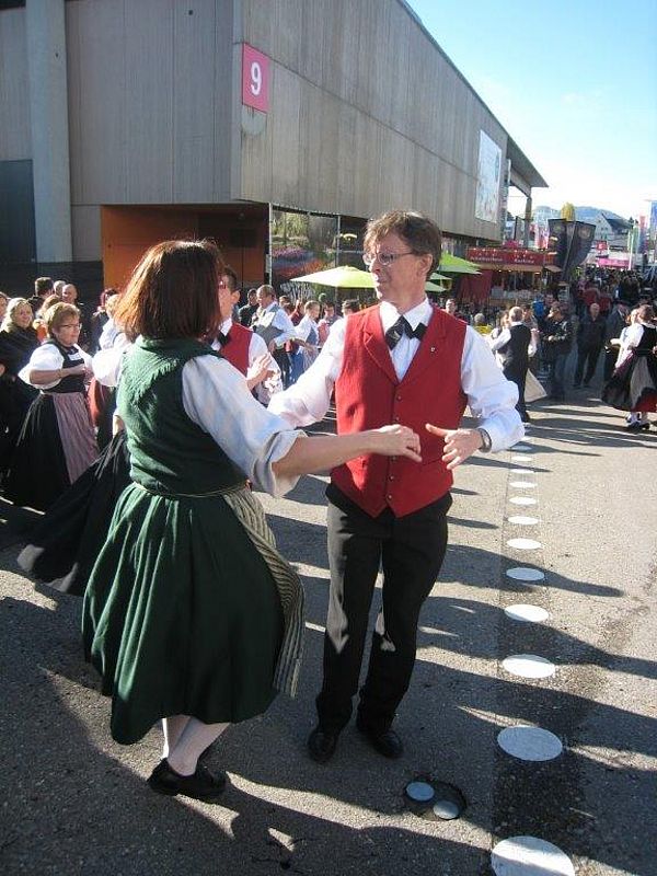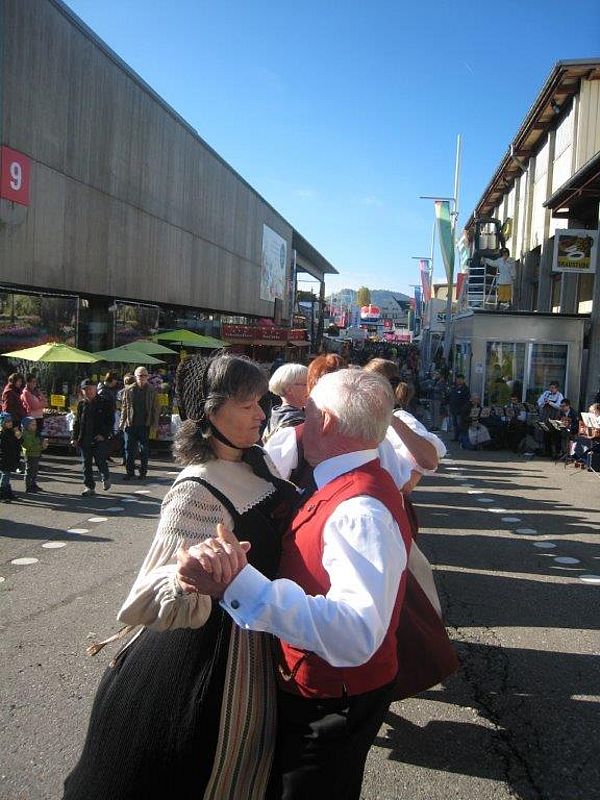 Nach der nebligen Fahrt erleben wir einen schönen sonnigen Tag in St. Gallen. Schon kurz nach der Ankunft findet gleich der erste Auftritt auf der abschüssigen „Hauptstrasse“ der Olma statt. Aus den vier Nordwestschweizer Kantonen tanzen je vier Paare, wirklich eine stattliche Anzahl. Unter der Leitung von Bruno Gschwind, Kantonaltanzleiter Basel-Stadt, wird aus jedem Kanton ein Tanz dargeboten: Der Rupperswiler (AG), Selbviert (BS), Wenslinger Walzer (BL) und En Änglische (SO), zusammengefasst wie ein Potpourri. Die Effiger Husmusig begleitet uns gekonnt und engagiert durch den ganzen Tag.