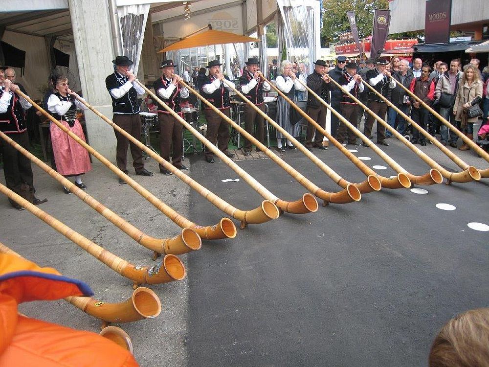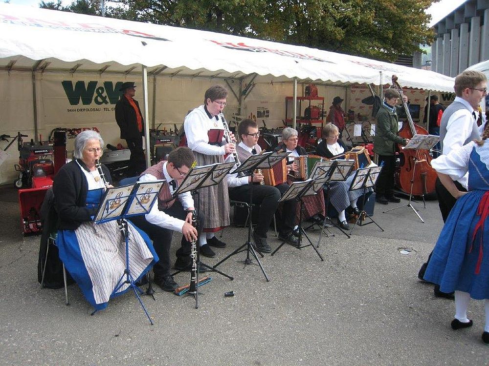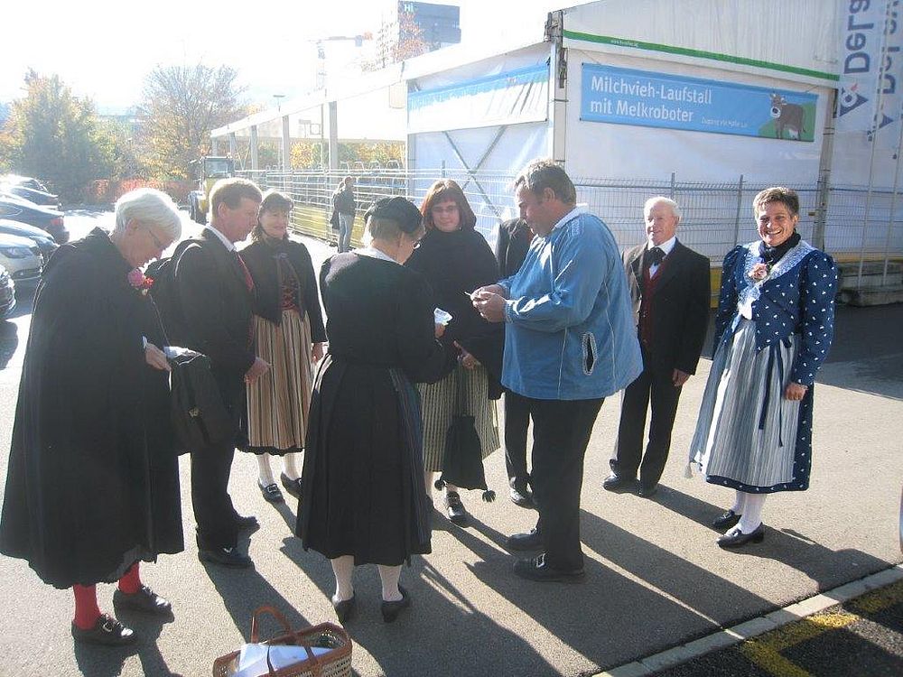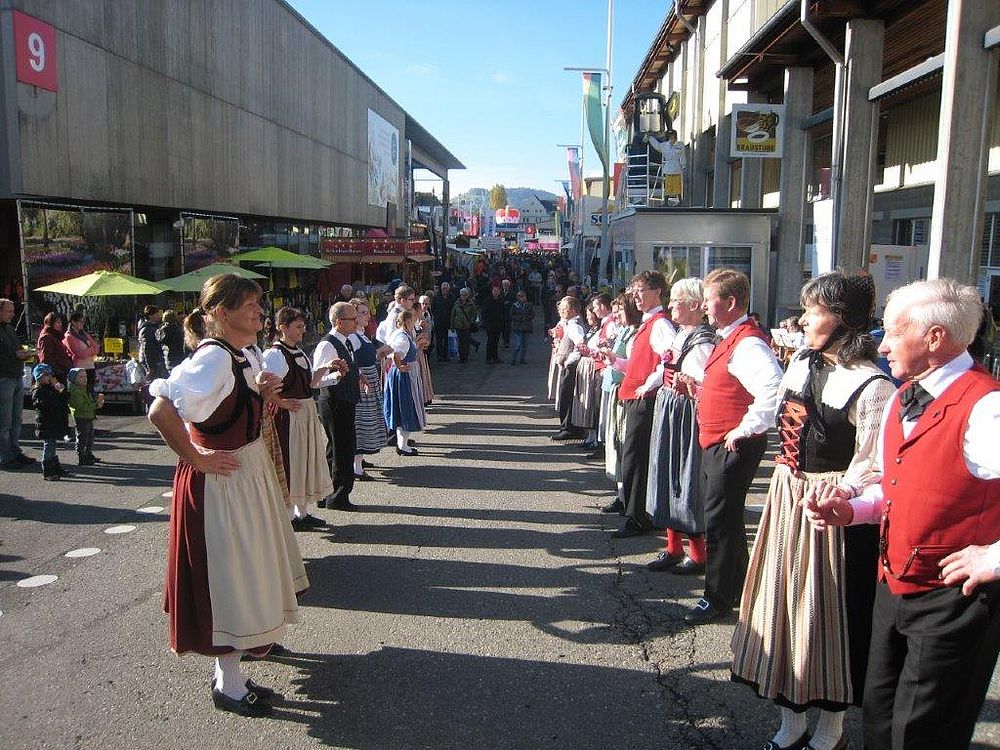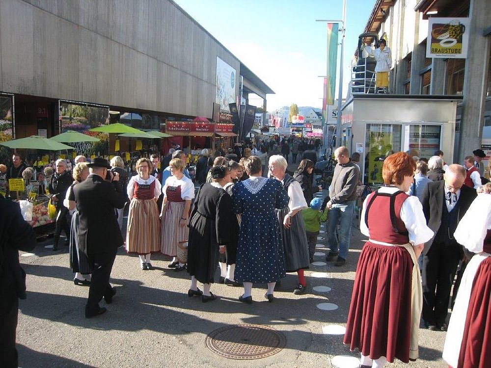 Nach der nebligen Fahrt erleben wir einen schönen sonnigen Tag in St. Gallen. Schon kurz nach der Ankunft findet gleich der erste Auftritt auf der abschüssigen „Hauptstrasse“ der Olma statt. Aus den vier Nordwestschweizer Kantonen tanzen je vier Paare, wirklich eine stattliche Anzahl. Unter der Leitung von Bruno Gschwind, Kantonaltanzleiter Basel-Stadt, wird aus jedem Kanton ein Tanz dargeboten: Der Rupperswiler (AG), Selbviert (BS), Wenslinger Walzer (BL) und En Änglische (SO), zusammengefasst wie ein Potpourri. Die Effiger Husmusig begleitet uns gekonnt und engagiert durch den ganzen Tag.
