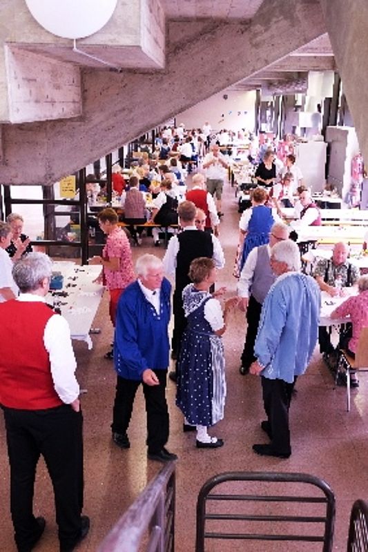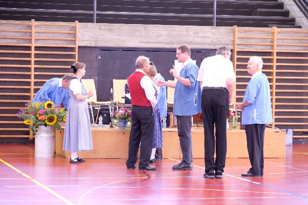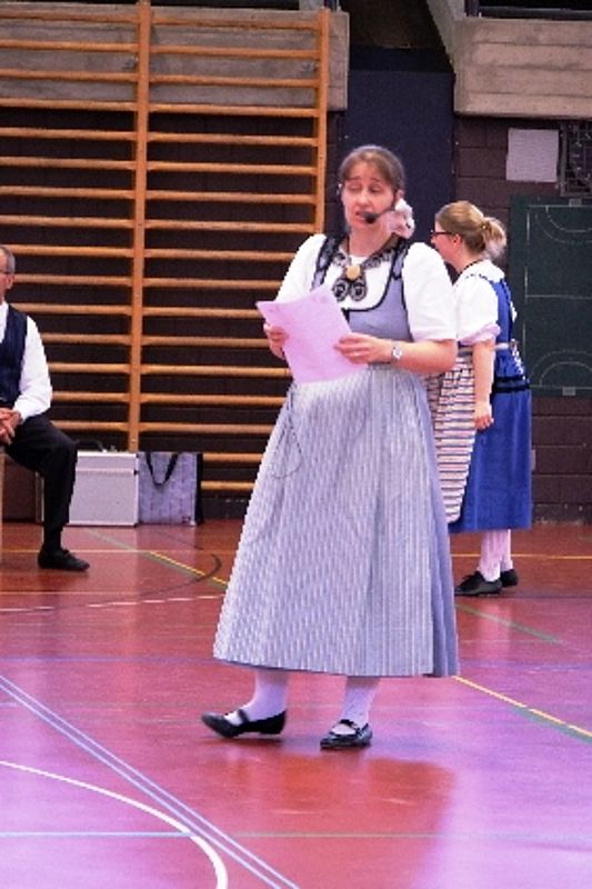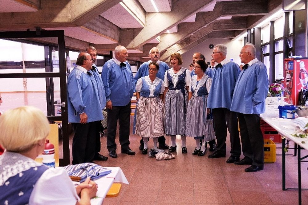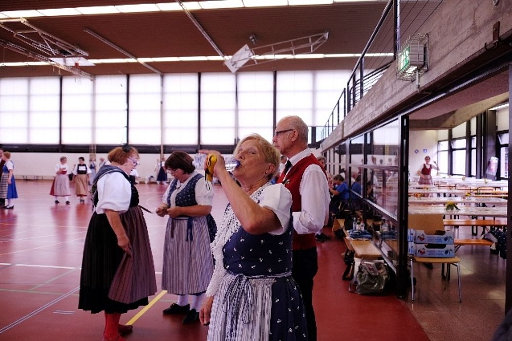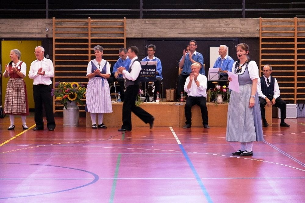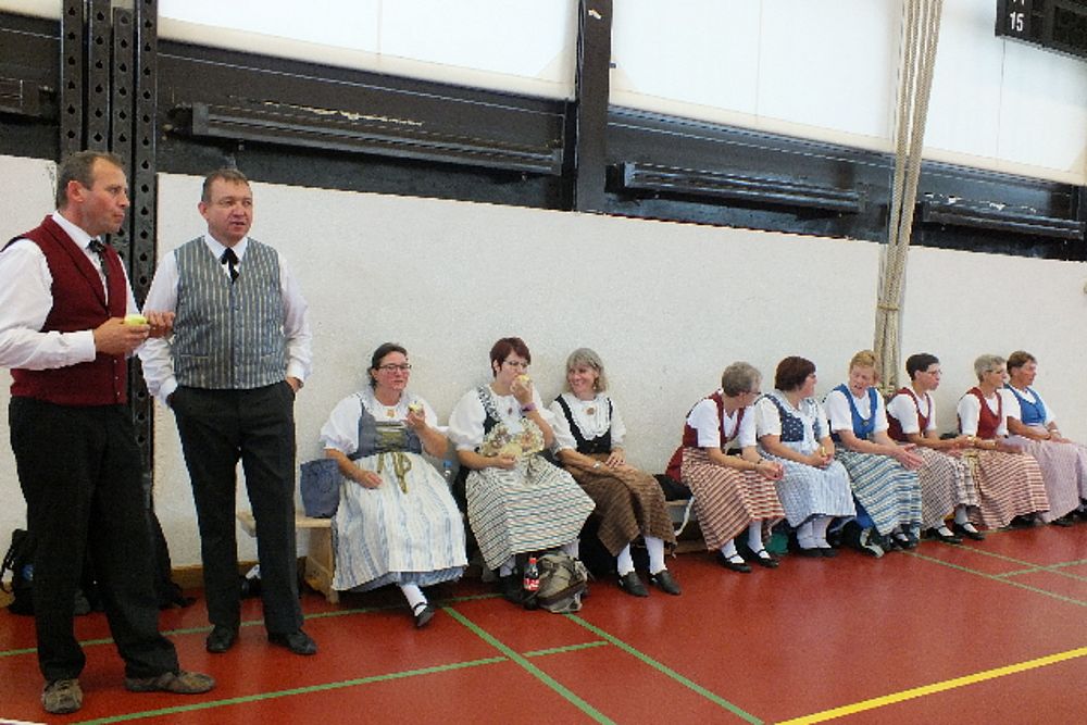 Nachtrag: Wer nach Programmschluss um ca. 16.15 Uhr noch zum etwas Trinken und/oder Essen sitzen blieb, kam in den Genuss einer tollen Überraschung. Etwa eine halbe Stunde später kam eine Gruppe Männer und Frauen in Baselbieter Werktagstrachten durch die Halle spaziert und gesellte sich zu uns – es war das Jodlerchörli Wildenstein von Bubendorf. Sie hatten einen Auftritt im nahe gelegenen APH Frenkenbündten und wunderten sich über die zahlreichen Trachtenleute, die sie von der Sporthalle Frenke herkommend sahen. Sie brachten uns ein kleines Ständeli mit 2 witzigen Jodelliedern, dem Siloballen-Blues und dem Nachtbuebelied. Super.