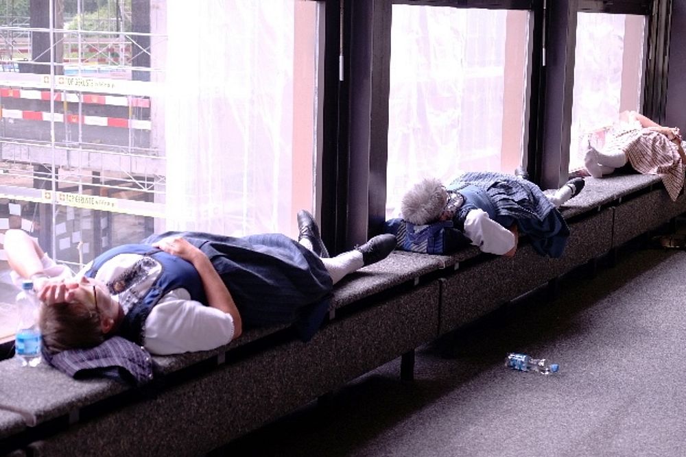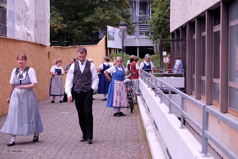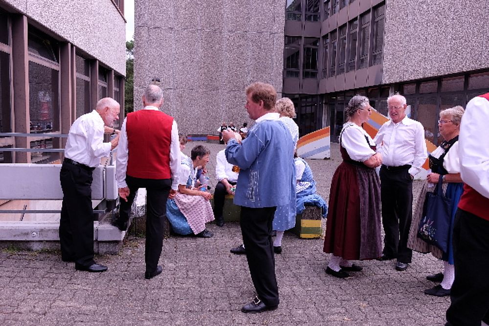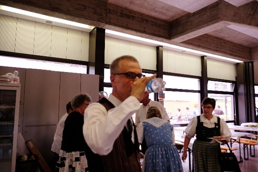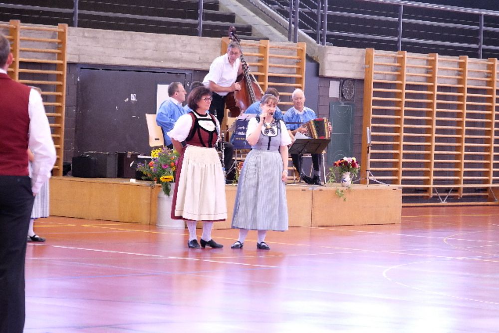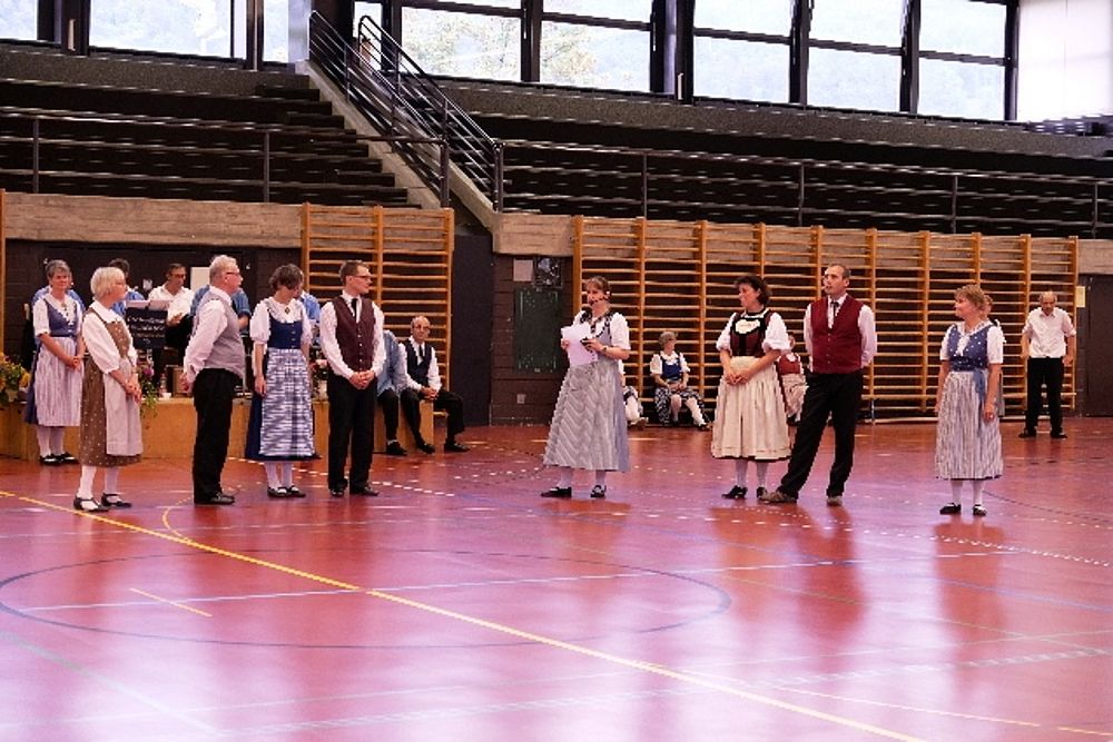 Nachtrag: Wer nach Programmschluss um ca. 16.15 Uhr noch zum etwas Trinken und/oder Essen sitzen blieb, kam in den Genuss einer tollen Überraschung. Etwa eine halbe Stunde später kam eine Gruppe Männer und Frauen in Baselbieter Werktagstrachten durch die Halle spaziert und gesellte sich zu uns – es war das Jodlerchörli Wildenstein von Bubendorf. Sie hatten einen Auftritt im nahe gelegenen APH Frenkenbündten und wunderten sich über die zahlreichen Trachtenleute, die sie von der Sporthalle Frenke herkommend sahen. Sie brachten uns ein kleines Ständeli mit 2 witzigen Jodelliedern, dem Siloballen-Blues und dem Nachtbuebelied. Super.