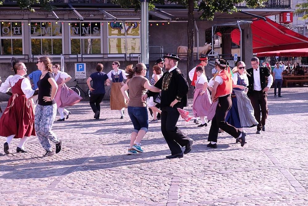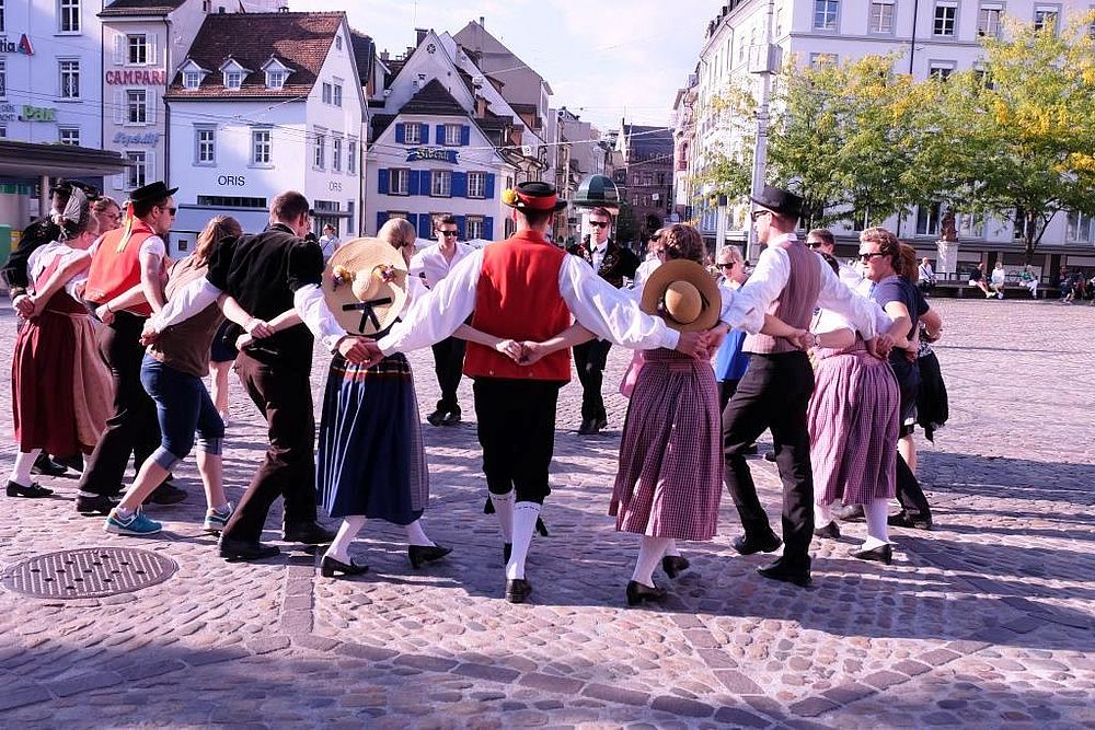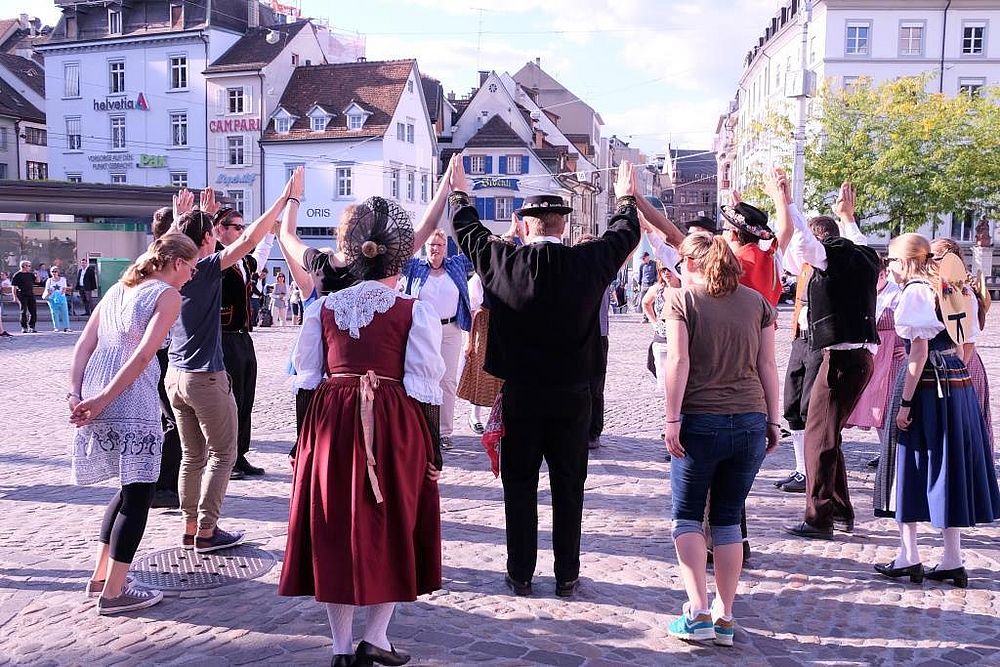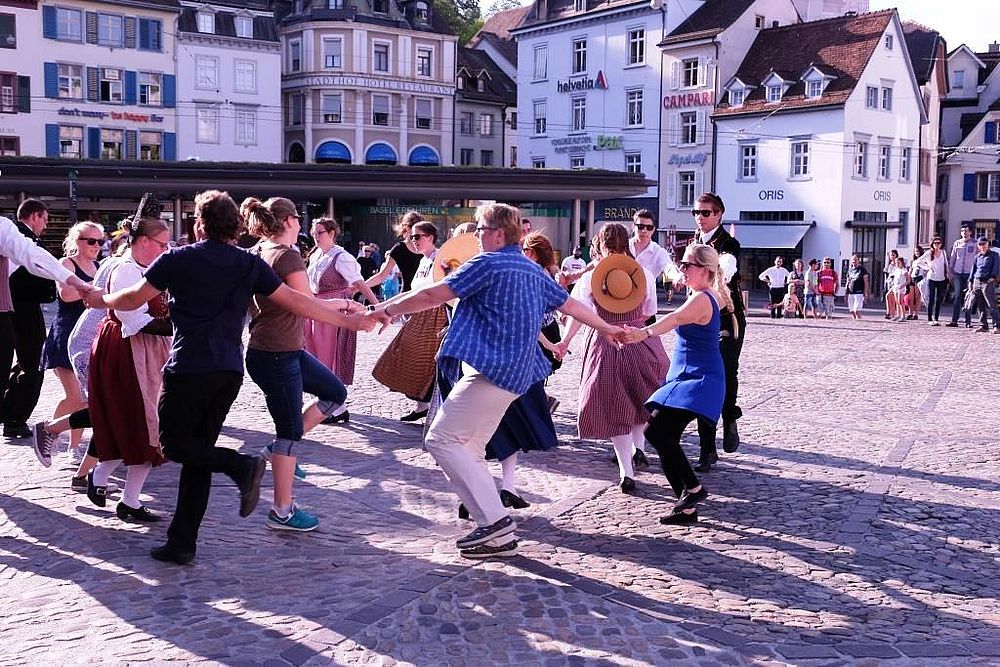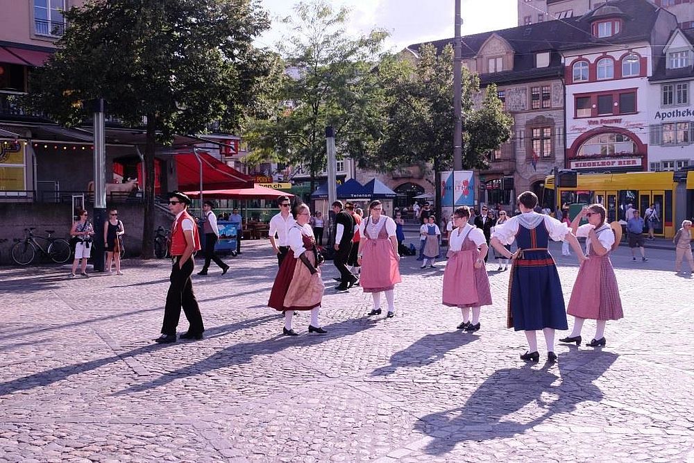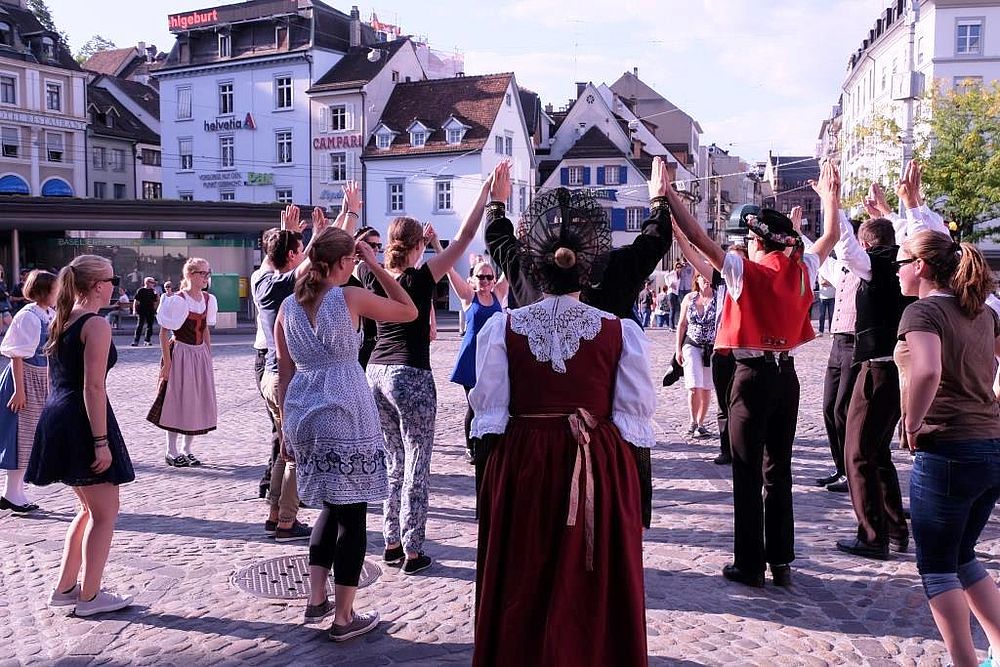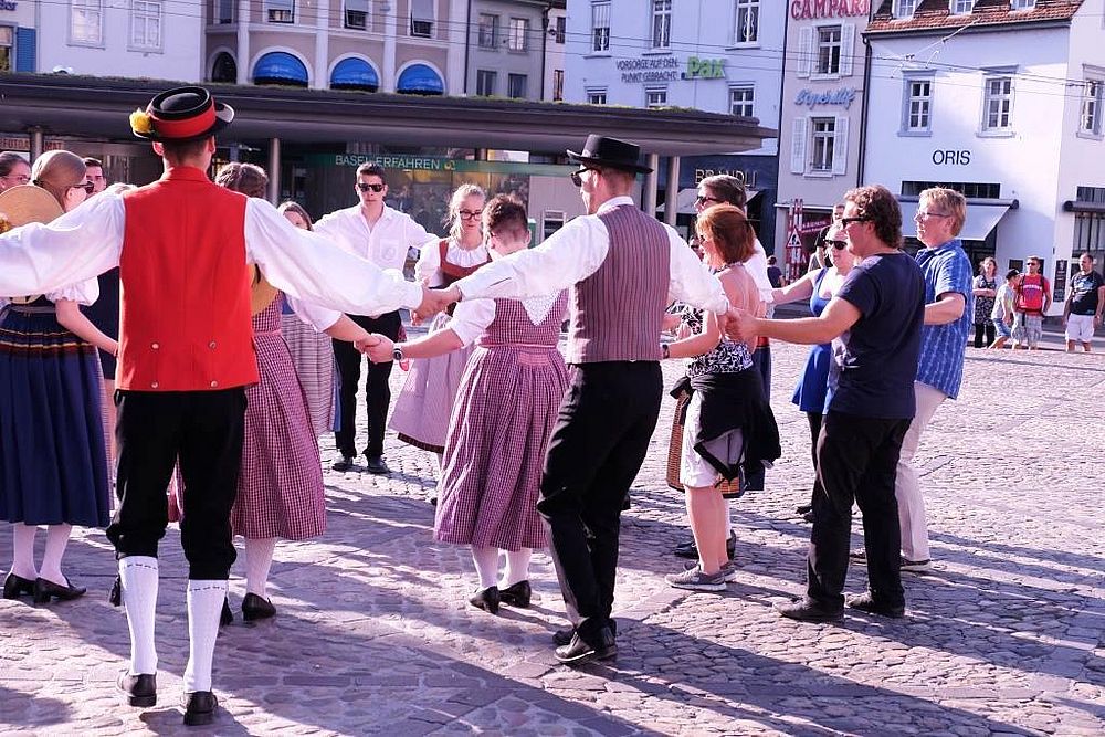 Die Gruppe Jestavo (Jungi Erwachseni tanzed Volkstanz), in der auch der Muttenzer Raphi Gasser mitwirkt, unternahm am Sonntag, 20. August einen Flashmob in 4 Schweizer Städten. Start war um 9 Uhr in Bern. Sodann ging es nach Luzern, weiter nach Zürich und den Abschluss bildete um ca. 18 Uhr der Barfüsserplatz in Basel.