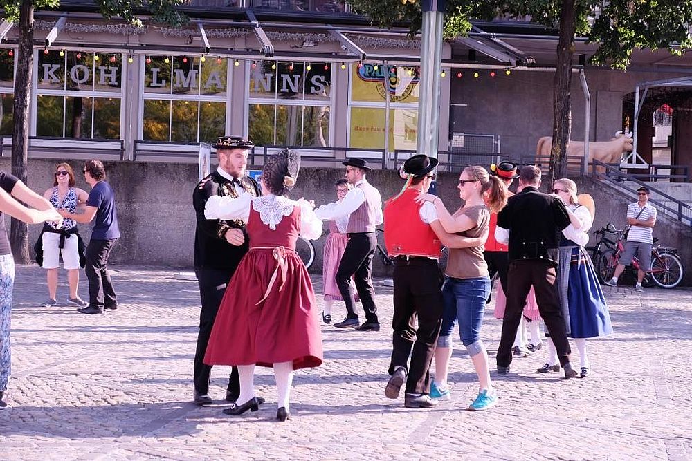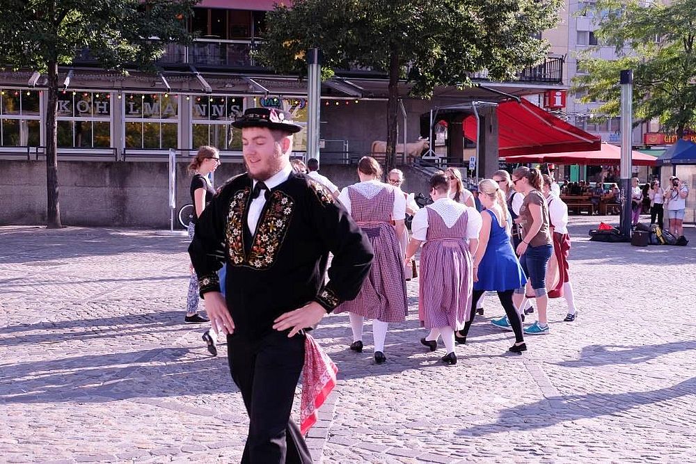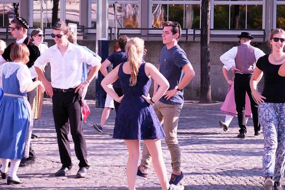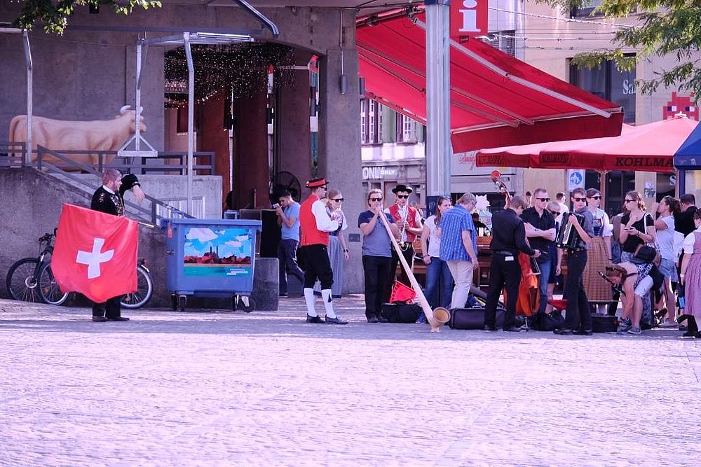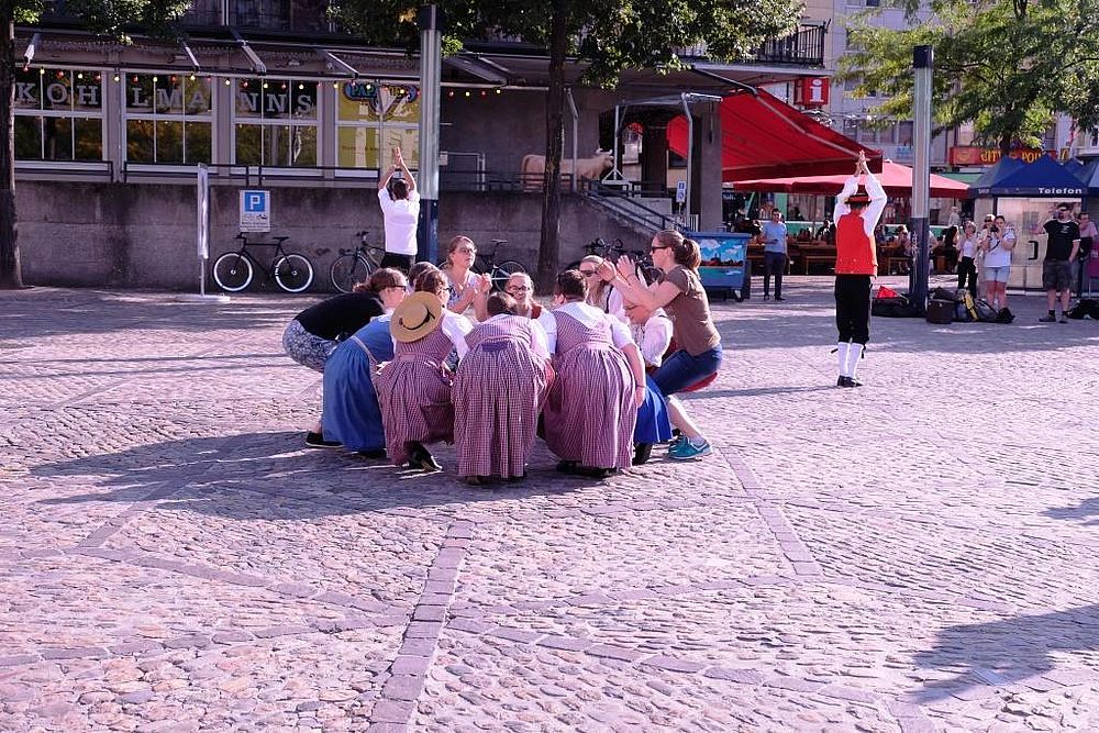 Start mit Alphornklängen und Fahnenschwingen, dann Volksmusikklänge, und schon tanzen die Jungen in ihren schönen Trachten eine Eigenchoreographie. „Zivile“ (natürlich auch Mitwirkende der Gruppe) stossen dazu. Passanten bleiben stehen, schauen zu, gehen weiter. Entzückt ist eine Touristengruppe aus Asien. Und dann wäre der „Spuk“ schon vorbei. Aber da Basel der letzte Aufführungsort ist, und die Jungen gerne tanzen, zeigen sie noch den Seppel und den Bärnermutz. Es war ein einmaliges Kunstwerk, das nach Aussagen der Mitwirkenden in Luzern am meisten Zuschauer fand.