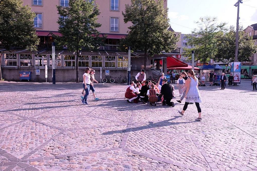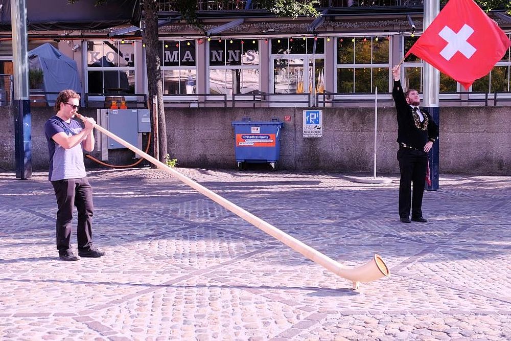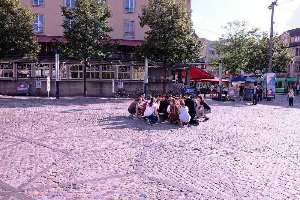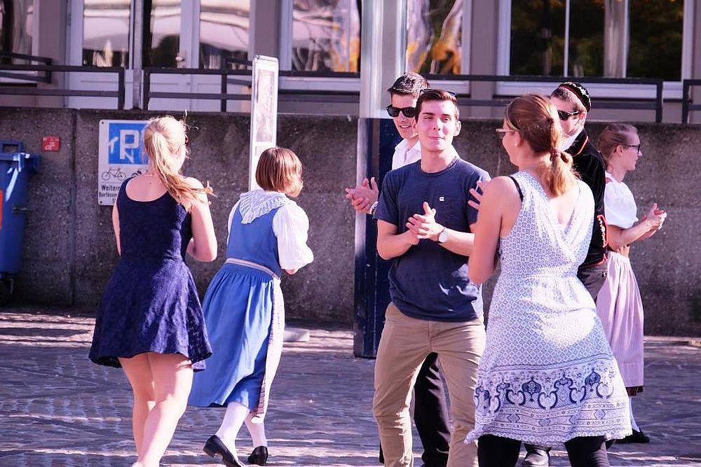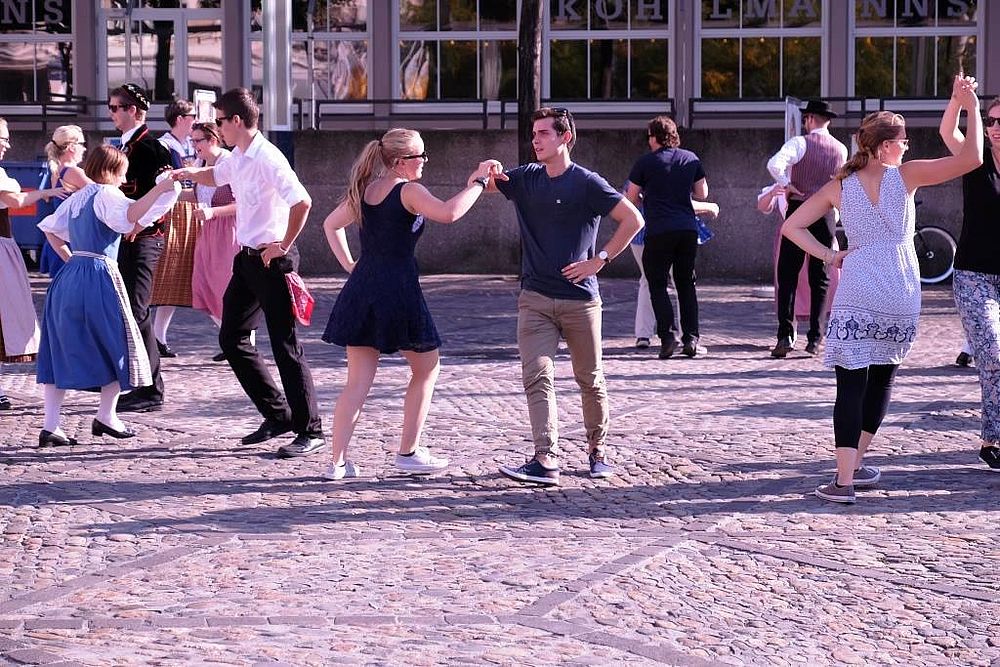 Start mit Alphornklängen und Fahnenschwingen, dann Volksmusikklänge, und schon tanzen die Jungen in ihren schönen Trachten eine Eigenchoreographie. „Zivile“ (natürlich auch Mitwirkende der Gruppe) stossen dazu. Passanten bleiben stehen, schauen zu, gehen weiter. Entzückt ist eine Touristengruppe aus Asien. Und dann wäre der „Spuk“ schon vorbei. Aber da Basel der letzte Aufführungsort ist, und die Jungen gerne tanzen, zeigen sie noch den Seppel und den Bärnermutz. Es war ein einmaliges Kunstwerk, das nach Aussagen der Mitwirkenden in Luzern am meisten Zuschauer fand.