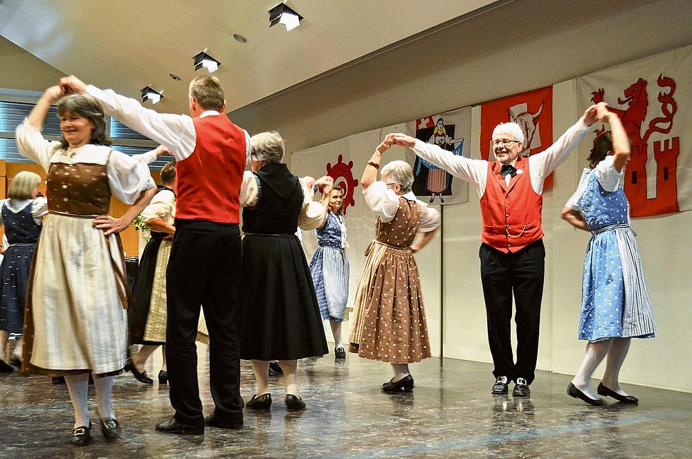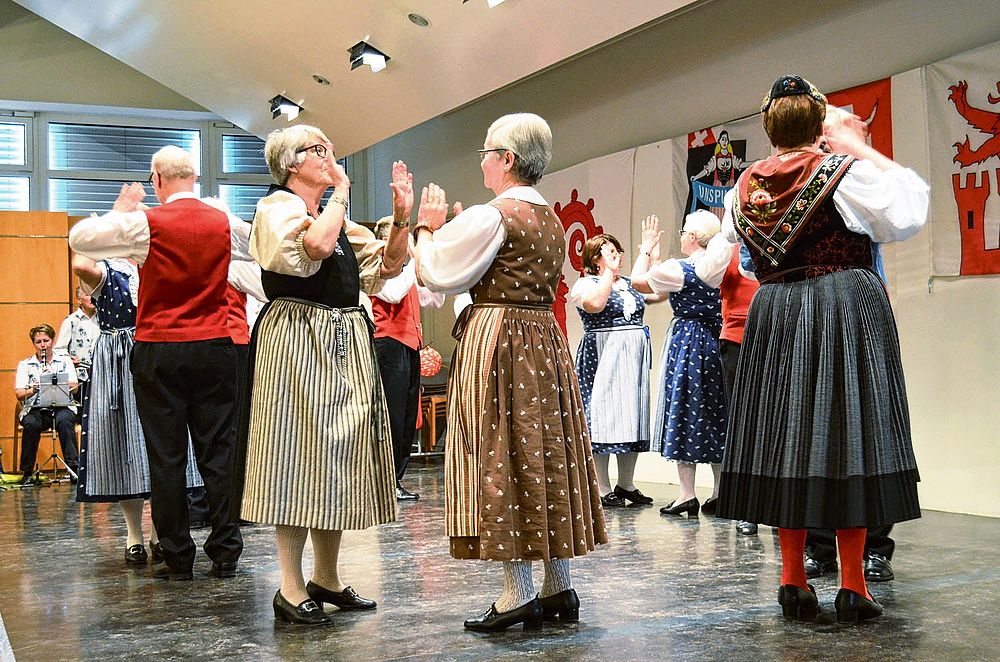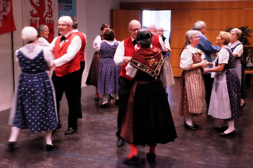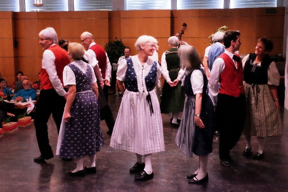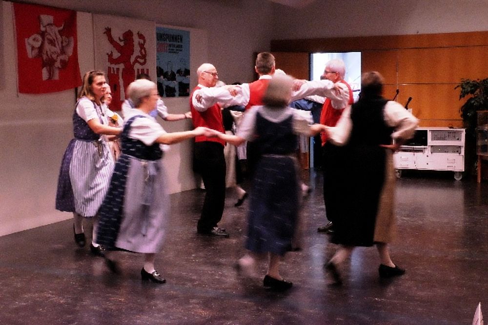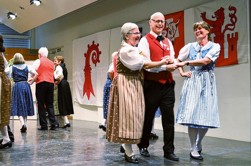 Der Tanz ist beschwingt, die Abfolgen für Laien nicht einfach auszumachen: Die Schritte wechseln genauso rasch wie die Männer die Frauen. Da tanzt Sämi Benz, Präsident der Trachtengruppe, im einen Moment mit zwei Frauen in Werktagstracht. 360 Grad später sieht ihn das Publikum mit zwei anderen Frauen, diesmal in Festtagstrachten. Da wird einem nicht nur bloss beim Anblick der vielen Umdrehungen schwindelig. Das viele Wechseln hat es in sich, sodass sich beim einen oder anderen Tanzenden allmählich Schweissperlen auf der Stirn bilden.