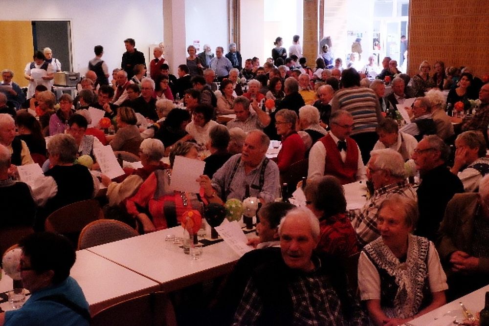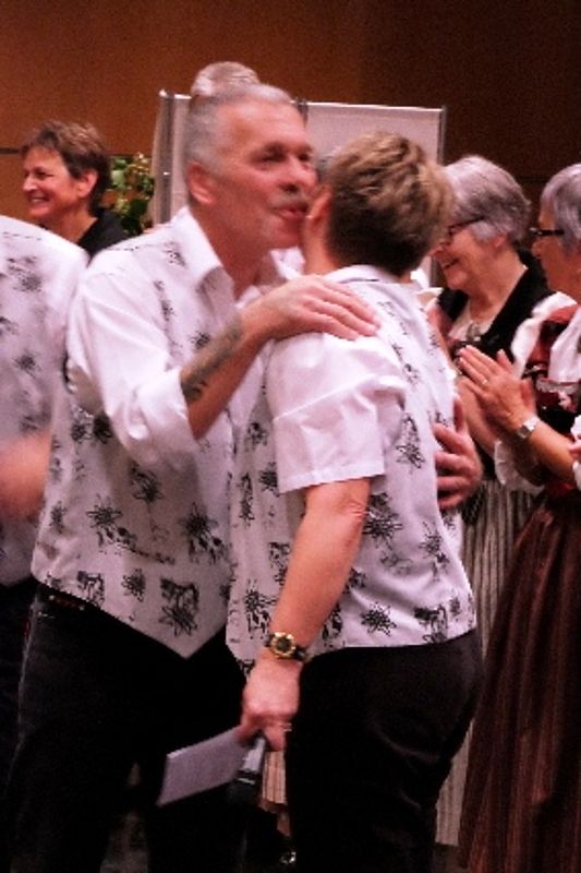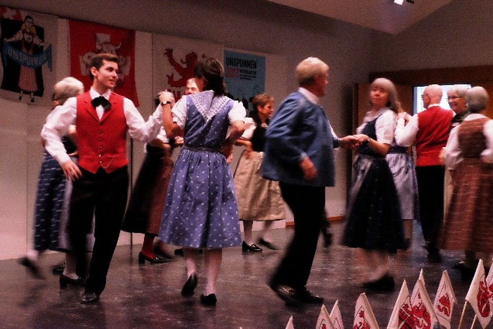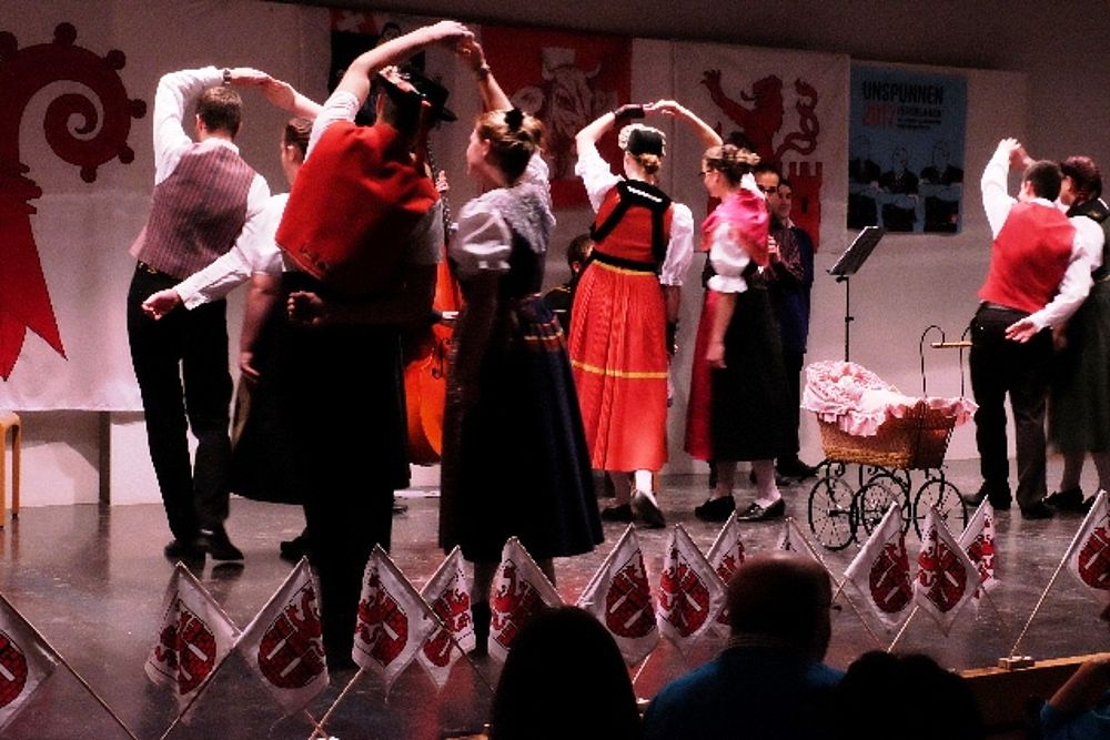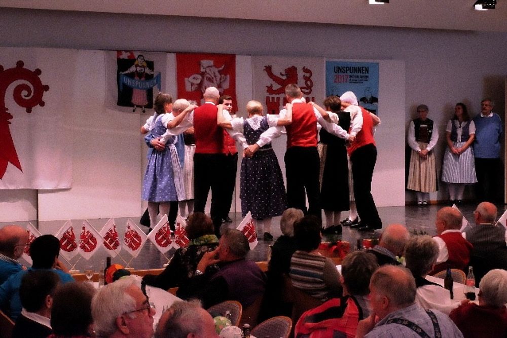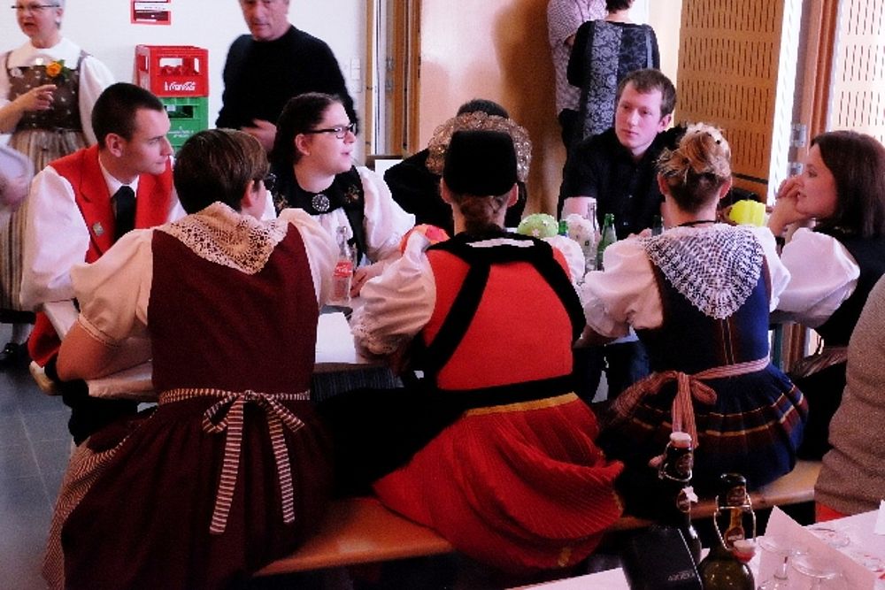 Der Tanz ist beschwingt, die Abfolgen für Laien nicht einfach auszumachen: Die Schritte wechseln genauso rasch wie die Männer die Frauen. Da tanzt Sämi Benz, Präsident der Trachtengruppe, im einen Moment mit zwei Frauen in Werktagstracht. 360 Grad später sieht ihn das Publikum mit zwei anderen Frauen, diesmal in Festtagstrachten. Da wird einem nicht nur bloss beim Anblick der vielen Umdrehungen schwindelig. Das viele Wechseln hat es in sich, sodass sich beim einen oder anderen Tanzenden allmählich Schweissperlen auf der Stirn bilden.