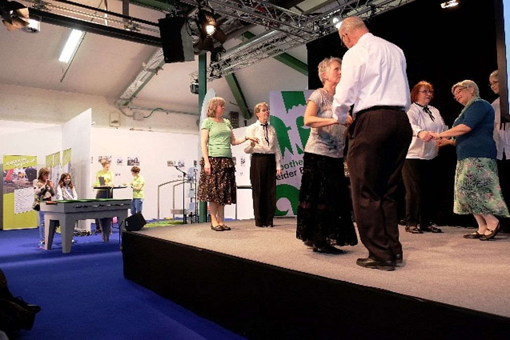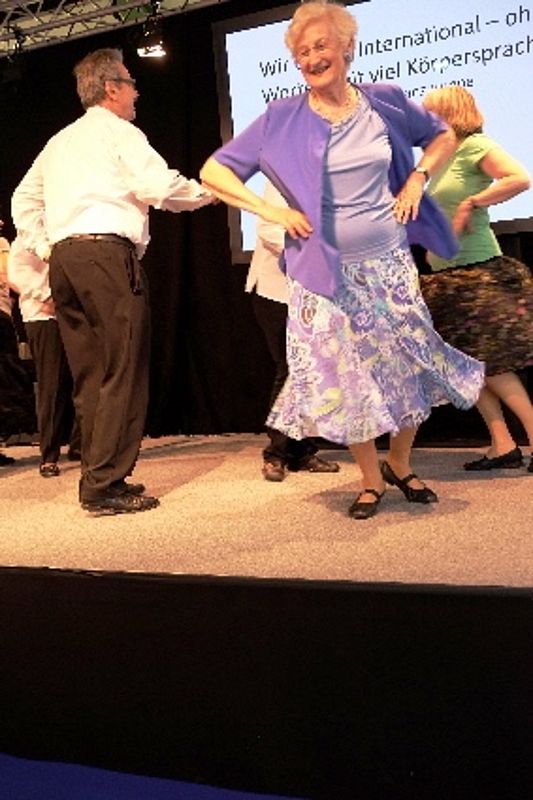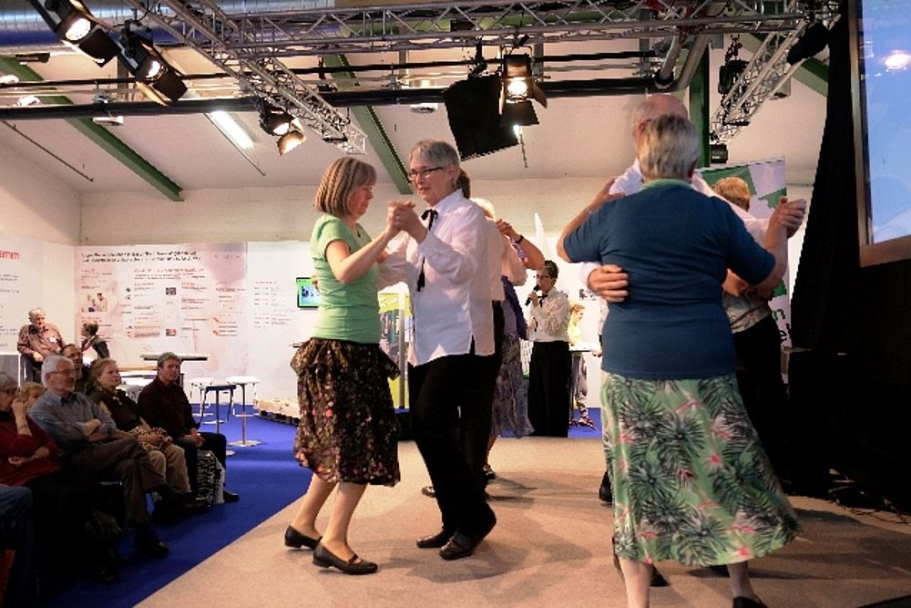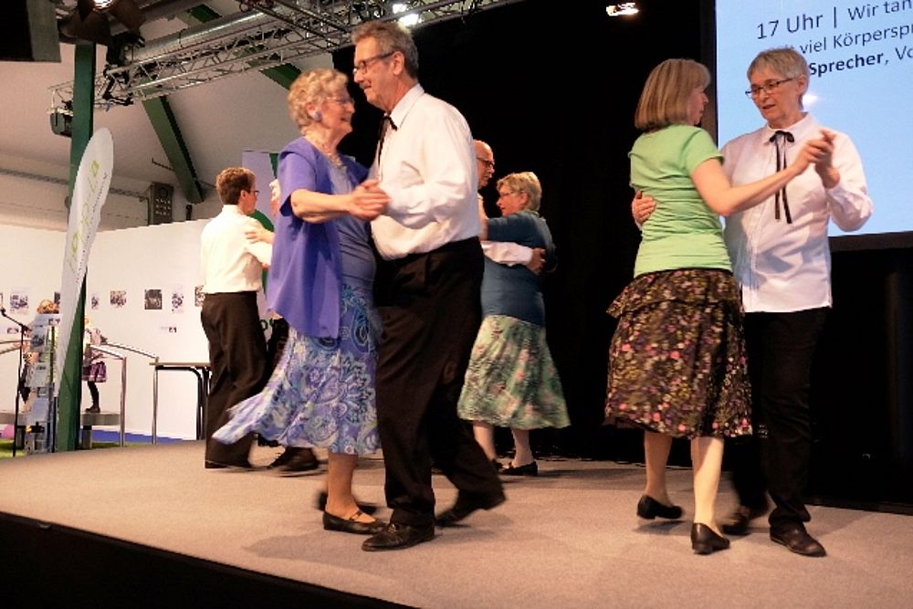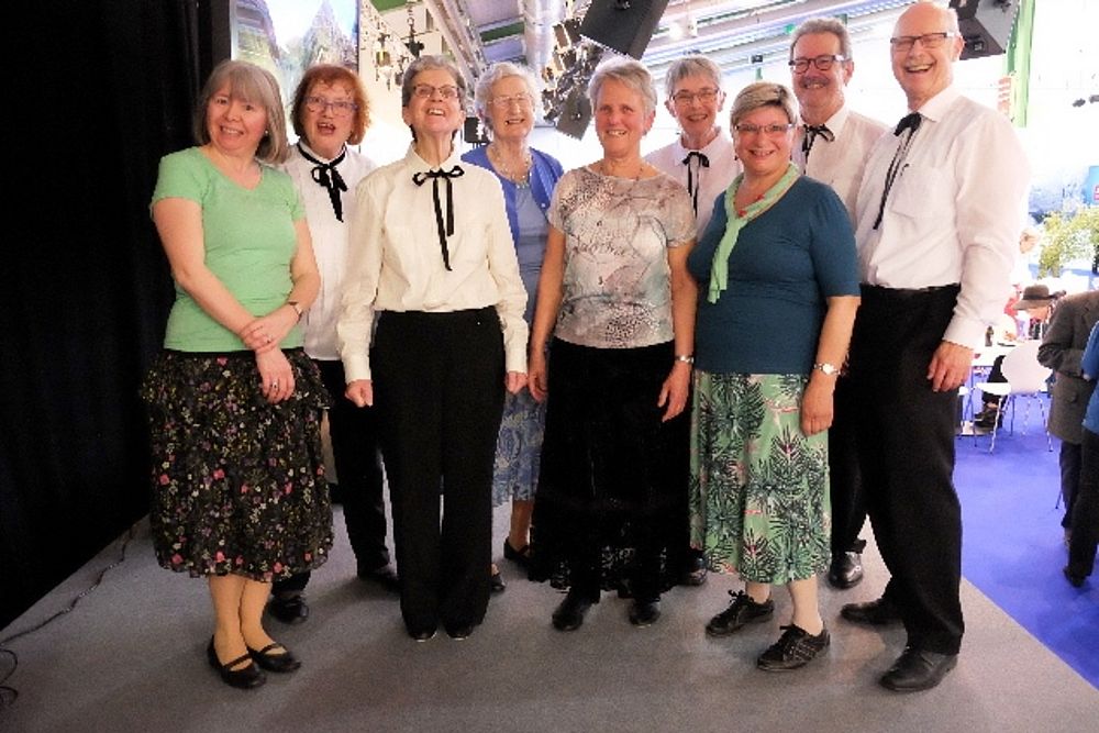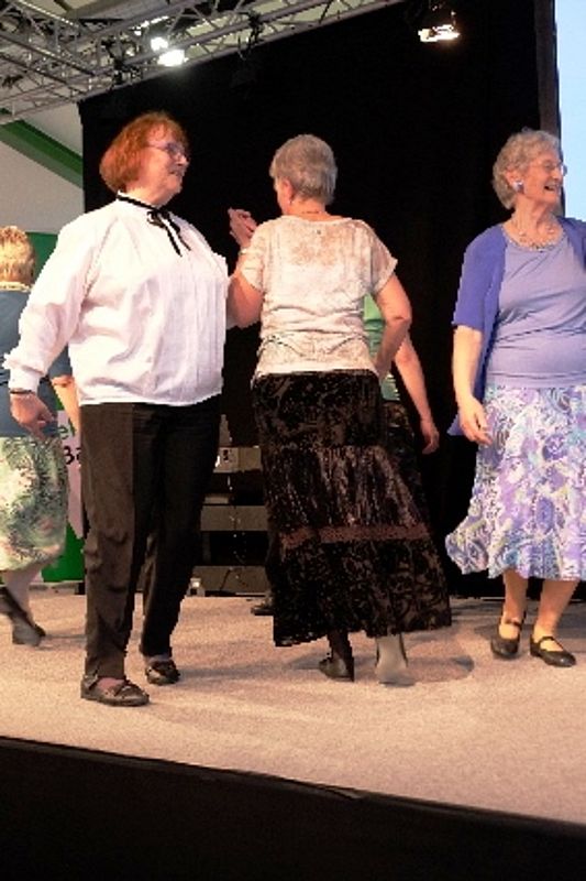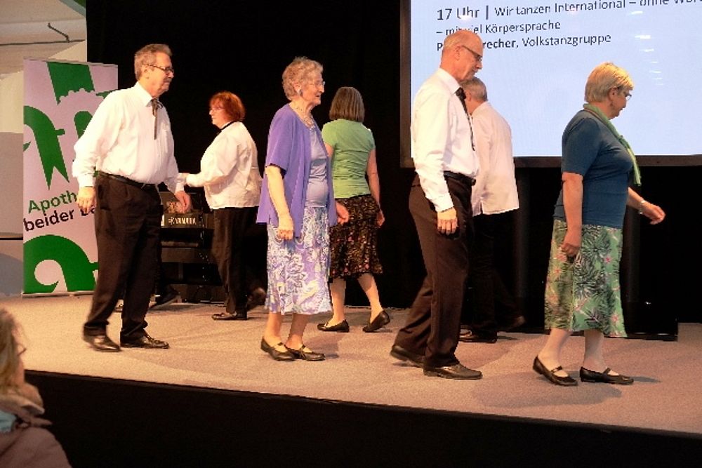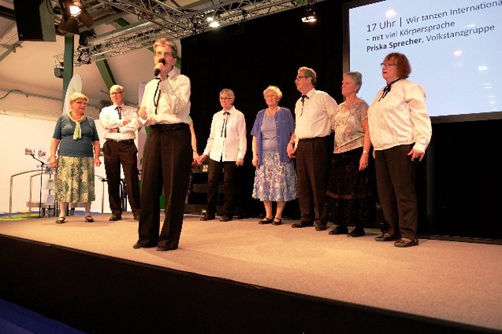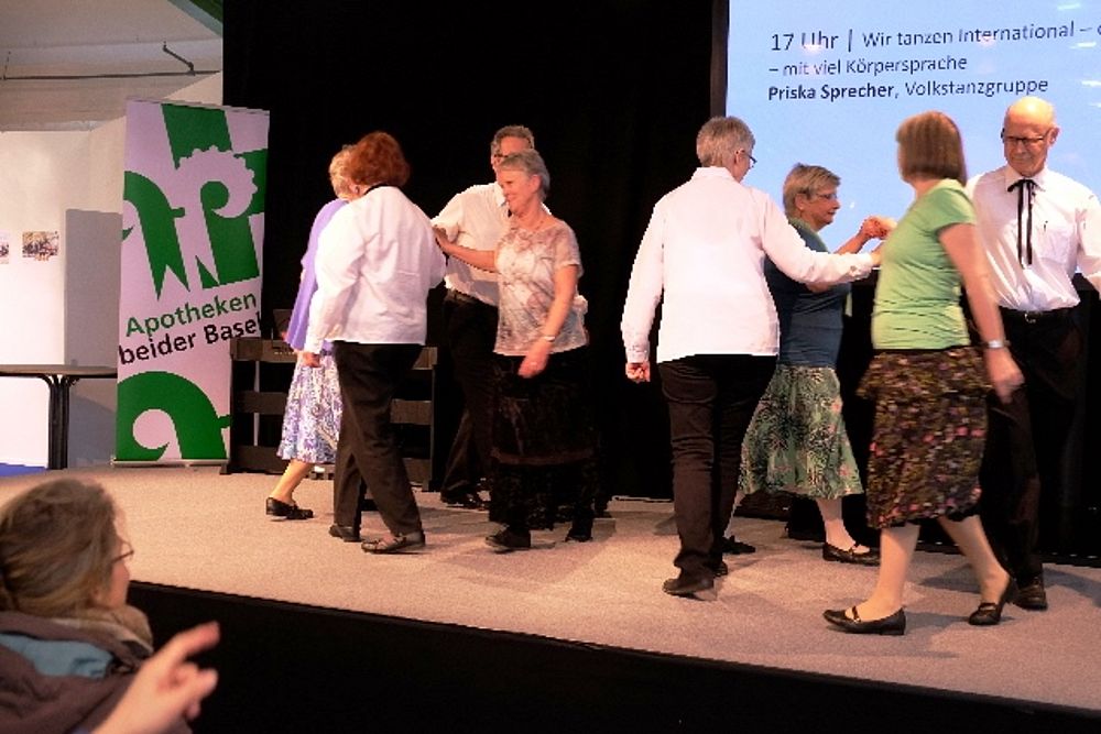 8 Mitglieder und 1 Gast aus dem VTK Basel zeigten eine bunte Vielfalt an internationalen und Schweizer Volkstänzen. Angefangen mit dem Radetzky, folgten als Kreistanz der Corrido aus Mexiko, die Aston Polka aus England (Tanz mit einer Gasse) und dann wechselten wir mit dem Rägeschottisch in die Schweiz. Obwohl nur 4 Tanzpaare erwies sich die Bühne als zu klein und die Tanzfiguren kamen vor dem zahlreichen Publikum nicht zur Geltung. Wir intervenierten daraufhin bei den Verantwortlichen und konnten unseren zweiten Auftritt 6 Tage später vor der Bühne durchführen. Die Stühle wurden zurück-geschoben zu einem Halbkreis. Und das kam dann allen Tänzen zugute.