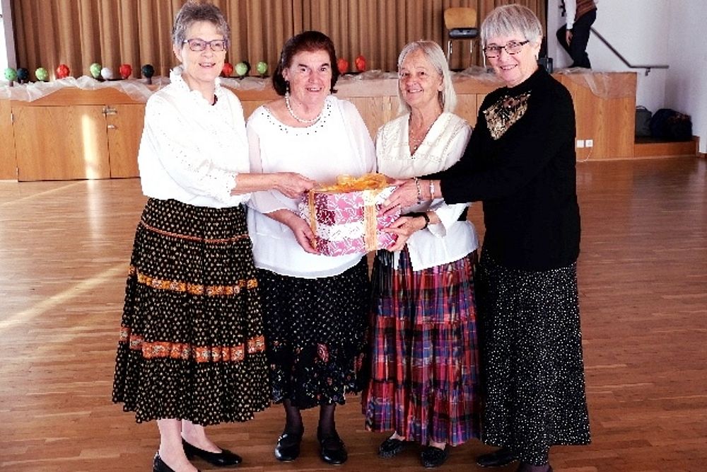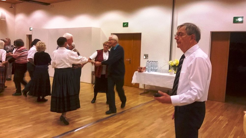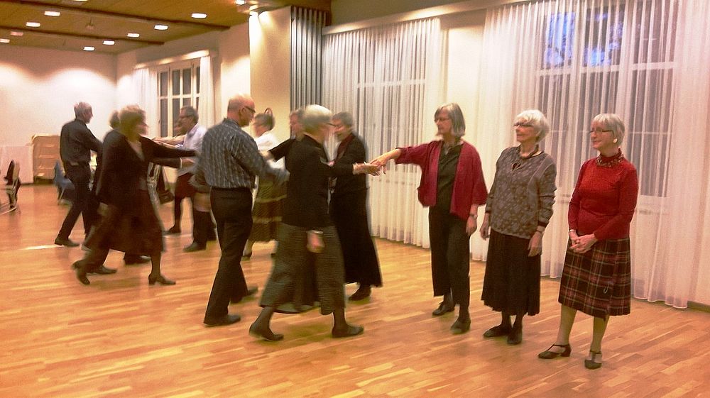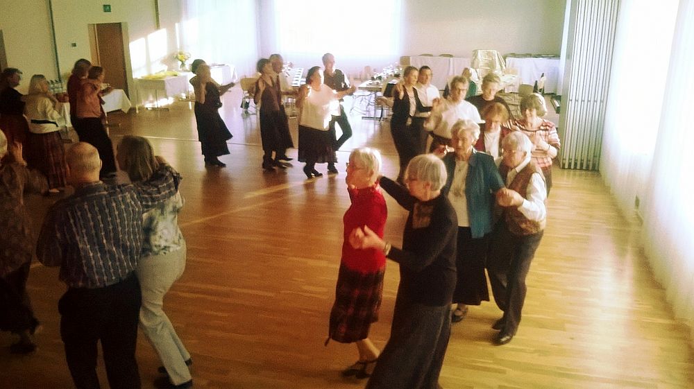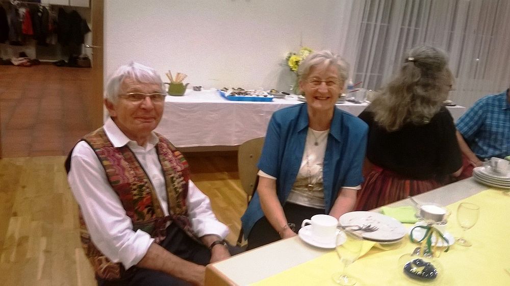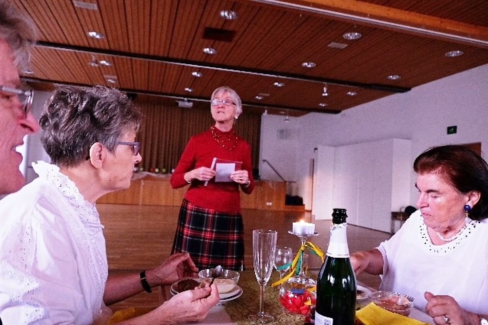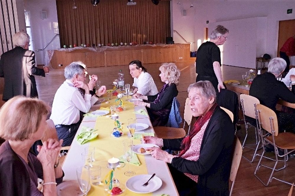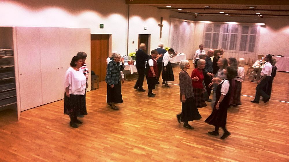 Wir vier 70er resp. noch nicht ganz 70er, Marianne Graf-Grether, Marie-Louise Wigger, Marianne Barth und Andrea Weber, luden zu einem gemütlichen Tanznachmittag ins Pfarreiheim St. Niklaus ein. Mit einem Cüpli begrüssten wir unsere Gäste und anschliessend wechselten sich Tanzen und heiteres Beisammensein ab. Das von den Jubilarinnen zusammengestellte Buffet fand regen Anklang. Zwischendurch wurden wir mit kleinen Darbietungen überrascht. So beispielsweise von Priska Sprecher und Elisabeth Briner, die uns mit dem gemeinsam auf dem Klavier gespielten Geburtstagsmarsch von Robert Schumann nach dem Apéro in den Saal baten oder von Eugen Schaub, der ein Tondokument von 1996 abspielte, in welchem Marianne Graf-Grether das Wort zum neuen Tag sprach mit dem Thema Tanzen. Lotti Herrmann überbrachte die Glückwünsche des Volkstanzkreises Basel.